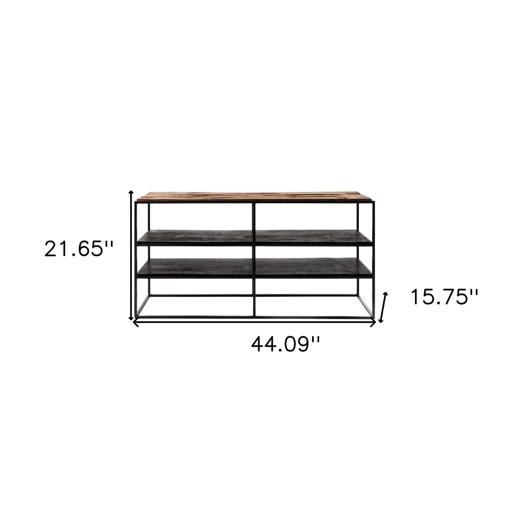 With it's clean cut lines and versatile function, the 44" Modern Rustic Wood and Black Metal Open TV Stand is a geometric beauty. Clevery handcrafted from a combination of solid and reclaimed wood, the TV stand is your one stop shop for all your entertainment storage needs. The two wide open shelving systems visually depicts four shelves with breaks in between the iron frame. A black washed out paint with a rustic finish covers the two shelves while the top of the stand provides a beautiful contrast with the warmer and deeper color of the wood. The entire stand is built on a slim iron framework which portrays an industrial chic unit. An ideal stand that is suited for every home and can be used for TV or any other shelving and storage display needs you may have. 21.65" x 44.09" x 15.75"