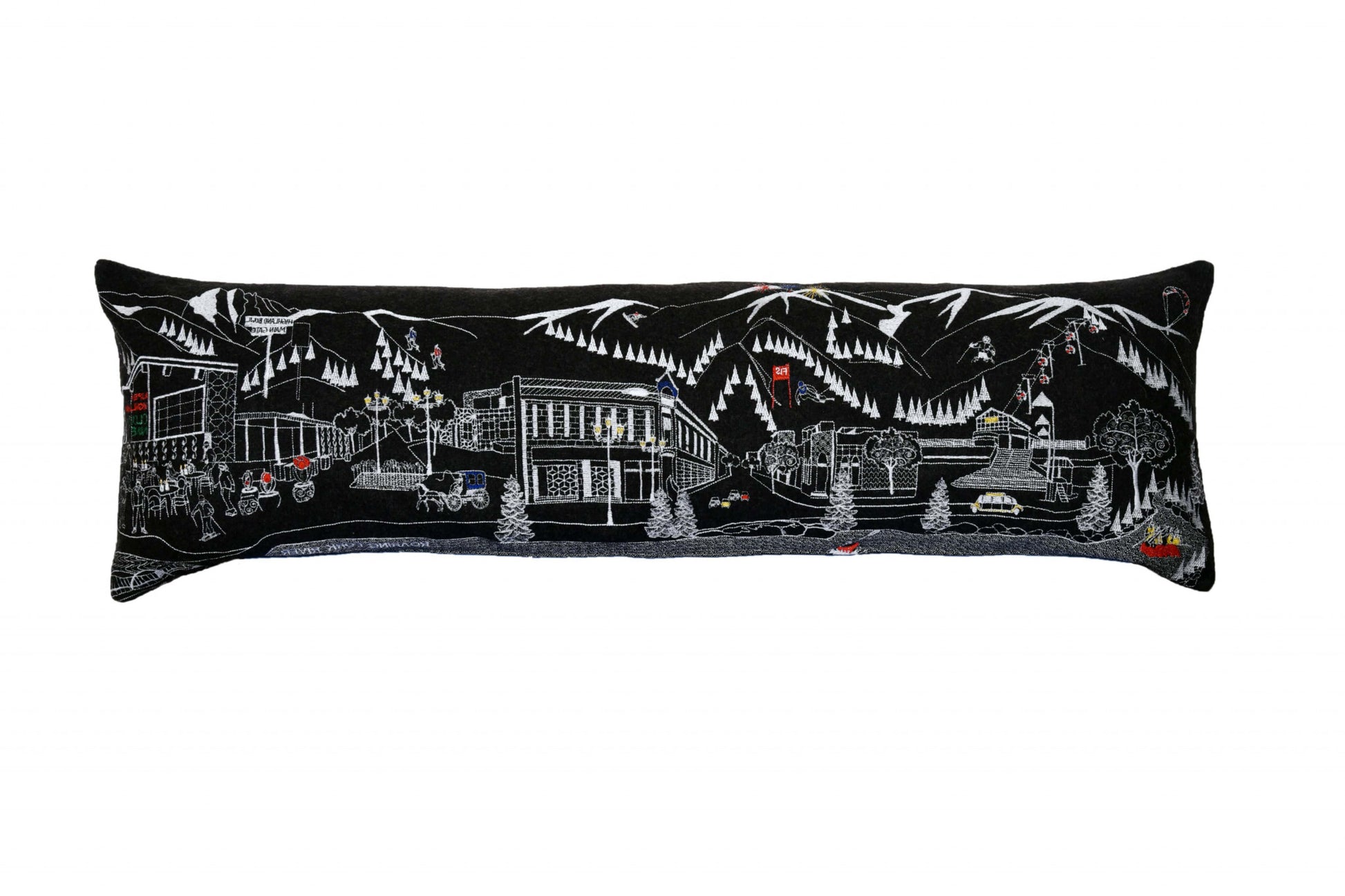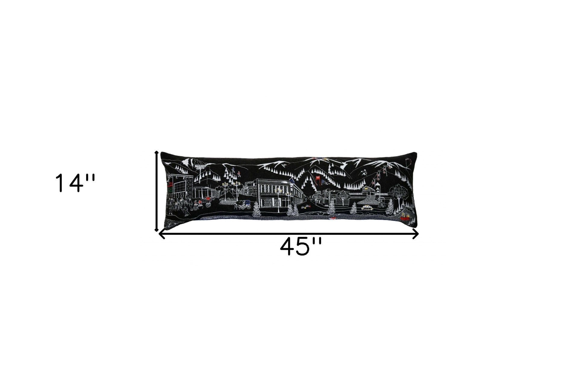 Showcase this famous city, with our Black Color Aspen Nighttime Skyline King Size Lumbar Decorative Pillow. The Nighttime view of Aspen from the Roaring Fork River is picture perfect. The gorgeous art features many famous landmarks and references for this destination city, rendering a modern whimsical way to bring this iconic cityscape to life. Made of a wool/nylon blend, this high quality stitched decorative pillow features white on black embroidered artwork mixed with pops of color that highlight important and recognizable icons from this popular Colorado city known for its snow sports, fine dining, and resorts. This pillow makes a great gift, decorative accent and conversation piece. 4" x 45" x 14"
