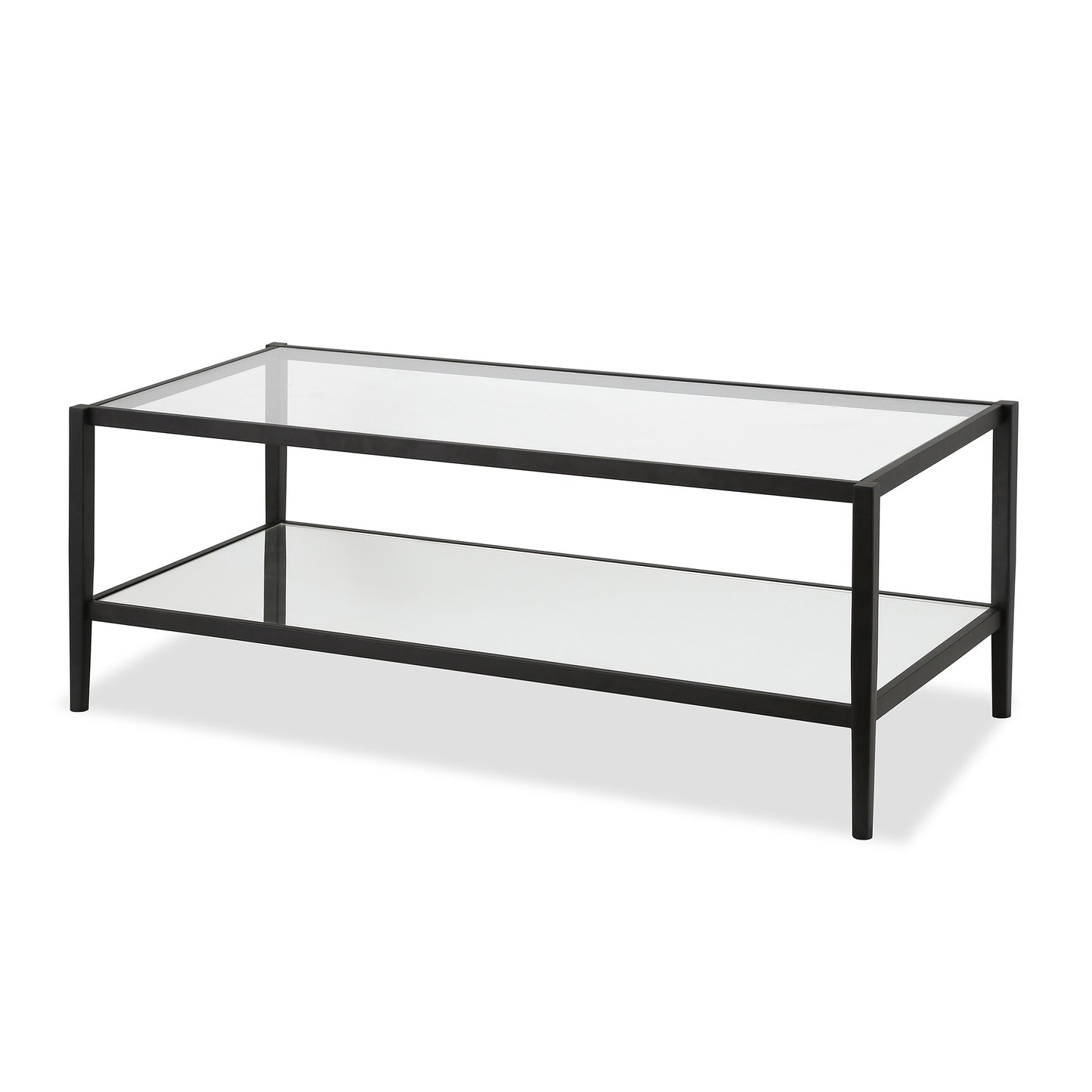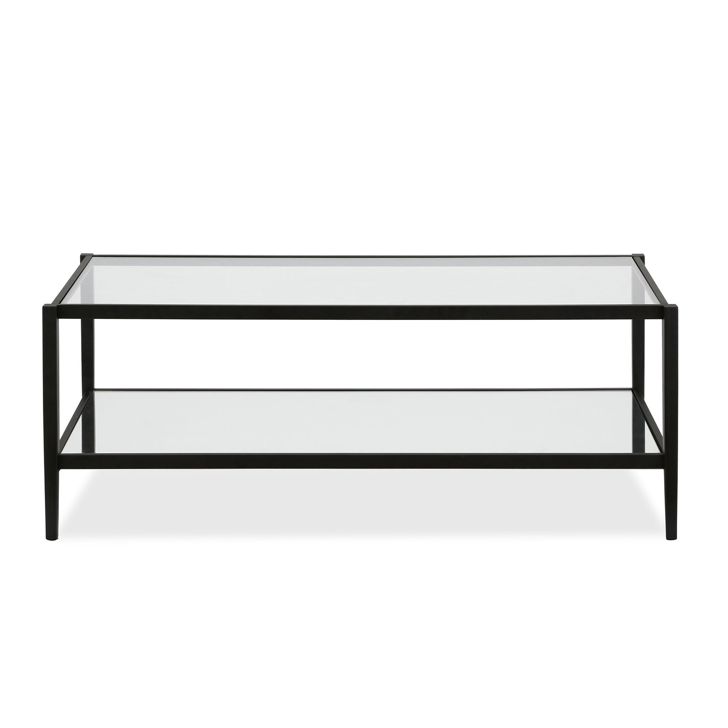 Stylish and super sturdy, the 45-inch black glass and steel coffee table with shelf is an amazingly good looking coffee table that will compliment your living room. A solid black steel frame is finished off with a matching black glass top, giving this table a chic monotone look. Includes a single shelf for handy storage or display space. This rectangular table is an classic yet updated way to accent your room. If you're looking for something that can fit into a living area, bedroom, or office, this coffee table is for you. This coffee table is the sturdy, reliable and stylish answer to your living room needs. 17-inch H x 45-inch W x 20-inch D