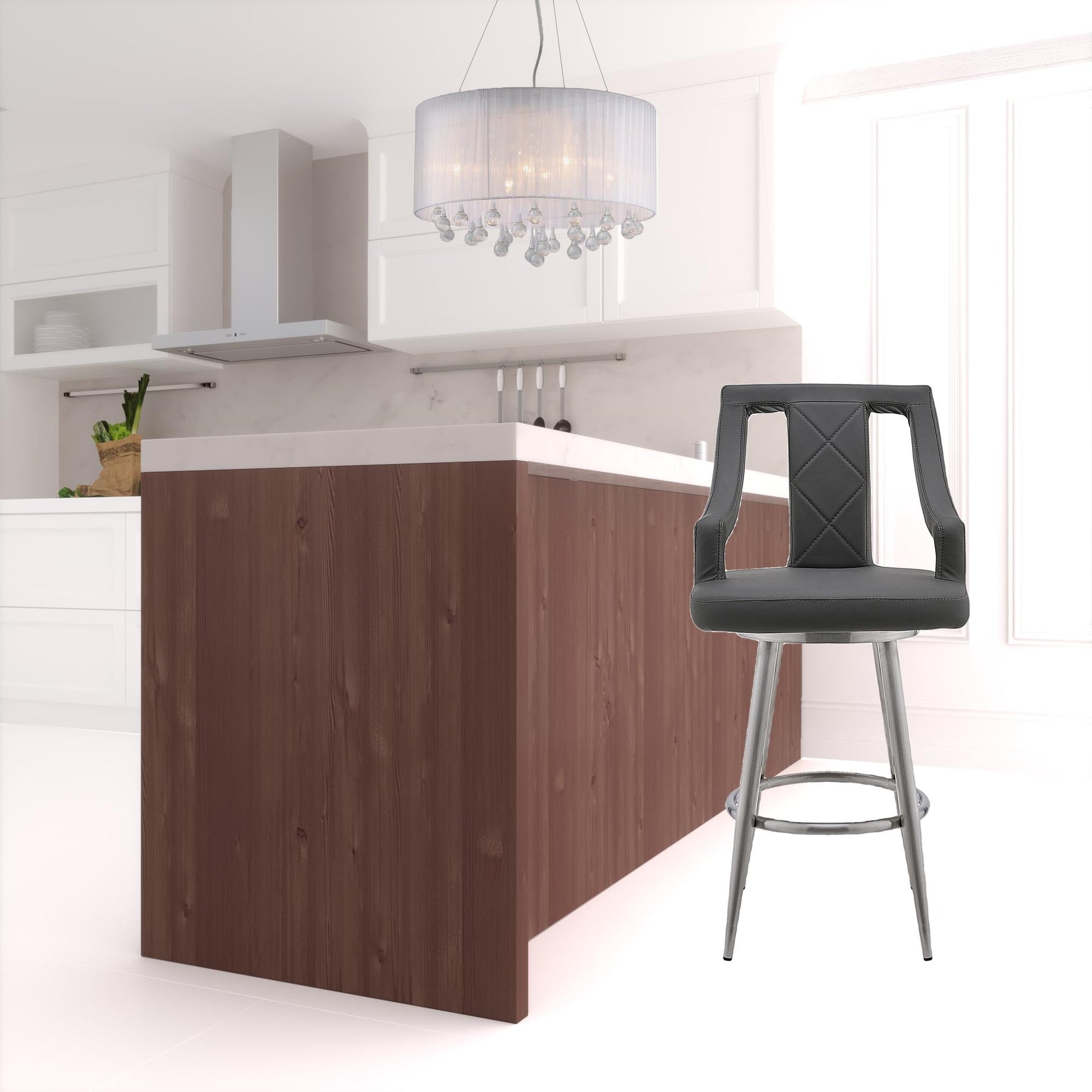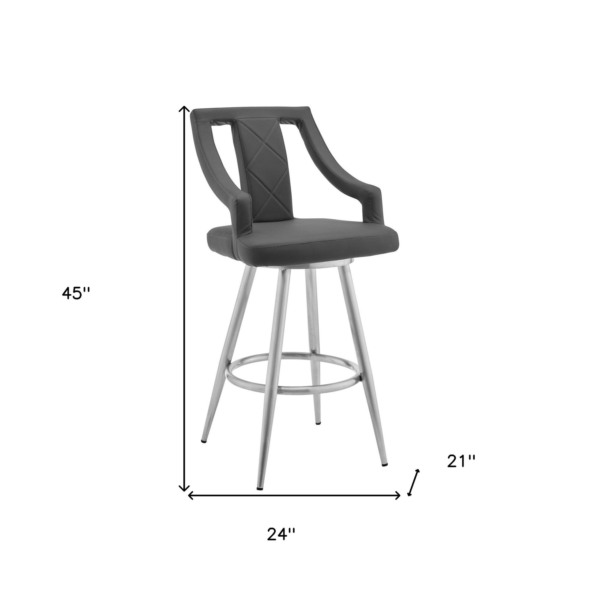 The perfect way to add some extra seating in your home, this 45" gray faux leather and iron swivel bar height chair will elevate the look and vibe of your room. A brushed stainless steel iron frame is finished off with a gray faux leather seat that is the epitome of quality construction and design. A full back mixed with a round shaped seat design makes this chair both comfortable and fashionable. The armchair design gives you a great place to comfortably rest your arms. 45" H x 21" W x 24" D