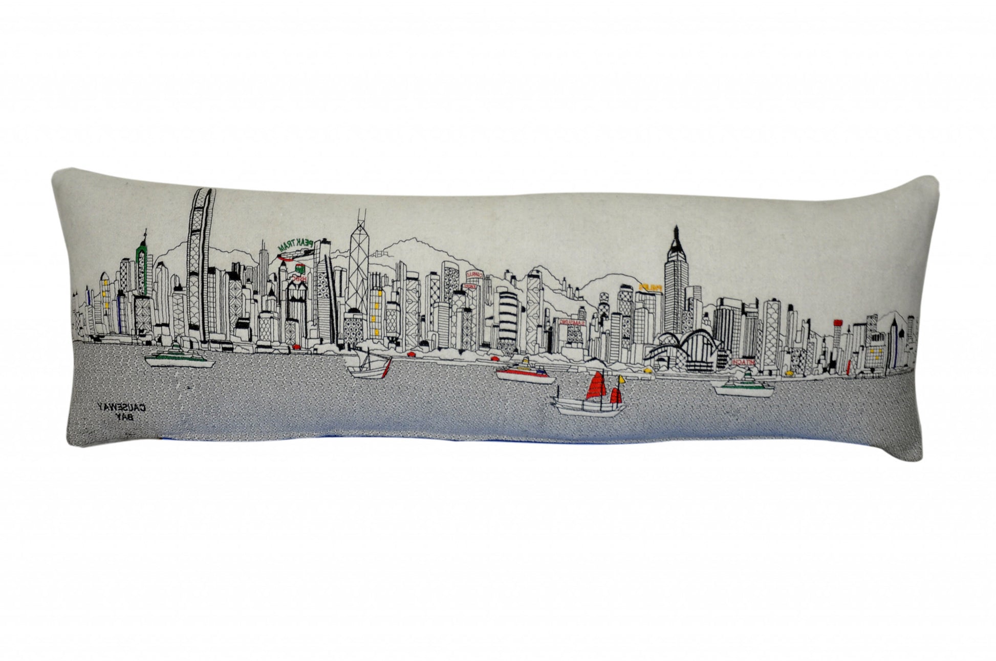 Showcase one of the most famous cities in the world with our Cream Color Hong Kong Daylight Skyline King Size Lumbar Decorative Pillow. This daylight view of Hong Kong from Causeway Bay, is a stunning way to represent one of the most important and travelled cities in the world. The gorgeous art features famous architecture and landmarks rendering a modern whimsical way to bring this iconic cityscape to life. Made of a wool/nylon blend, this high quality stitched decorative pillow features black on white embroidered artwork mixed with pops of color that highlight important and recognizable icons from this fabulous city. This pillow makes a great gift, decorative accent and conversation piece. 4" x 45" x 14"