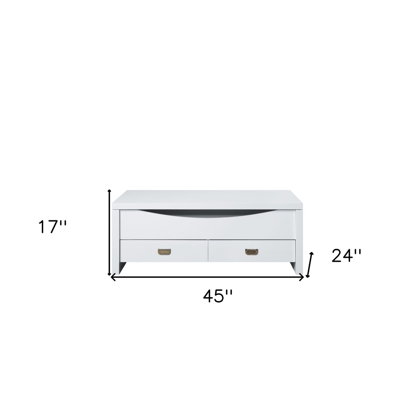 This good looking 45" white manufactured wood rectangular lift top coffee table with two drawers is sure to inspire compliments no matter where it sits. This table features quality construction from manufactured wood and an updated monotone color scheme with white as the main color on both the top and the base. This classic rectangular table will be a great accent in any room It has a fresh design that will definitely breathe some fresh air into your interior. This coffee table is the sturdy, reliable and stylish answer to your living room needs. 17" H x 45" W x 24" D