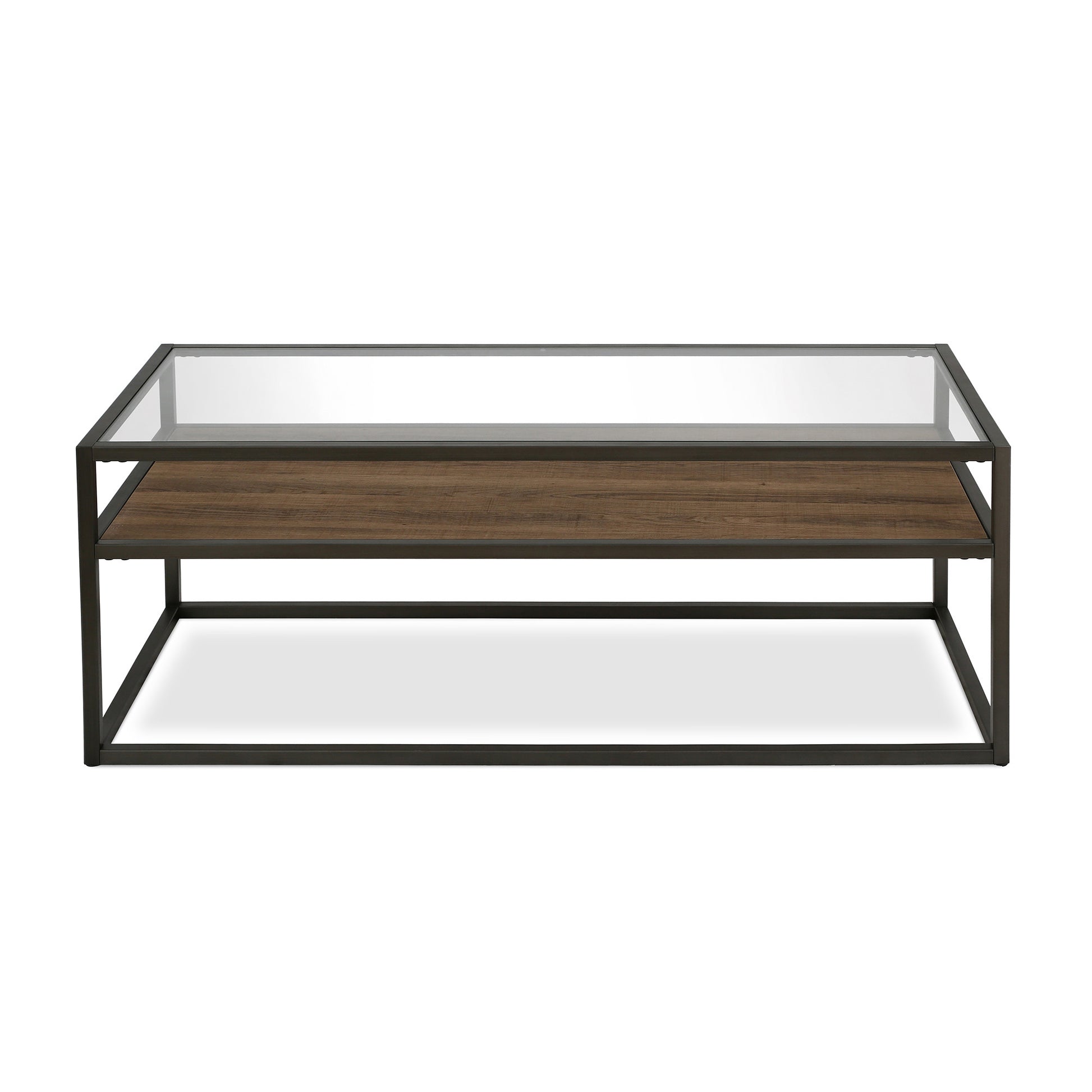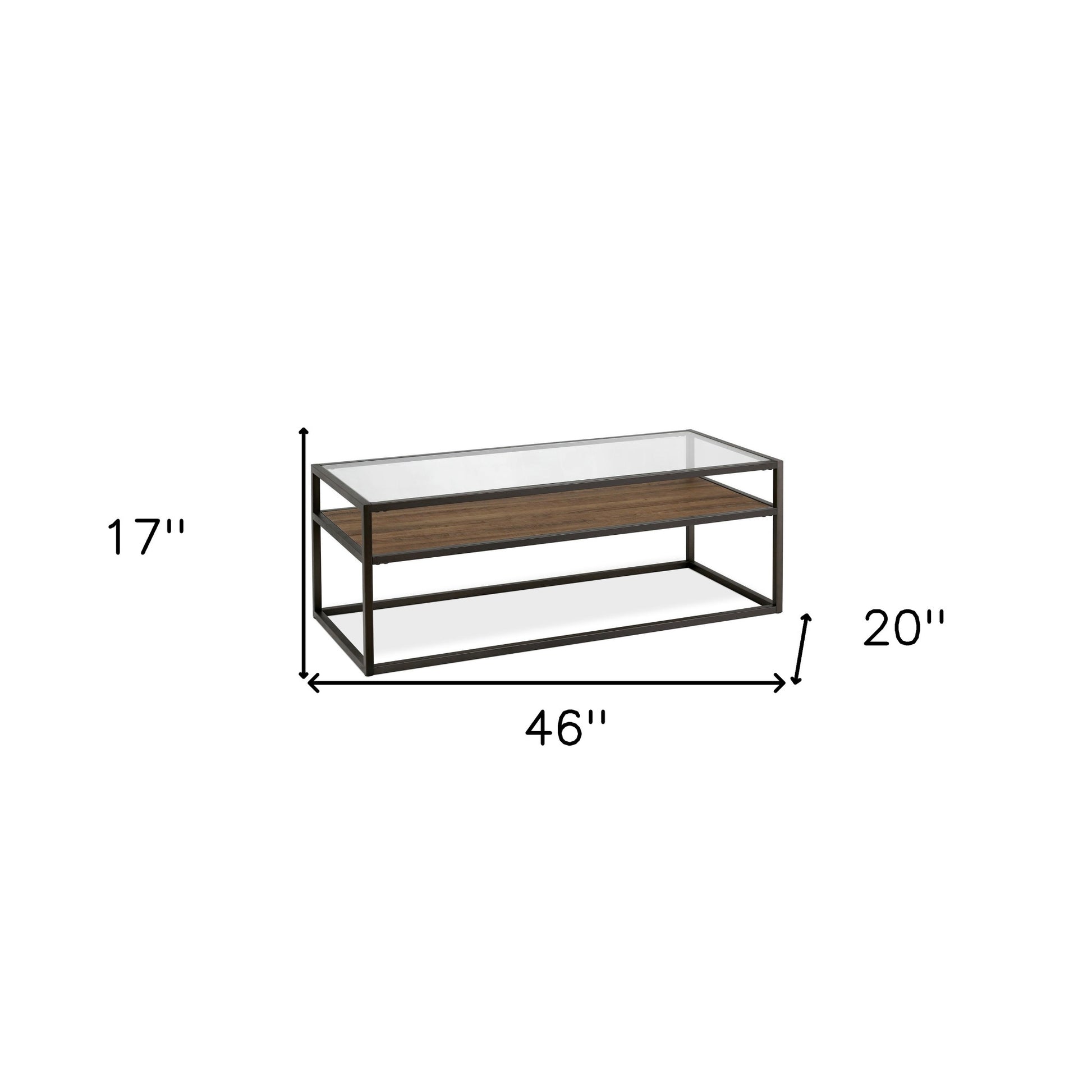 Add handsome, fashionable design to your living space with this 46-inch black glass and steel coffee table with shelf. A solid black steel frame is finished off with a matching black glass top, giving this table a chic monotone look. Includes a single shelf for handy storage or display space. This rectangular table is an classic yet updated way to accent your room. It has a fresh design that will definitely breathe some fresh air into your interior. This coffee table is the sturdy, reliable and stylish answer to your living room needs. 17-inch H x 46-inch W x 20-inch D