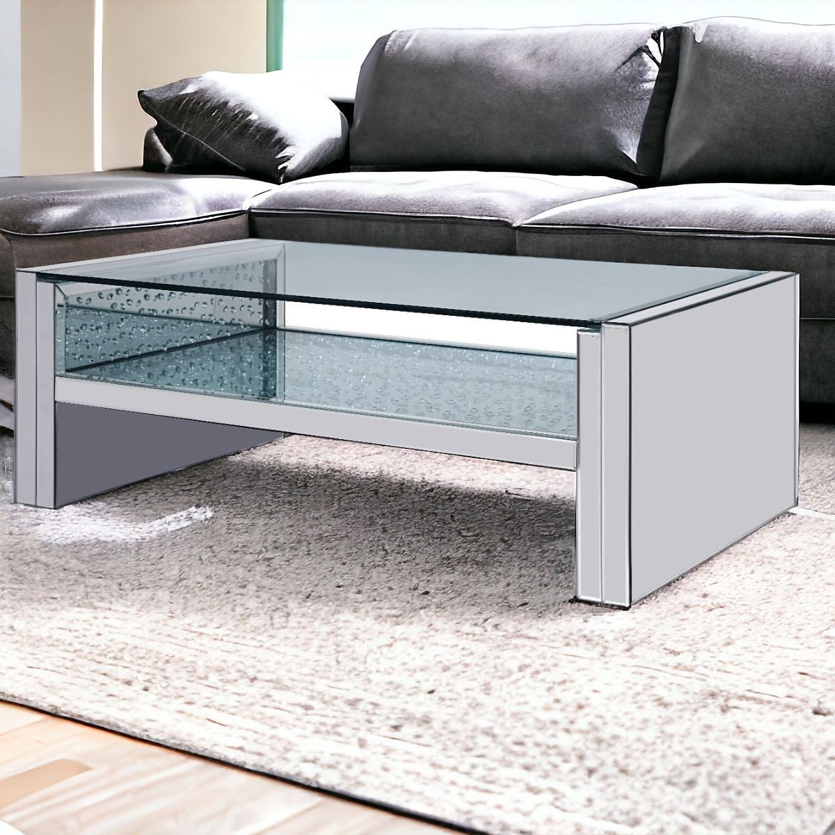 47" Clear And Silver Glass Mirrored Coffee Table With Shelf