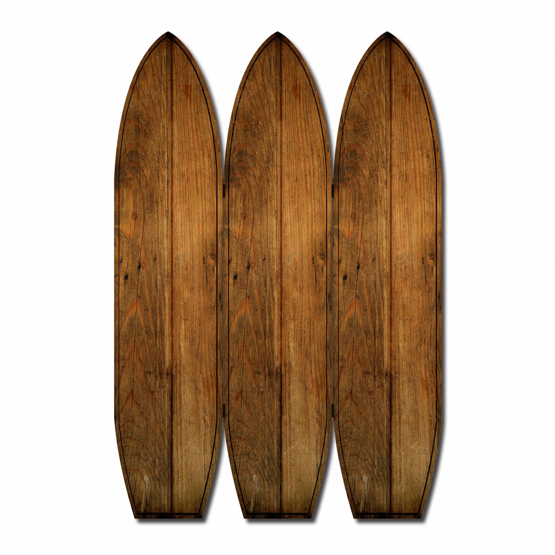 our surfboard screen is a uniquely designed room divider portraying coastal brilliance. create with it a more closeted and confidential space for yourself or for other purposes. it also doubles as a charming decorative accent to enhance the decor in any living house. this panel room divider is carved from sturdy wood materials and painted in dazzling brown for very alluring effects. an image of 3 surfboards hinged together forms the shape of this sunscreen and each side features a different image to suit your preference. its available in the size of 47 by 1 by 71.
