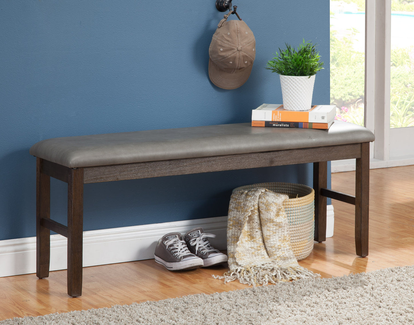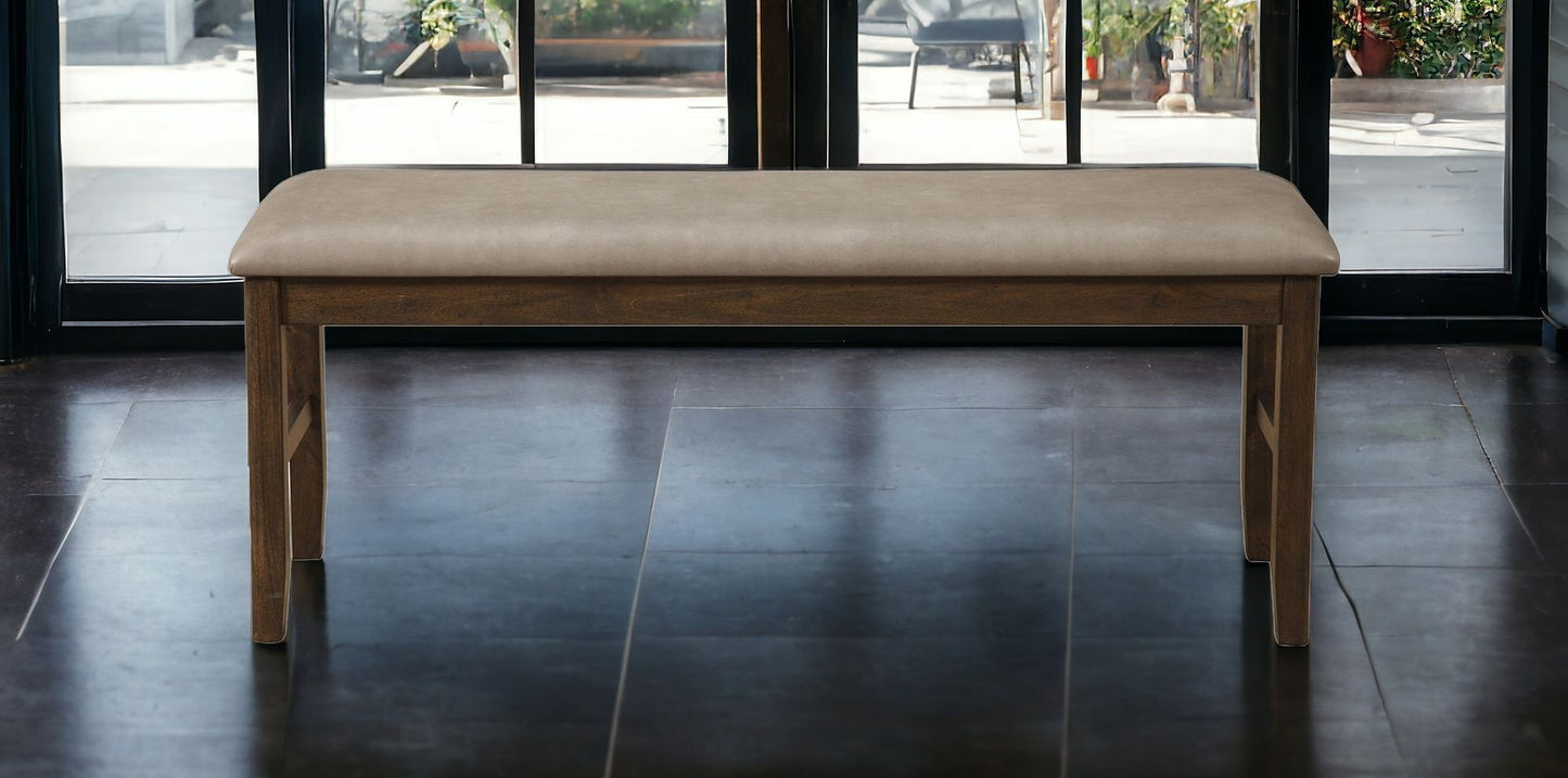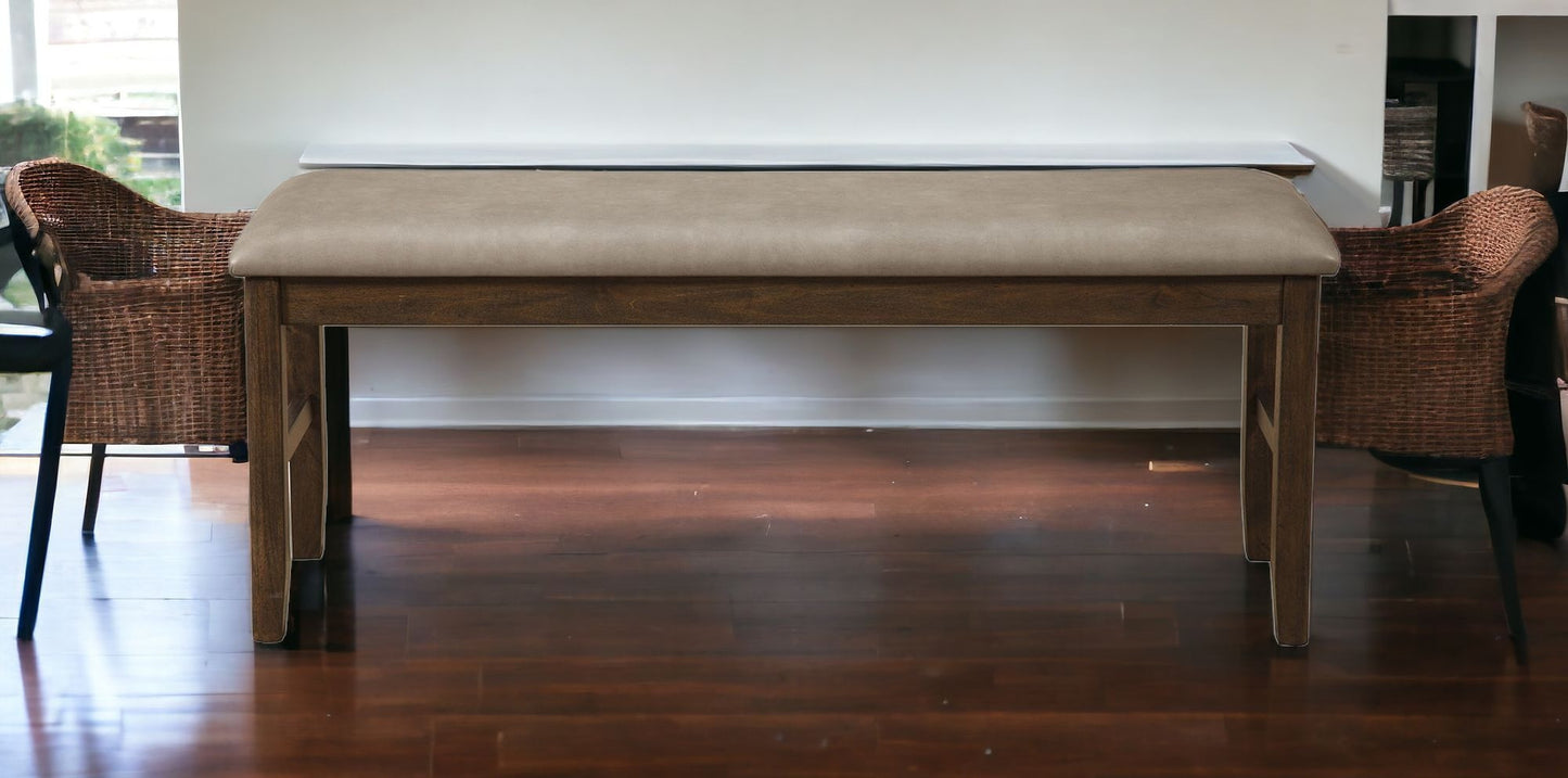 Distinctive in style the 49-inch tan and dark brown faux leather distressed upholstery dining bench radiates a versatile charm. A dark brown solid wood frame is finished off with a tan upholstery seat that is the epitomy of quality construction and design. The purposefully distressed finish gives this versatile bench an authentically rustic feel. Expertly upholstered with padding and soft faux leather in a no pattern and not solid color pattern, this bench is as comfortable as it is good looking. Add this bench to your kitchen or dining room for convenient seating at the table. Benches don't have to be unsightly. Increase your seating and the fashion quotient of your room all at the same time with this hard wearing, versatile, and good looking bench. 19-inch H x 48.5-inch W x 14-inch D