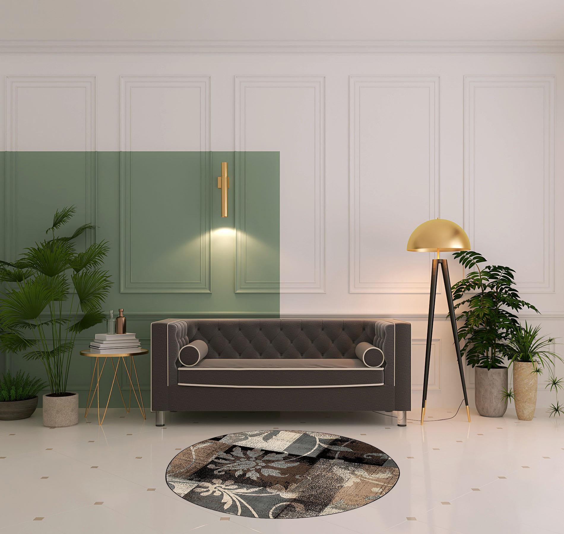 This 5' beige and black round floral power loom distressed area rug, is a great way to add warmth to a room. This geometric round shaped rug features a floral pattern in beige and black that combines a good looking print with a unique and updated shape. The mix of shape, color, and design gives this rug refreshing visual interest. Made in Turkey, this rug offers high quality combined with good looking designer sensibilities. Ideal for spaces with kids and pets, this rug is stain resistant to help repel stains and spilled liquids. Place this area rug against a hardwood or tile floor and it will enliven your living space with style and sophistication. 0.31" H x 60" W x 60" D