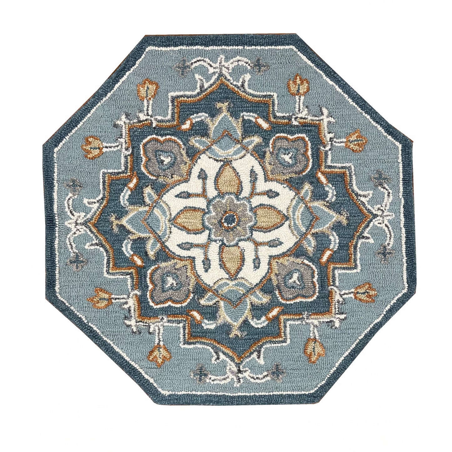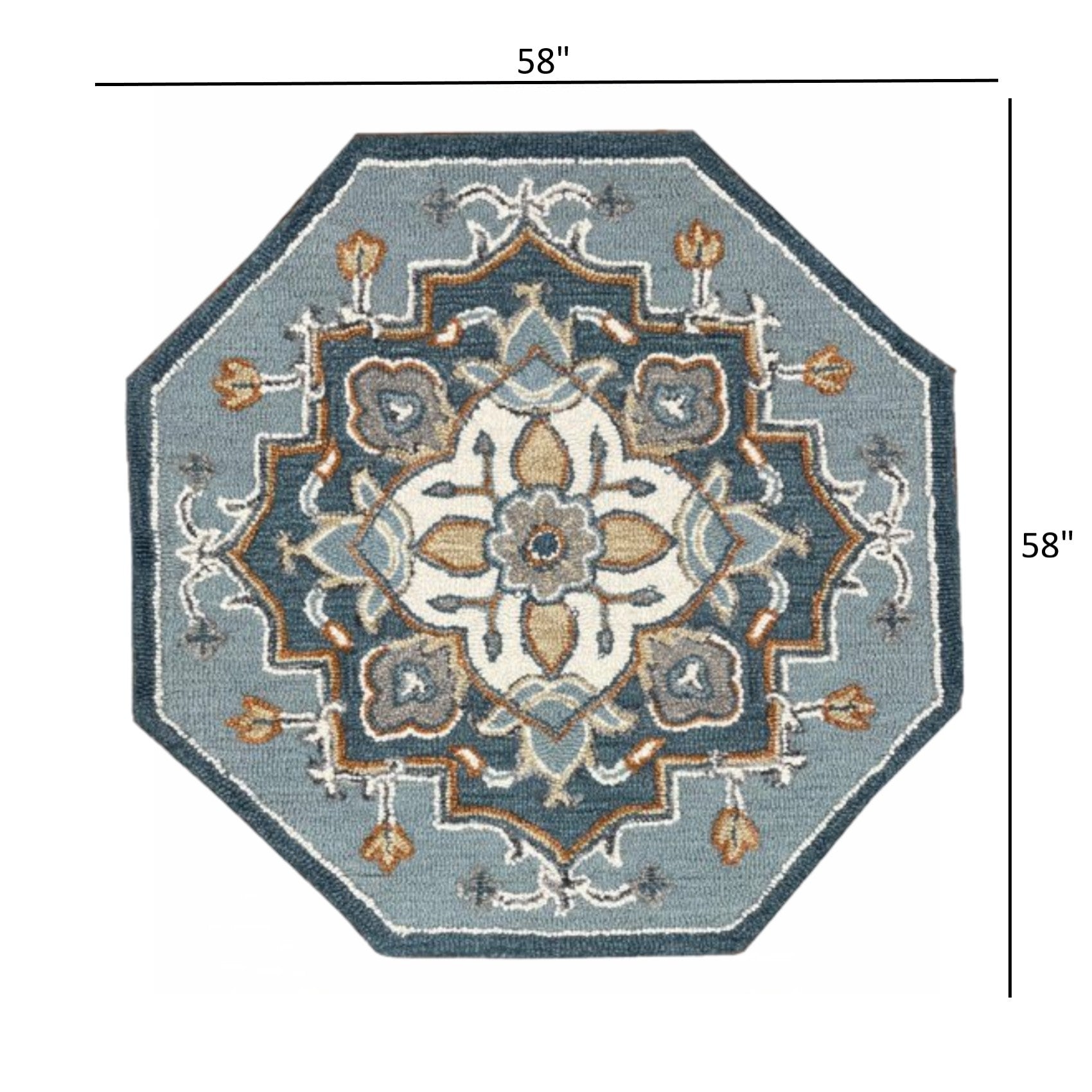 Add some artistry to your room with this 5' blue and ivory round wool hand hooked handmade area rug. Place this area rug against a hardwood or tile floor and it will enliven your living space with style and sophistication. 0.5" H x 58" W x 58" D