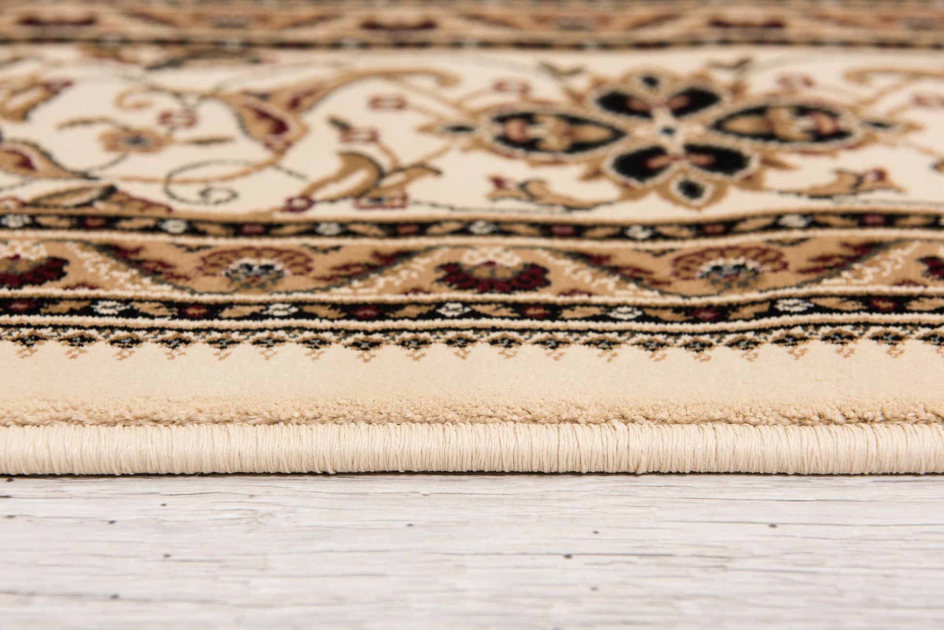Expressing an aristocratic essence in its design elements, this Round Cream Floral Medallion Area Rug upholds a neutral color palette to blend well in any traditional setting. The Persian-inspired floral vines in shades of tan are highlighted on a cream-toned oblong midsection with an intricately decorative border all around. Balancing between fashion and function, this rug is made in Turkey with 100% olefin heatset fibers to withstand extreme wear and tear of high traffic areas while resisting stains to retain its lustrous sheen for years to come. The smooth and shiny surface texture is due to the low pile construction that offers a soft underfoot, making it an excellent choice for your bedroom, living room, dining area, or hallway. Accentuate a classic edge to your living space with this warm-toned round area rug on the floor. 63"