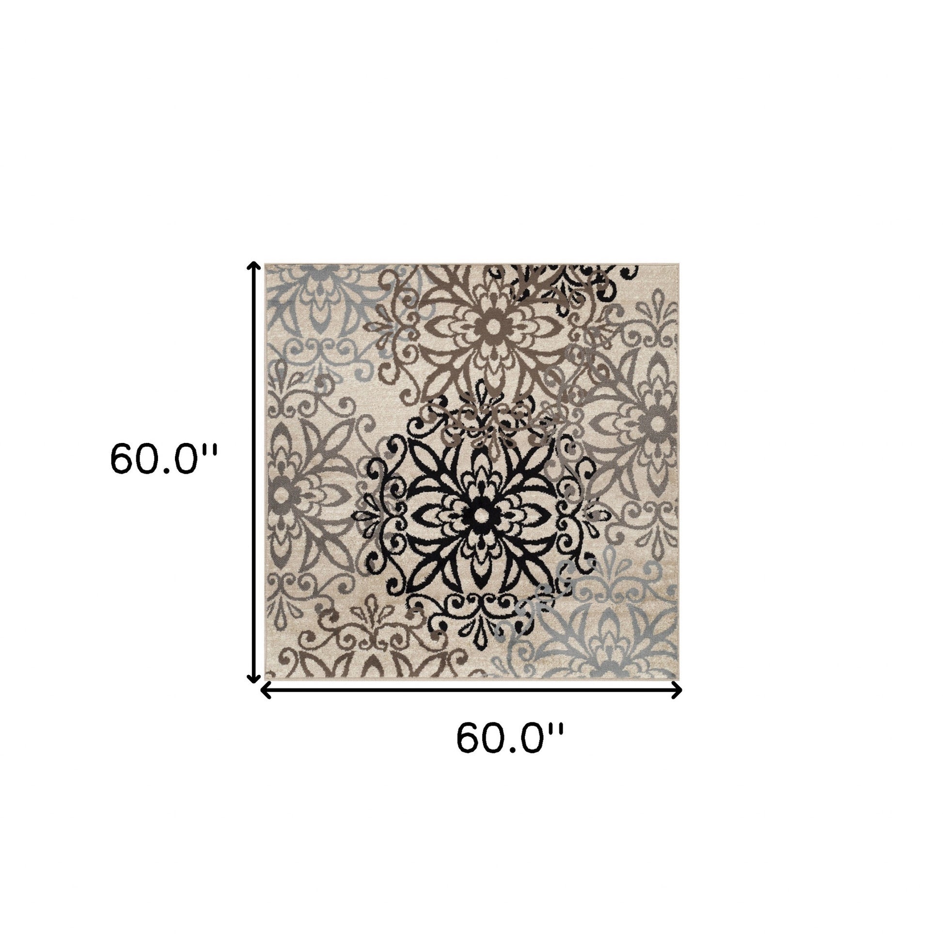 5' Square Tan Gray And Black Square Floral Medallion Stain Resistant Area Rug