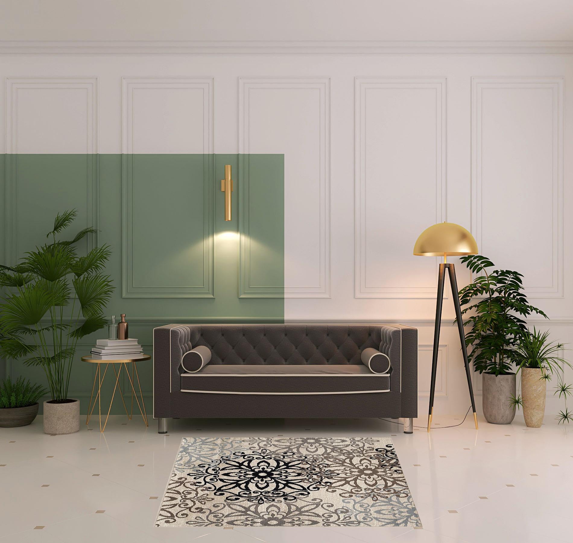 This 5' square tan gray and black square floral medallion stain resistant area rug, is a great way to add warmth to a room. This geometric square shaped rug features a medallion pattern in tan gray and black that combines a good looking print with a unique and updated shape. The mix of shape, color, and design gives this rug refreshing visual interest. This superior Turkish rug represents the highest quality and is built to last. Ideal for spaces with kids and pets, this rug is stain resistant to help repel stains and spilled liquids. Place this area rug against a hardwood or tile floor and it will enliven your living space with style and sophistication. 0.31" H x 60" W x 60" D