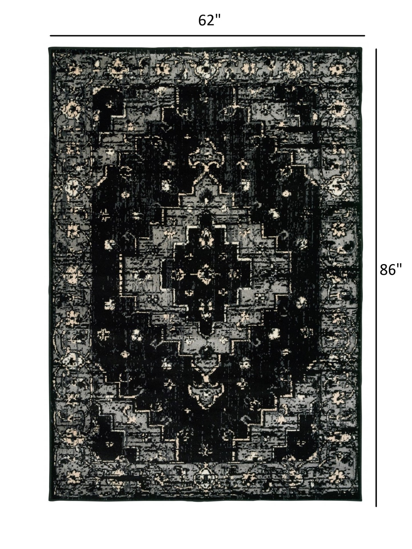 Express your love for a bold and deep interior with this elegant Black Medallion Oriental Area Rug that will layer the floors with a blend of traditional extravagance and modern elegance. The alluring gray-toned medallion is framed with a distressed border on a raven black backdrop to grab attention and stand out in your living space. Ideal for indoor areas with heavy foot traffic, this rug is made in Turkey with sturdy olefin fibers to ensure durability, stain resistance, and easy cleaning. The medium pile construction offers a smooth surface texture with a lustrous sheen that looks luxurious and feels plush under the feet. This gorgeous area rug will add depth and style to your living space and earn you numerous compliments from the guests. 62” x 86” x 0.4”
