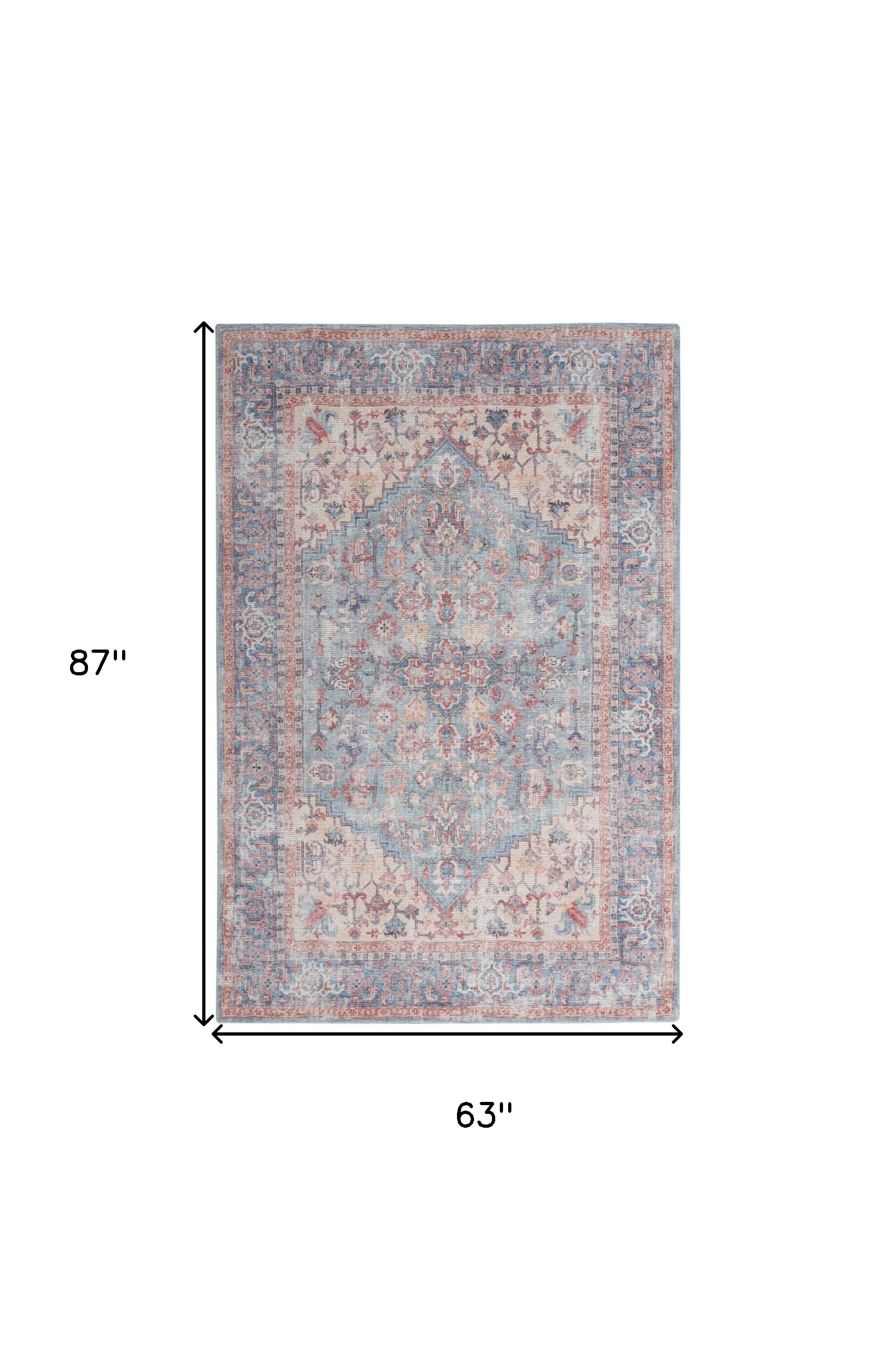 5' X 7' Blue Oriental Power Loom Distressed Washable Area Rug