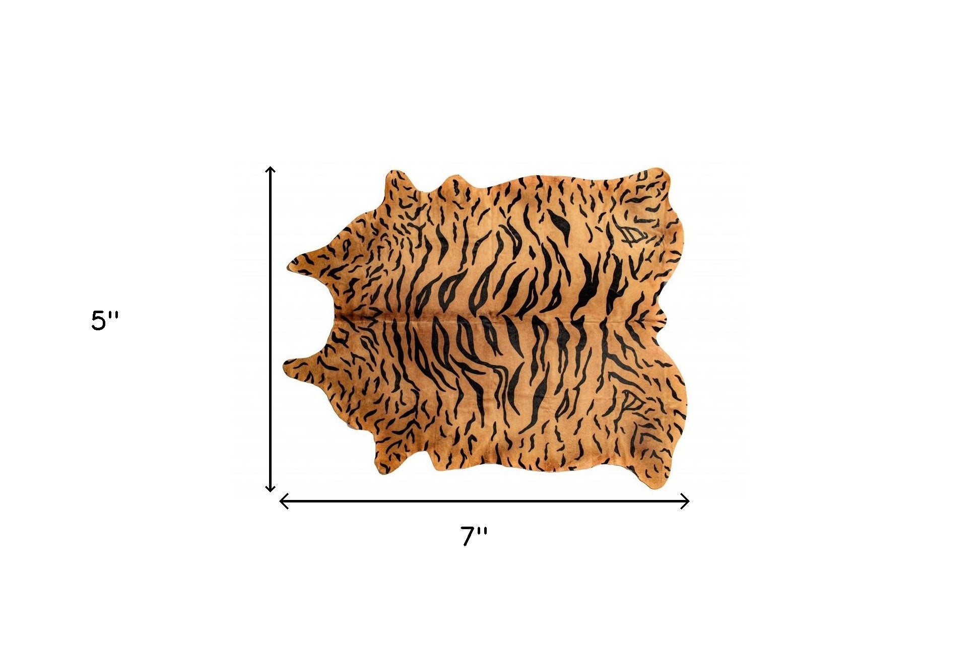 This 5' x 7' natural brown and black cowhide animal print handmade area rug, is a great way to add warmth to a room. This novelty shape rug in natural brown and black features a animal print that combines a good looking print with a unique shape. The mix of shape, color, and design gives this rug refreshing visual interest. Handcrafted by skilled artisans, this natural cowhide rug is genuine and unique. No two will be exactly alike. Place this area rug against a hardwood or tile floor and it will enliven your living space with style and sophistication. 0.25" H x 5" W x 7" D