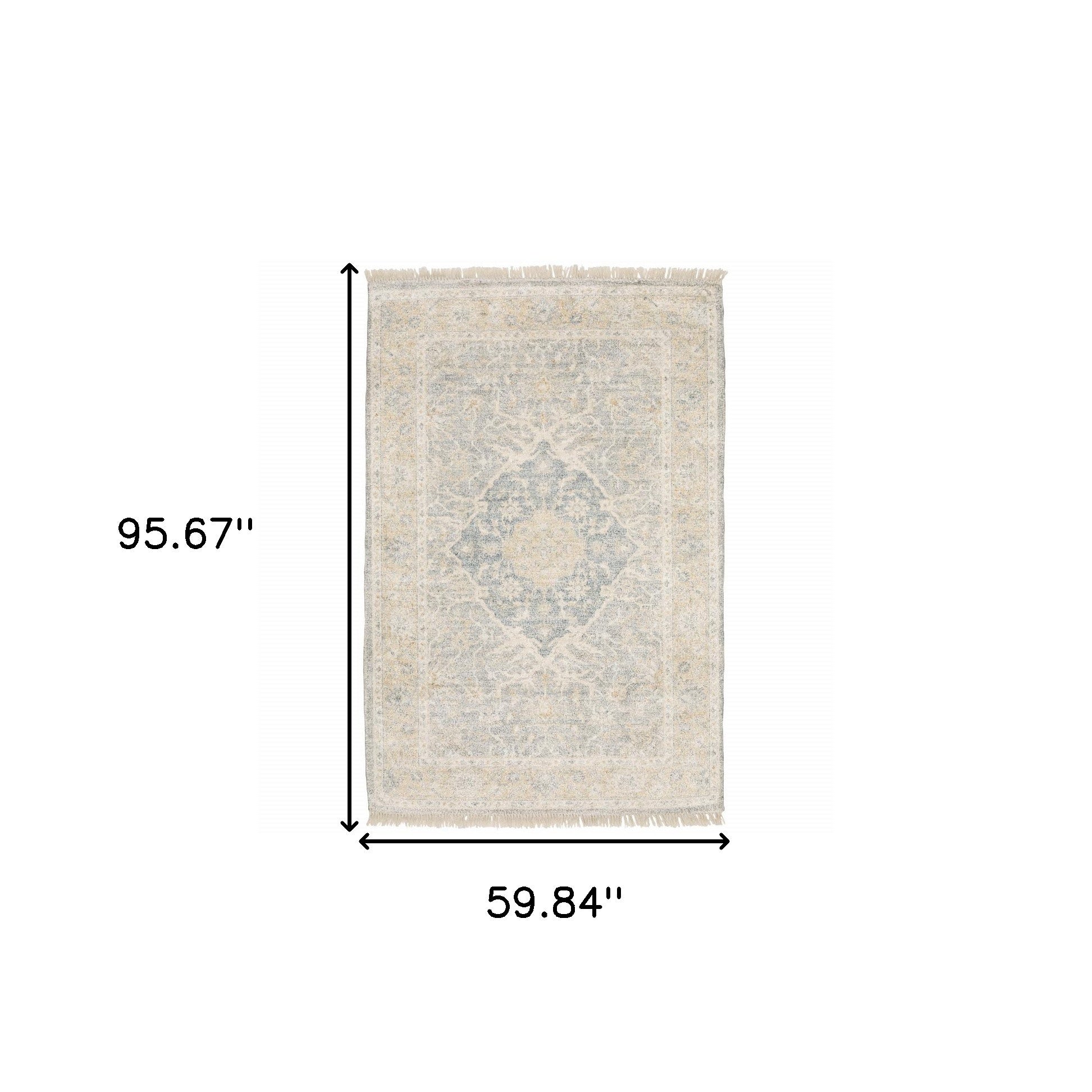 5' X 8' Grey And Beige Oriental Hand Loomed Stain Resistant Area Rug With Fringe