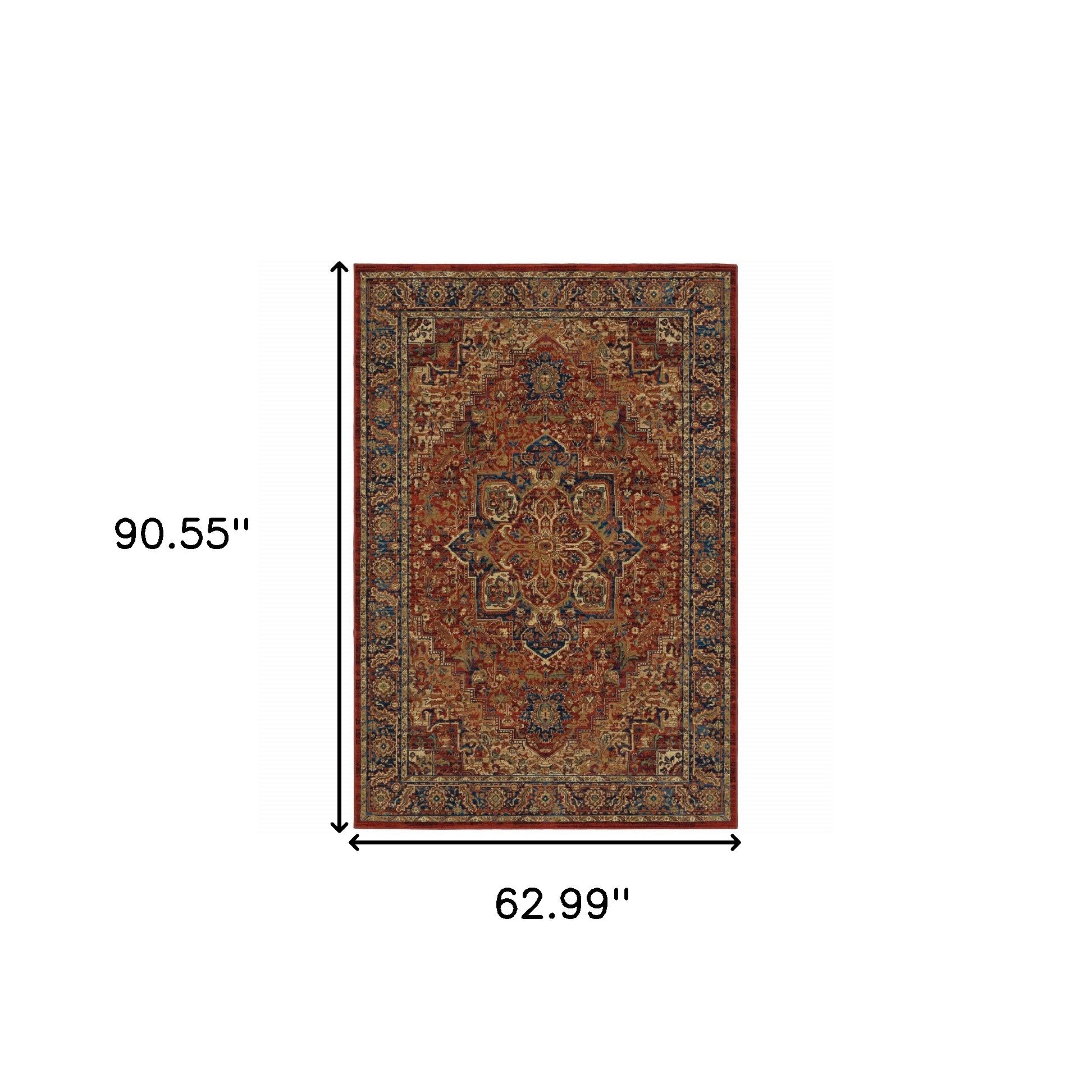 5' X 8' Red And Blue Oriental Power Loom Stain Resistant Area Rug