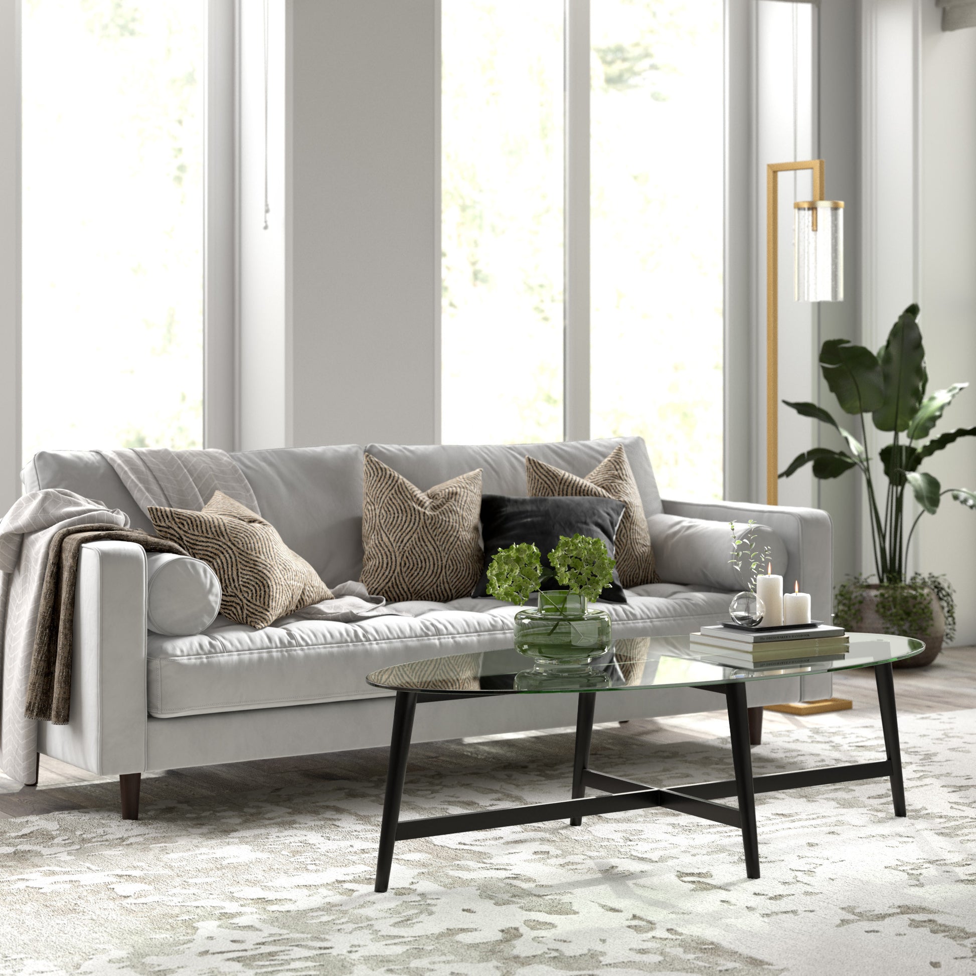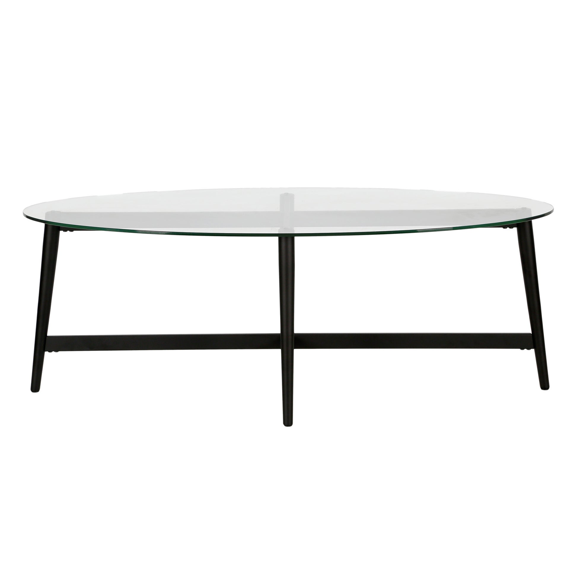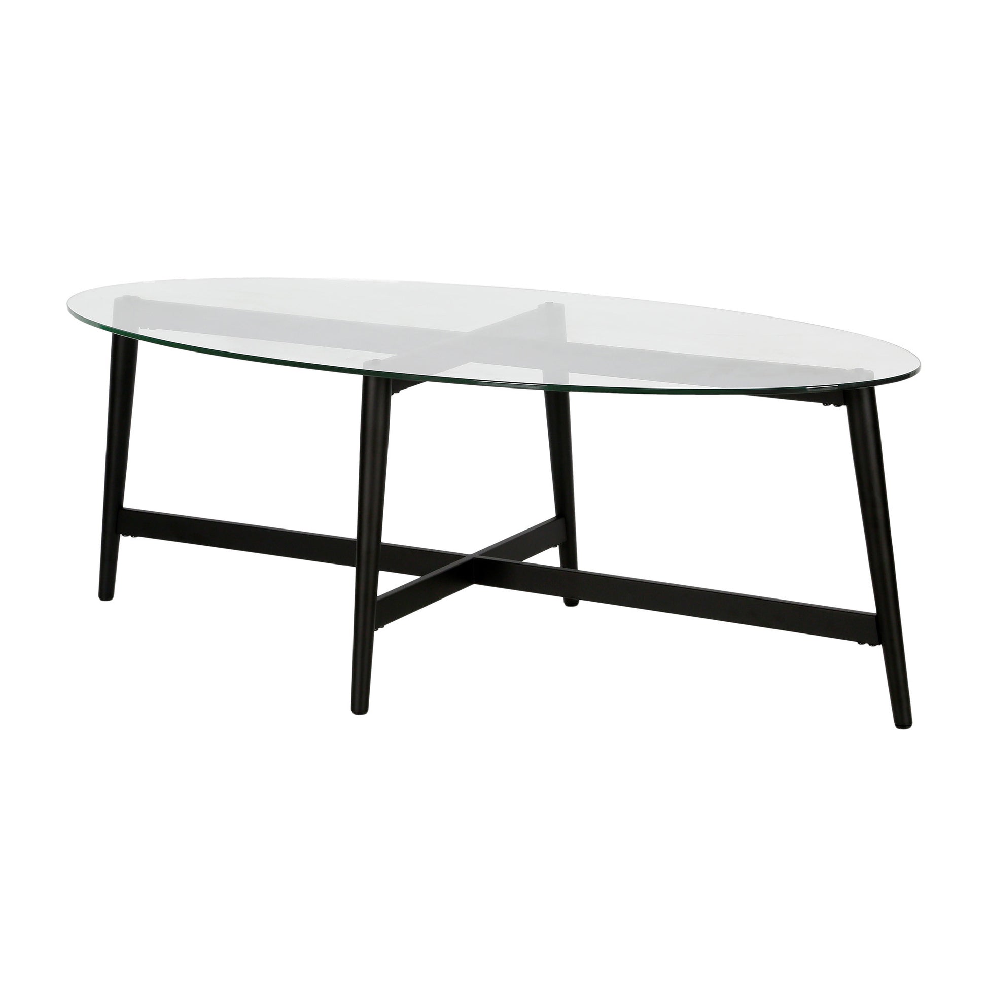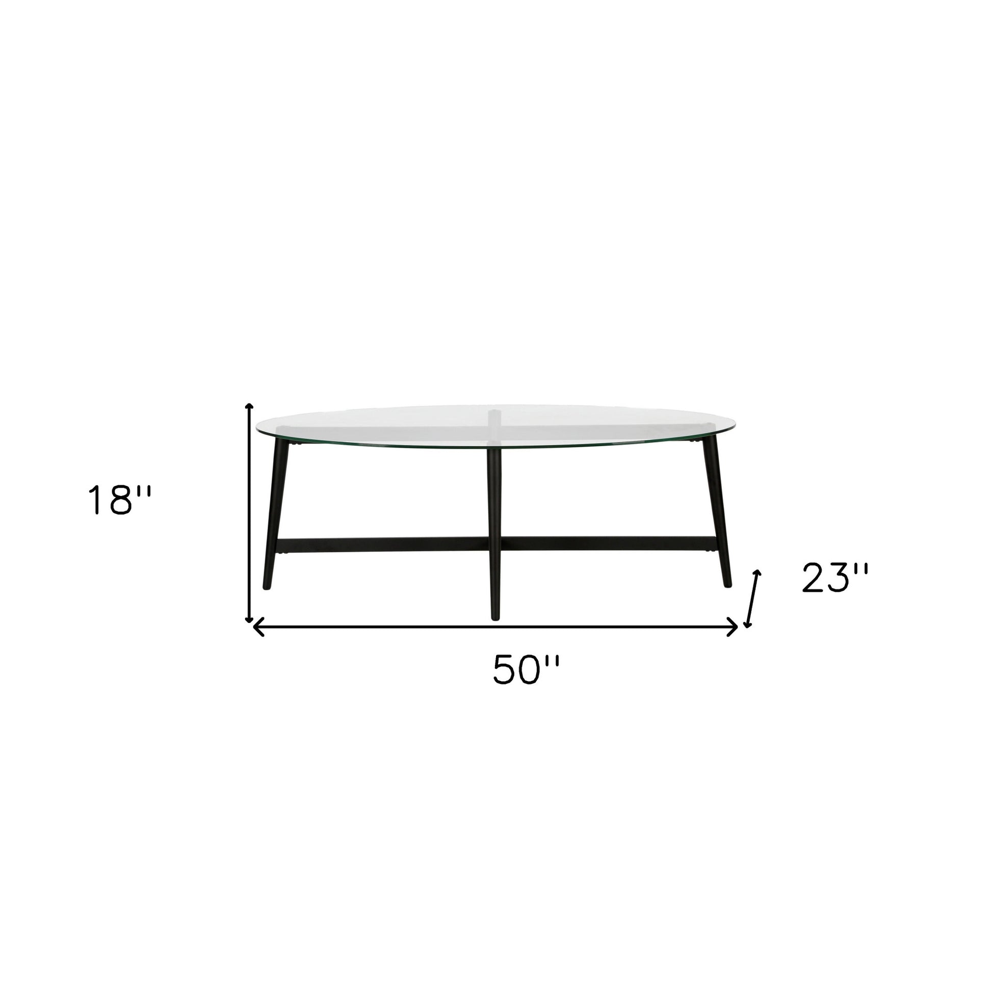 Add handsome, fashionable design to your living space with this 50-inch clear and black glass and steel oval coffee table. The clear glass top of this table is a nice visual contrast to the high quality, black steel of the base. This oval table is an updated take on a classic. If you're looking for something that can fit into a living area, bedroom, or office, this coffee table is for you. This coffee table is the sturdy, reliable and stylish answer to your living room needs. 18-inch H x 50-inch W x 23-inch D