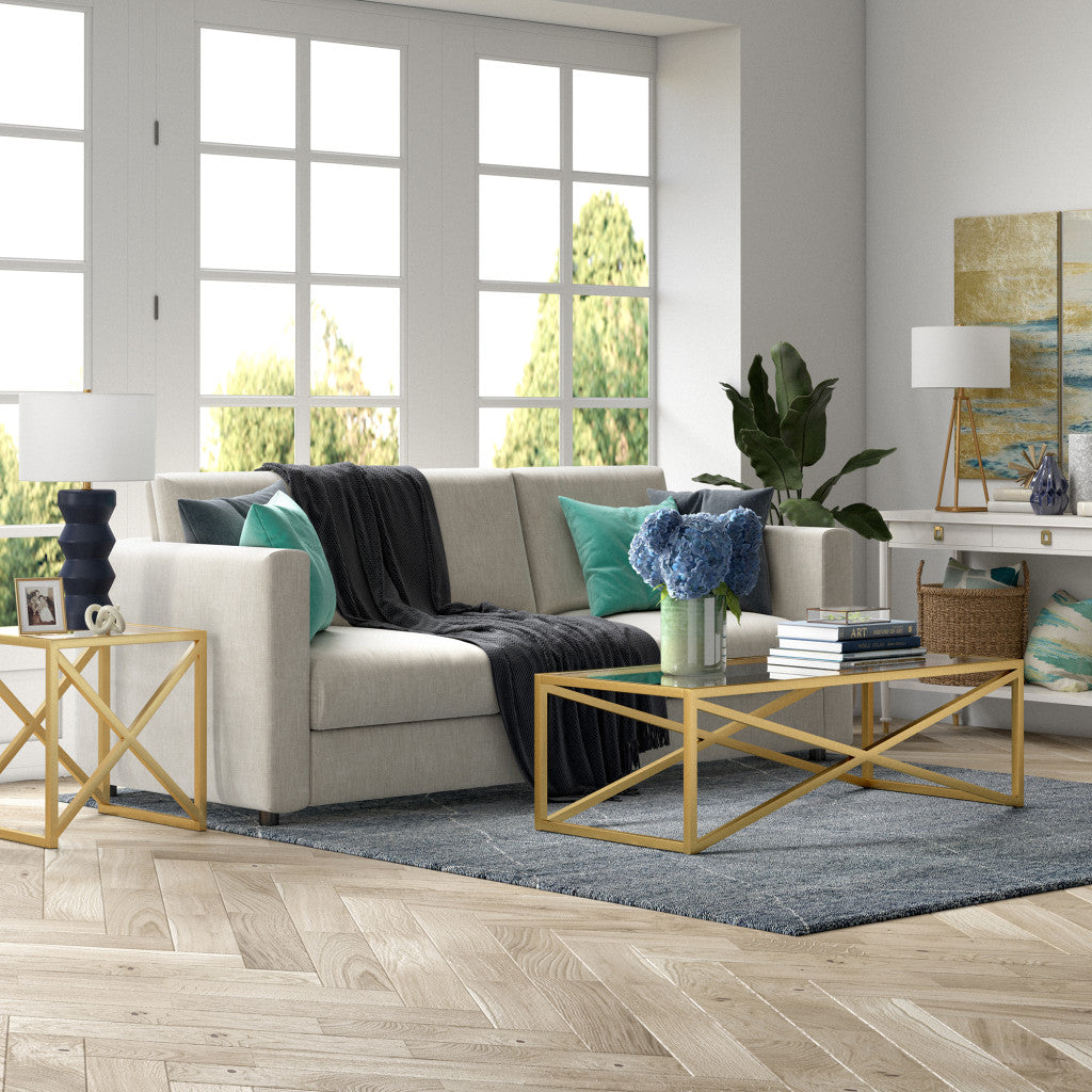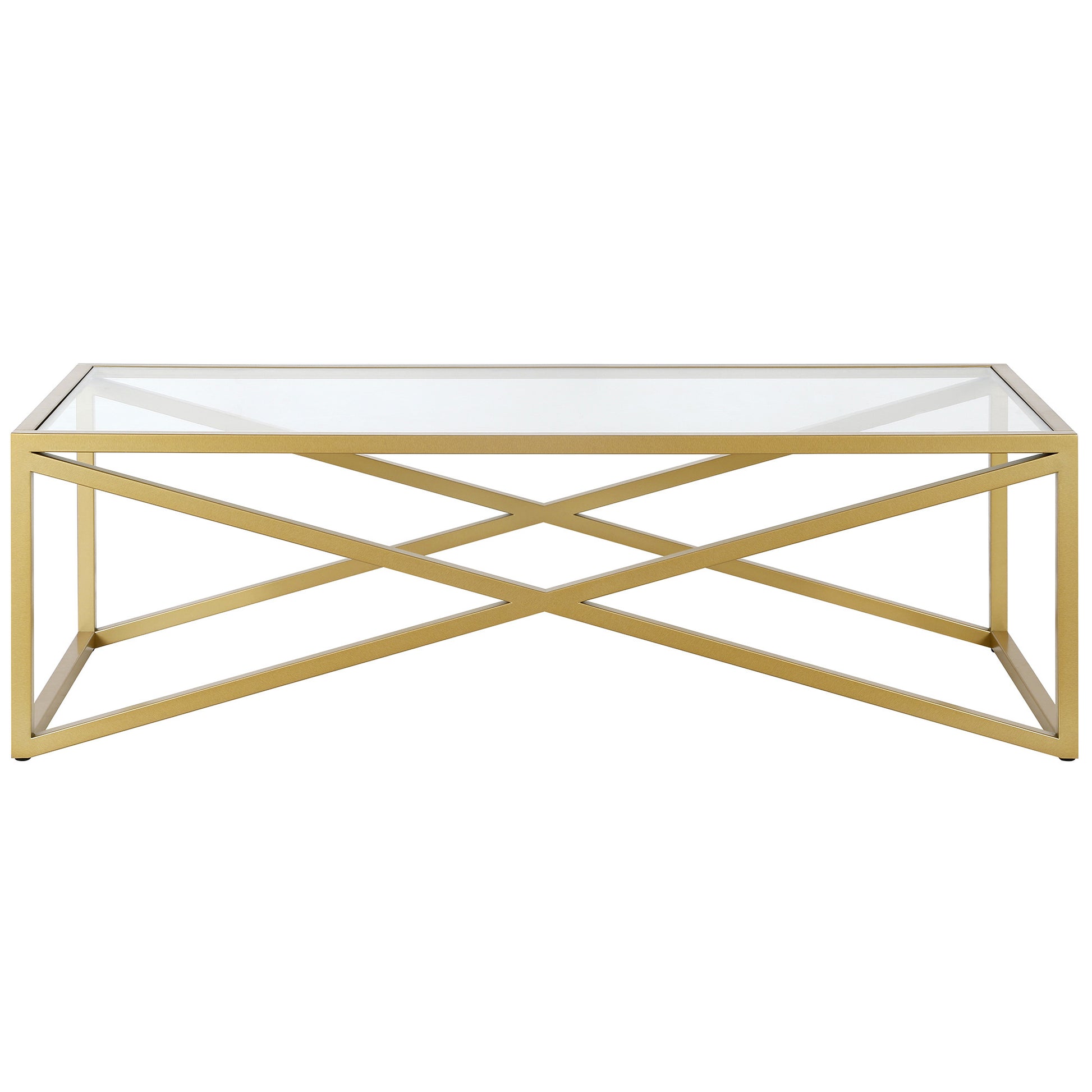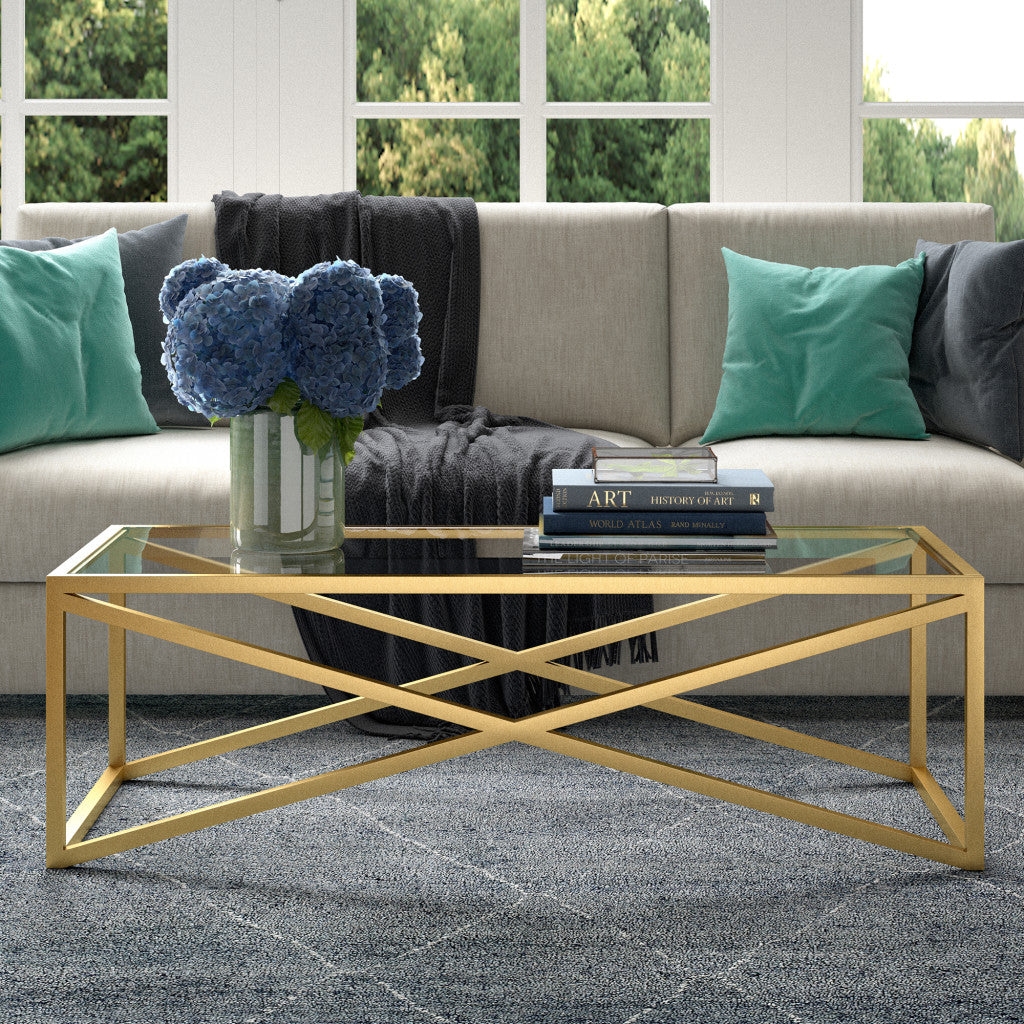 Make your living room or family room really stand out with this 54-inch gold glass and steel coffee table. A solid gold steel frame is finished off with a matching gold glass top, giving this table a chic monotone look. This classic rectangular table will be a great accent in any room it has a fresh design that will definitely breathe some fresh air into your interior. This coffee table is the sturdy, reliable and stylish answer to your living room needs. 17-inch H x 54-inch W x 24-inch D
