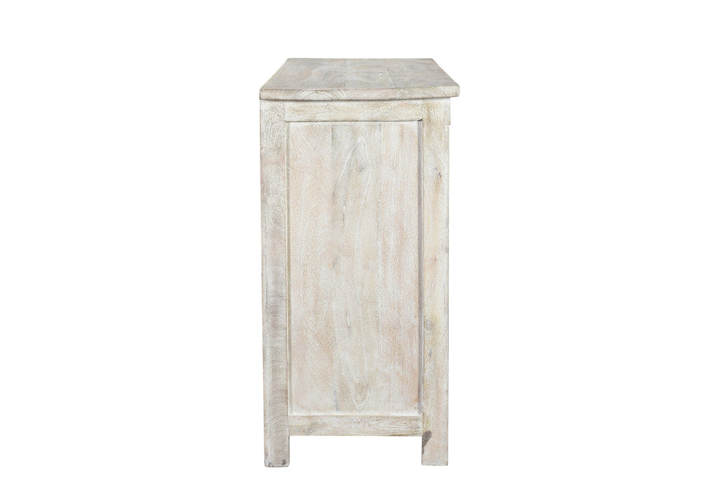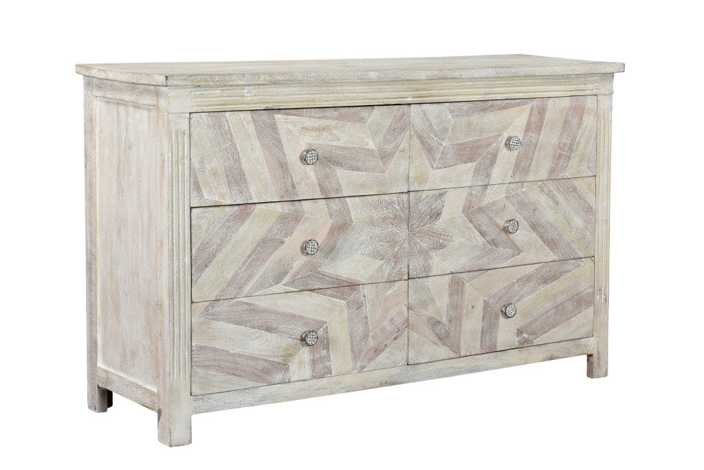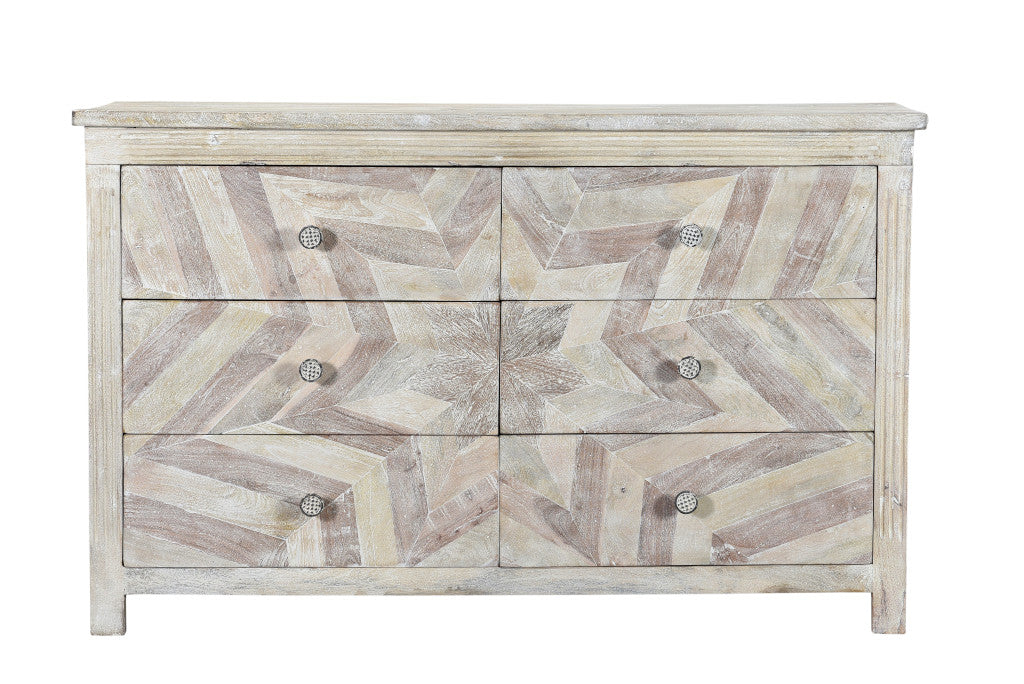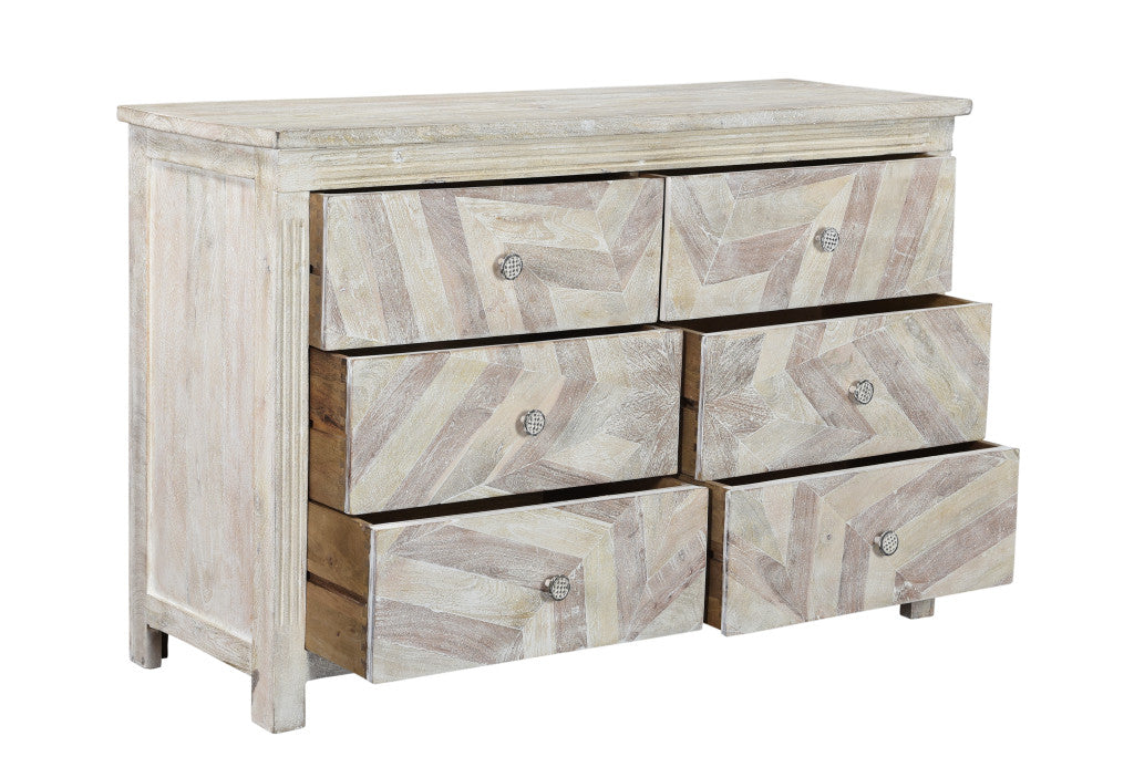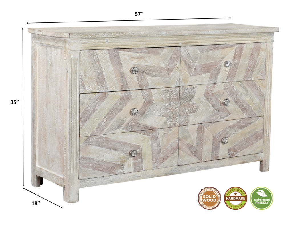 Make your room functional and visually enticing with this masterful 57" white wash solid wood six drawer double dresser. Designed for you to stand in front of and get ready, this horizontal double dresser has a convenient and wide top area for your getting ready needs and supplies. Loaded with capacity, this piece is equipped with six easy open drawers for practical and good looking clothing storage. This dresser is built to last from high quality solid wood, Removable drawers give this chest flexibility and multi-functionality. 35" H x 57" W x 18" D