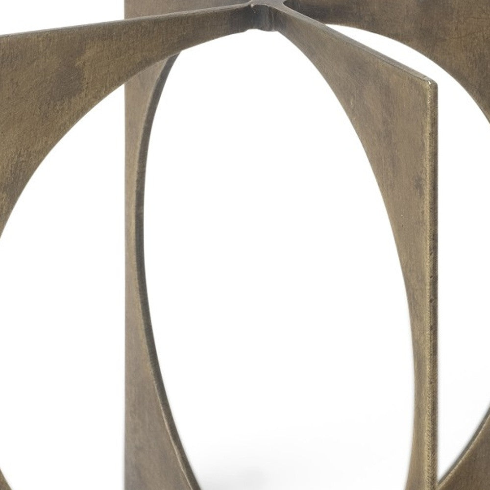 The perfect contemporary design piece, this Petite Burnished Gold Metal Circle Square Sculpture will elevate any corner of your home. This decor piece is made from solid metal and features two small square shapes intersecting at one point at the top and one at the bottom. There are circular shapes cut into these square shapes which makes the look of this decor piece very light and airy. The color of this decor piece is in a dark rustic matte gold color. You can use this decor piece anywhere in your home and it won't clash with the interior styles or colors you already have, owing to its minimal design and neutral coloway. 6" H x 5" W x 5" D