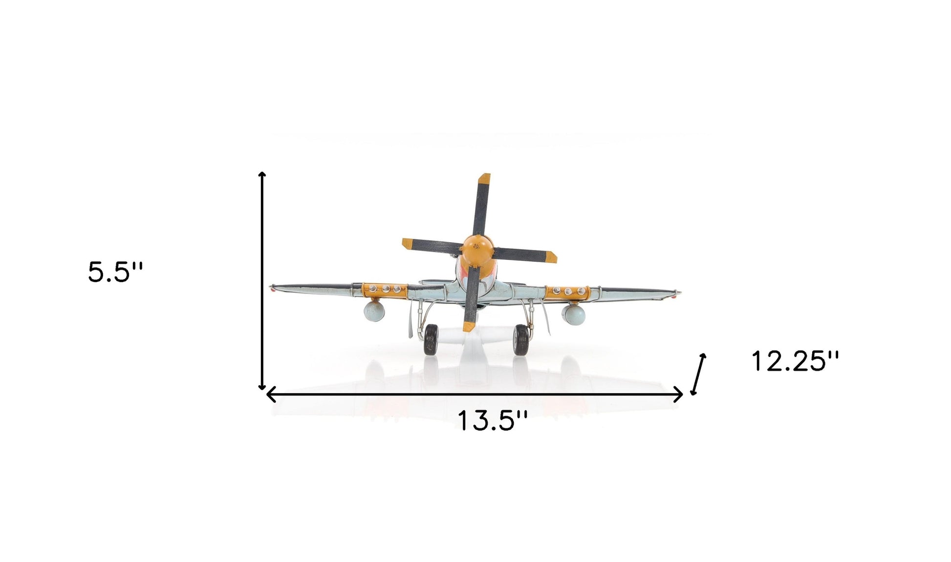 A beautiful replica of the iconic WWII American fighter-bomber, the c1943 Grey Mustang P51 Sculpture is handmade out of metal and accurately detailed. It comes with remarkable details such as landing wheels, a cockpit, and a propeller and is painted with authentic WWII paint and symbols. With a scale of 1:40, it is a sought-after piece for aviation and WWII enthusiasts. 5.5" x 13.5" x 12.25"
