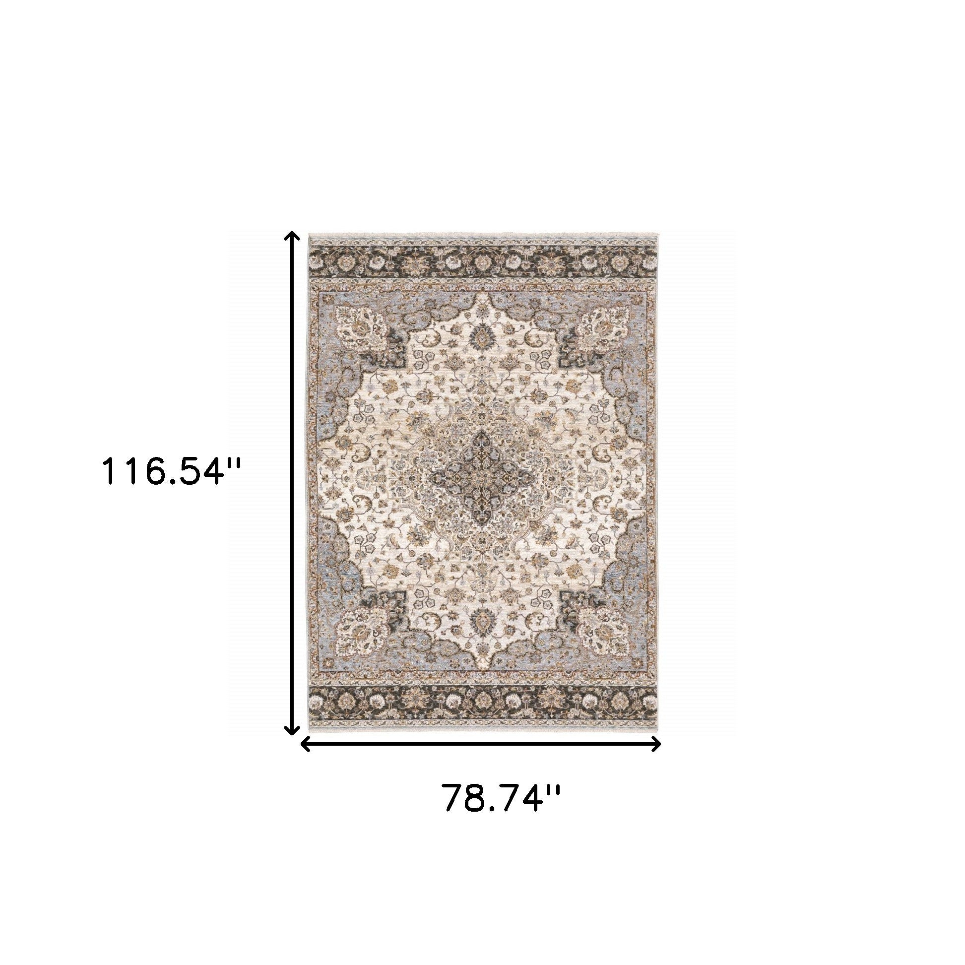 This 6' x 9' ivory and blue oriental power loom stain resistant area rug with fringe, is a great way to add warmth to a room. This rectangle shaped rug features a oriental design in ivory and blue to give it visual interest. A classic shape marries with good looking design for your space Ideal for spaces with kids and pets, this rug is stain resistant to help repel stains and spilled liquids. Tassel ends bring a timeless and fashionable look to your interior. Place this area rug against a hardwood or tile floor and it will enliven your living space with style and sophistication. 0.23" H x 78.74" W x 116.54" D