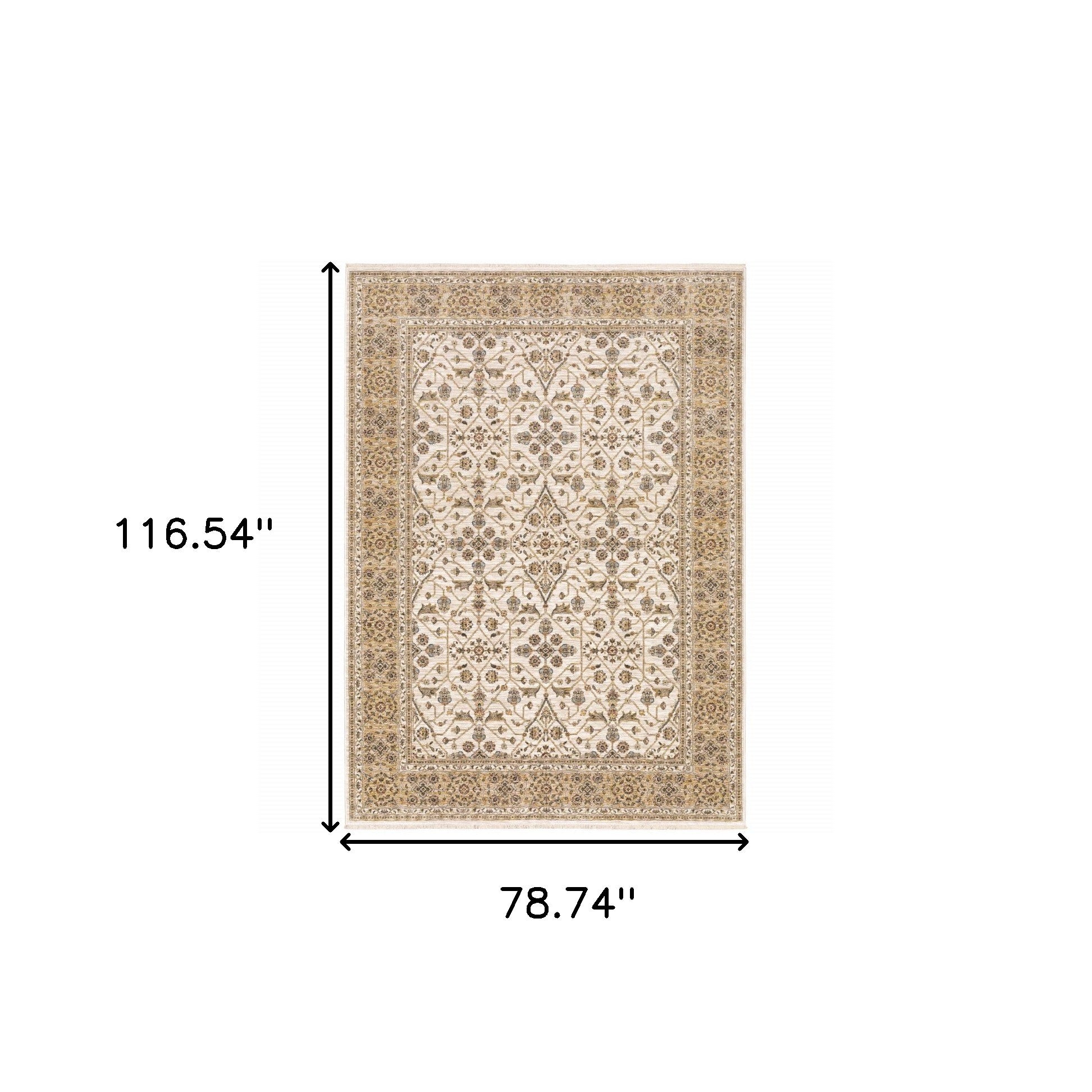Add some artistry to your room with this 6' x 9' ivory and gold oriental power loom stain resistant area rug with fringe. This rectangle shaped rug features a oriental design in ivory and gold to give it visual interest. A classic shape marries with good looking design for your space Ideal for spaces with kids and pets, this rug is stain resistant to help repel stains and spilled liquids. Tassel ends bring a timeless and fashionable look to your interior. Area Rugs help to give warmth and sense of home to your space. 0.23" H x 78.74" W x 116.54" D