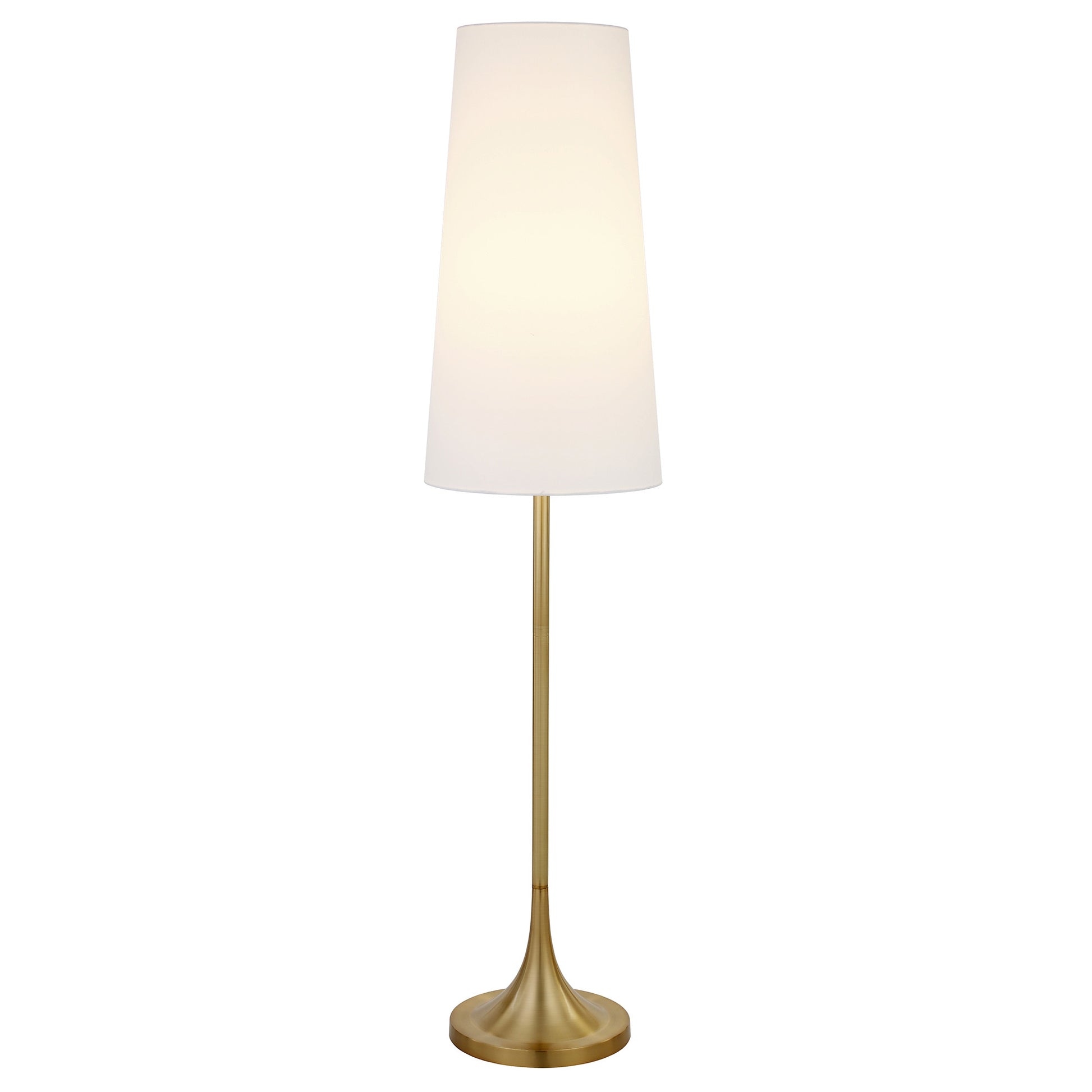 Truly a mix of design and functionality that doesn't compromise on style, this 60" brass novelty floor lamp with white frosted glass drum shade will be a great addition to your space. The base of this lamp is made of metal finished in a brass tone. The brass base coloring infuses a warm and rich tone to your space. The coloration of the brass lamp base creates a fashionable marriage with the the white fabric drum shaped shade. Designed to be unique and visually pleasing while giving great light, this novelty lamp will bring some fun fashion and style to your space The light that this lamp throws is soft and warm to elevate the look of most any space in your home. It is perfect for virtually any decor. 60" H x 14" W x 14" D