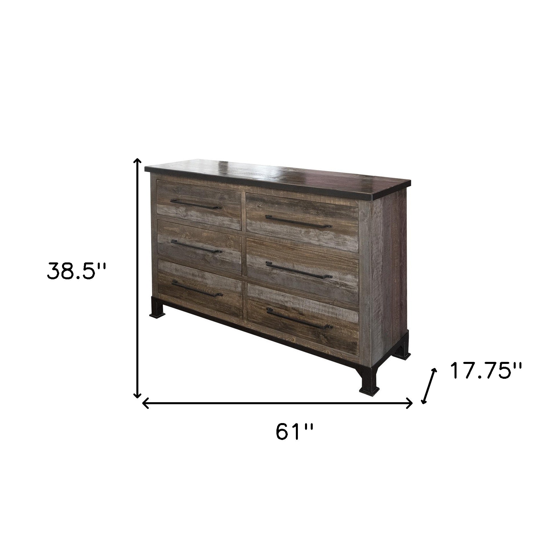 Enhance your room into a visually delightful and highly functional space with this 61" brown solid wood six drawer double dresser. This horizontal double dresser has column style drawers and a wide top surface area to help you with your daily dressing essentials. Loaded with capacity, this piece is equipped with six easy open drawers for practical and good looking clothing storage. This dresser is built to last from high quality solid wood,. 38.5" H x 61" W x 17.75" D