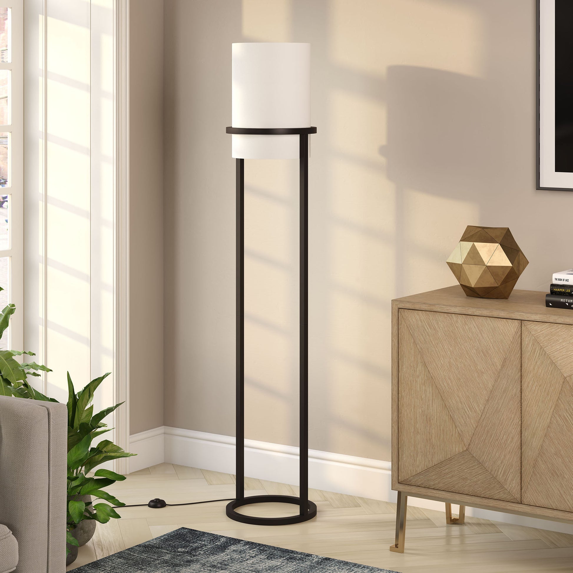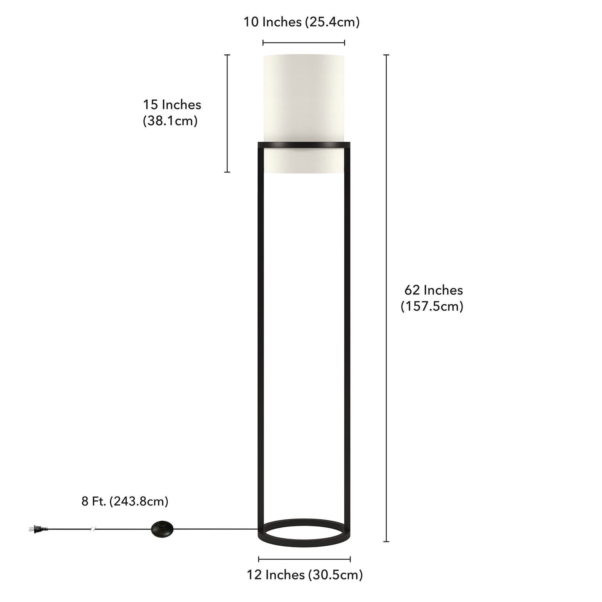 Embrace the good life with this hard working and stylish 62" black column floor lamp with white frosted glass drum shade. The lamp is made of sturdy metal and features a black color. The lamp shade itself has a drum shape and is made of fabric, which makes it a perfect choice. Unique and impactful, this column or tower shaped lamp is tall and rectangular emitting warm beautiful light. Use this lamp anywhere and elevate the look of the whole space. Bring some lite and good vibes into your space with this updated and stylishly designed lamp. 62" H x 12" W x 12" D
