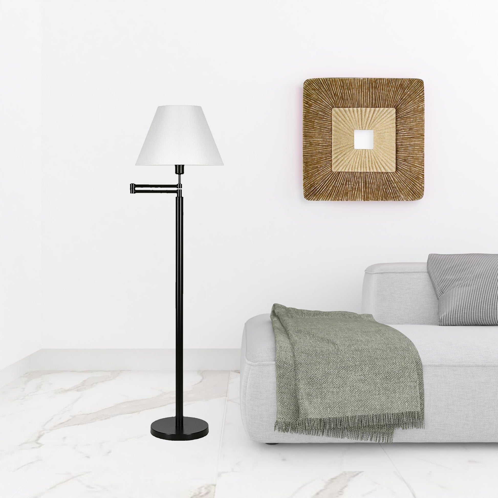 Bring of level of elegance and charm to your space with this good looking 62" black swing arm floor lamp with white frosted glass empire shade. The lamp is made of sturdy metal and features a black color. The lamp light itself is covered by a fabric, empire shaped shade, making this a classy piece that will complement most any interior. A stationary base marries with a flexible swing arm that allows you to extend and move the light to where you need it. High quality design makes this a great lamp for not only lighting, but accenting a room with style. Bring some lite and good vibes into your space with this updated and stylishly designed lamp. 62" H x 26" W x 16" D