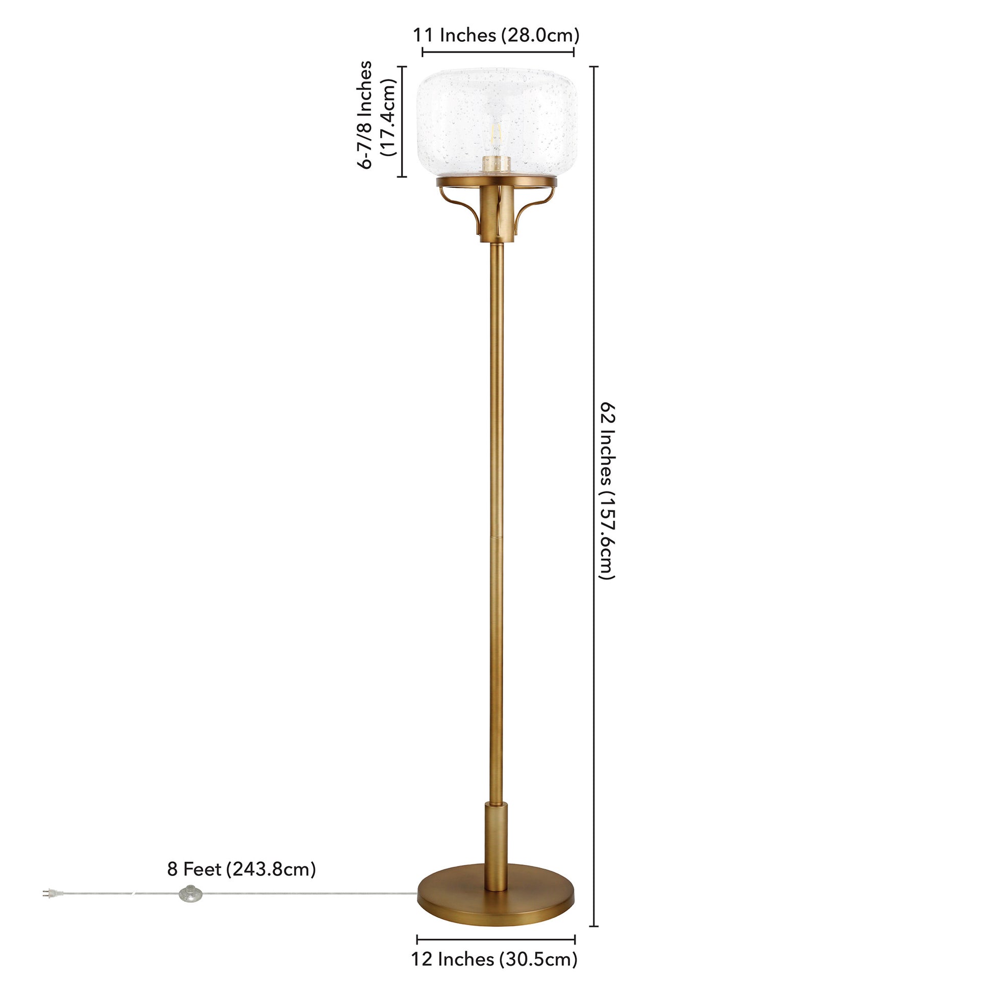 This 62" brass novelty floor lamp with clear seeded glass globe shade is a great way to add some brightness to any corner of your home. The base of this lamp is made of brass metal. The brass base coloring infuses a warm and rich tone to your space. The lamp shade itself has a globe shape and is made of glass, which makes it a perfect choice. Designed to be unique and visually pleasing while giving great light, this novelty lamp will bring some fun fashion and style to your space High quality design makes this a great lamp for not only lighting, but accenting a room with style. It is perfect for virtually any decor. 62" H x 12" W x 12" D