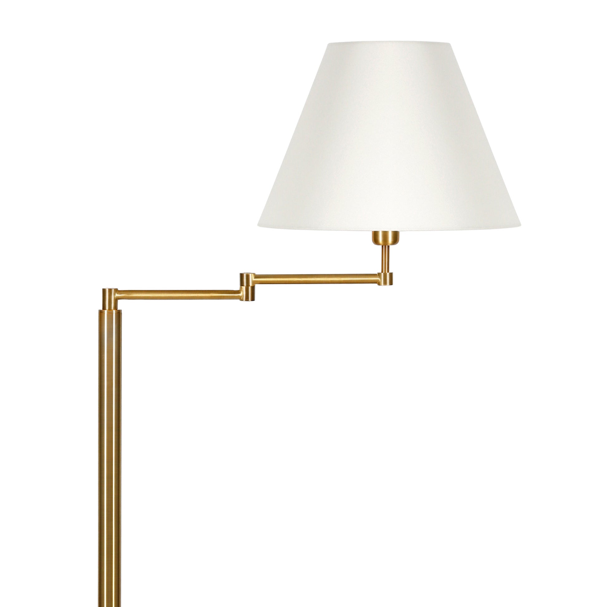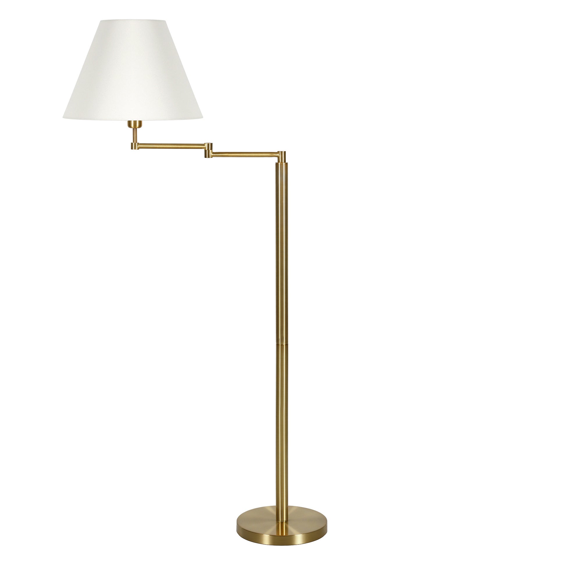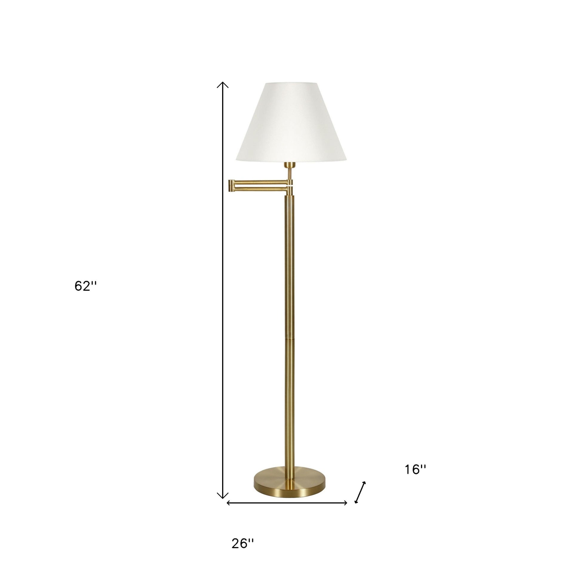 This 62" brass swing arm floor lamp with white frosted glass empire shade is a great way to add some brightness to any corner of your home. The lamp is made of sturdy metal and features a brass color. The brass base coloring infuses a warm and rich tone to your space. The brass of this lamp creates a nice contrast with the white fabric empire shaped shade. A stationary base marries with a flexible swing arm that allows you to extend and move the light to where you need it. High quality design makes this a great lamp for not only lighting, but accenting a room with style. Bring some lite and good vibes into your space with this updated and stylishly designed lamp. 62" H x 26" W x 16" D