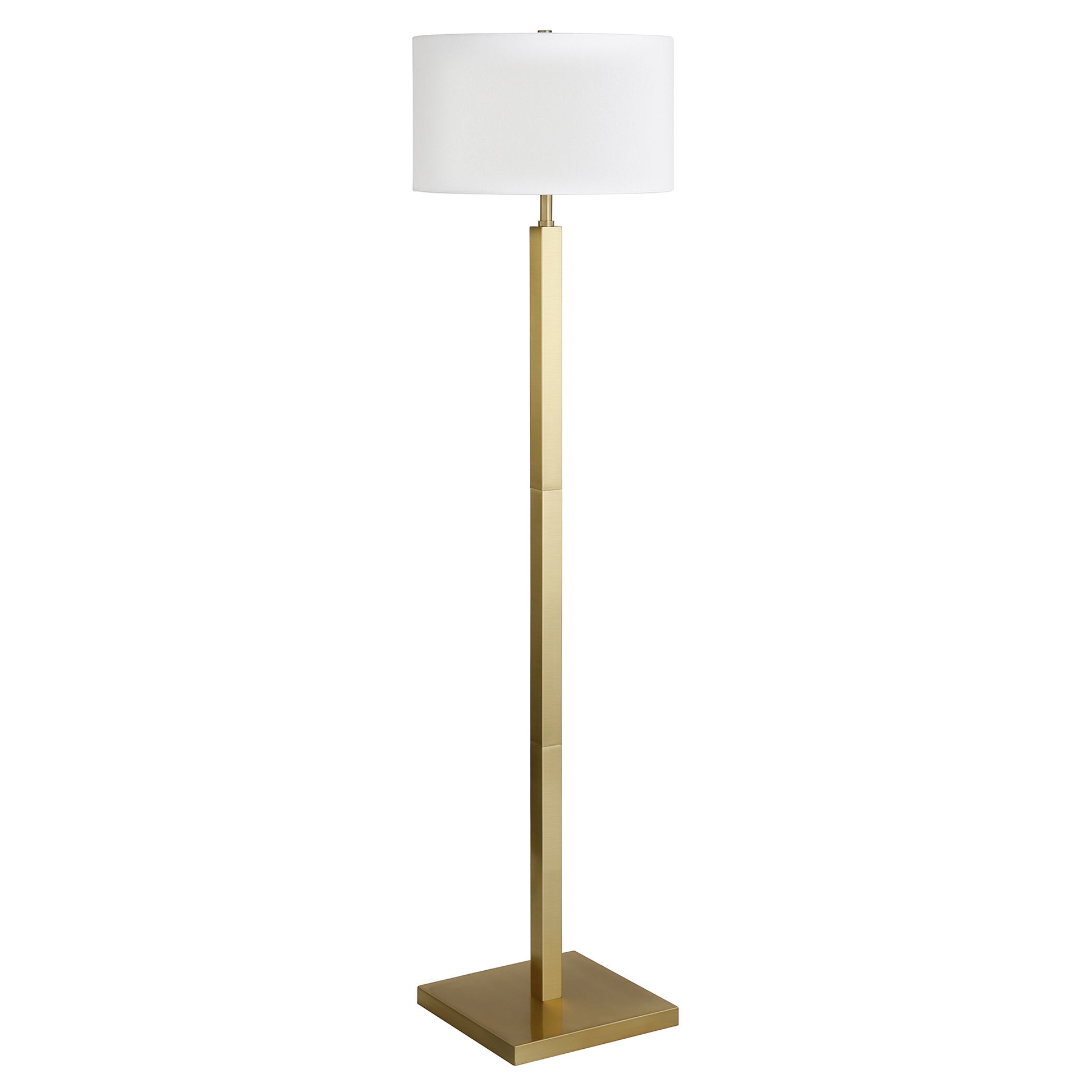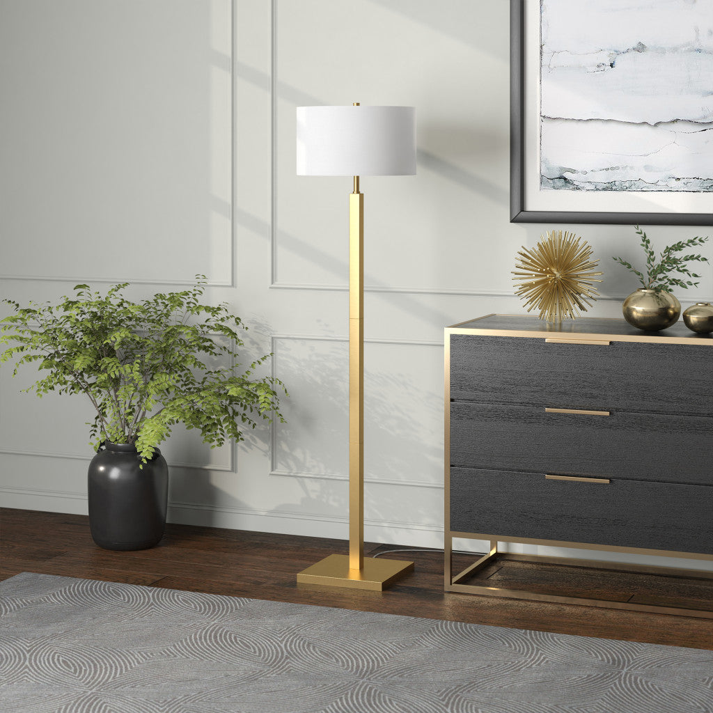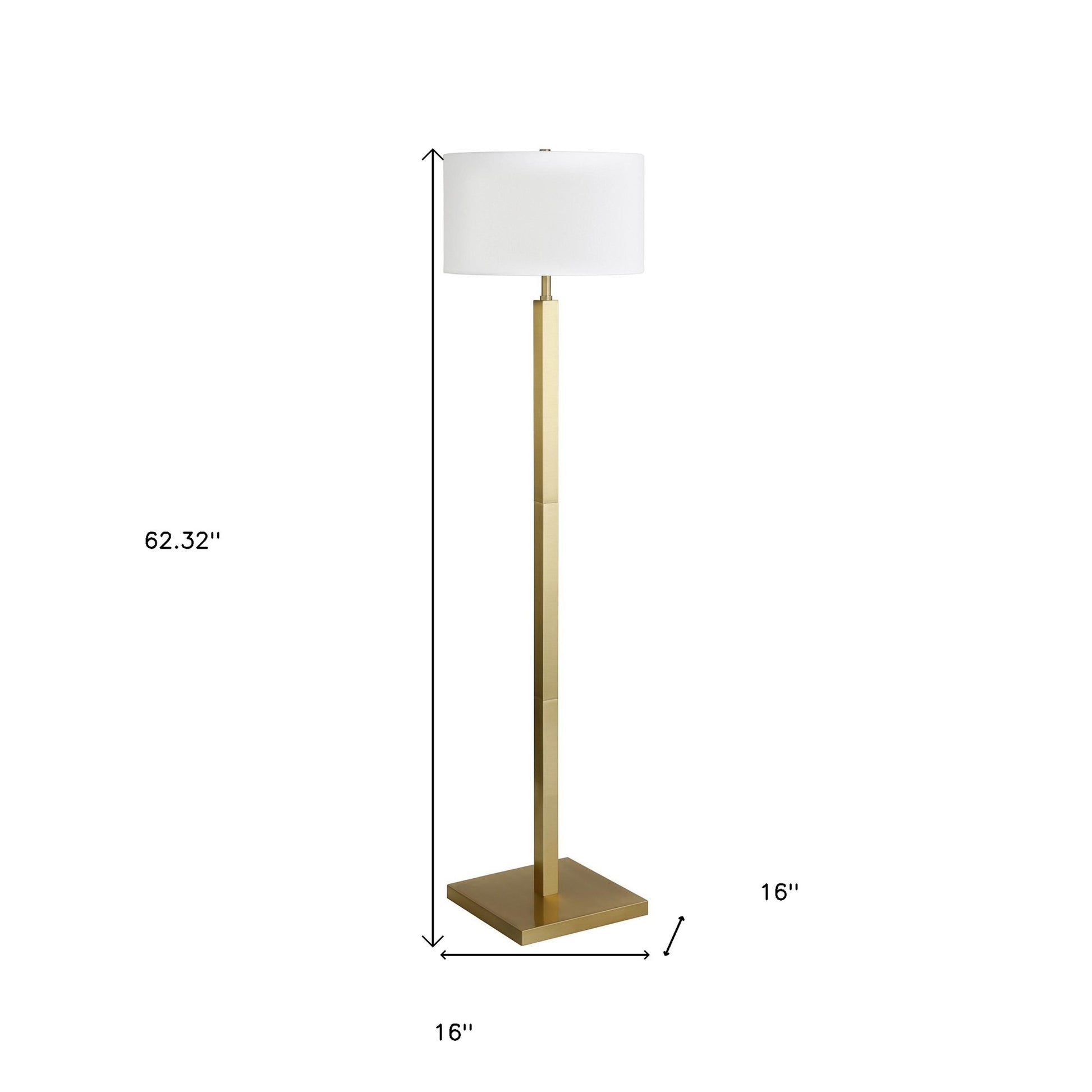 Embrace the good life with this hard working and stylish 62" brass traditional shaped floor lamp with white frosted glass drum shade. The base of this lamp is made of metal finished in a brass tone. The brass base coloring infuses a warm and rich tone to your space. This good looking lamp includes a fabric drum shaped shade. Classically styled, this traditional lamp features a straight pole that extends upwards from a single base. High quality design makes this a great lamp for not only lighting, but accenting a room with style. The perfect lamp to create just the right natural and soothing light in your space. 62.32" H x 16" W x 16" D
