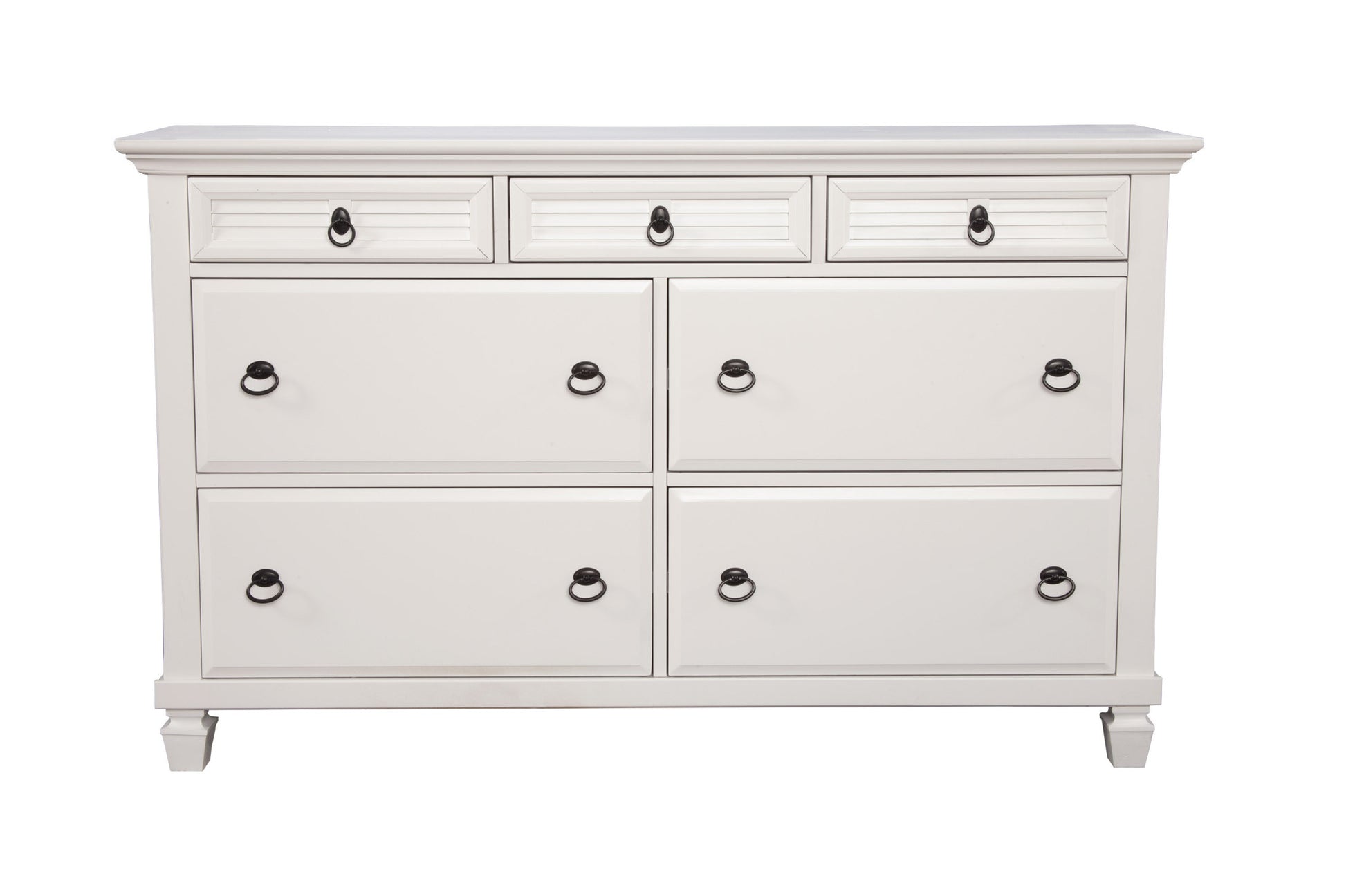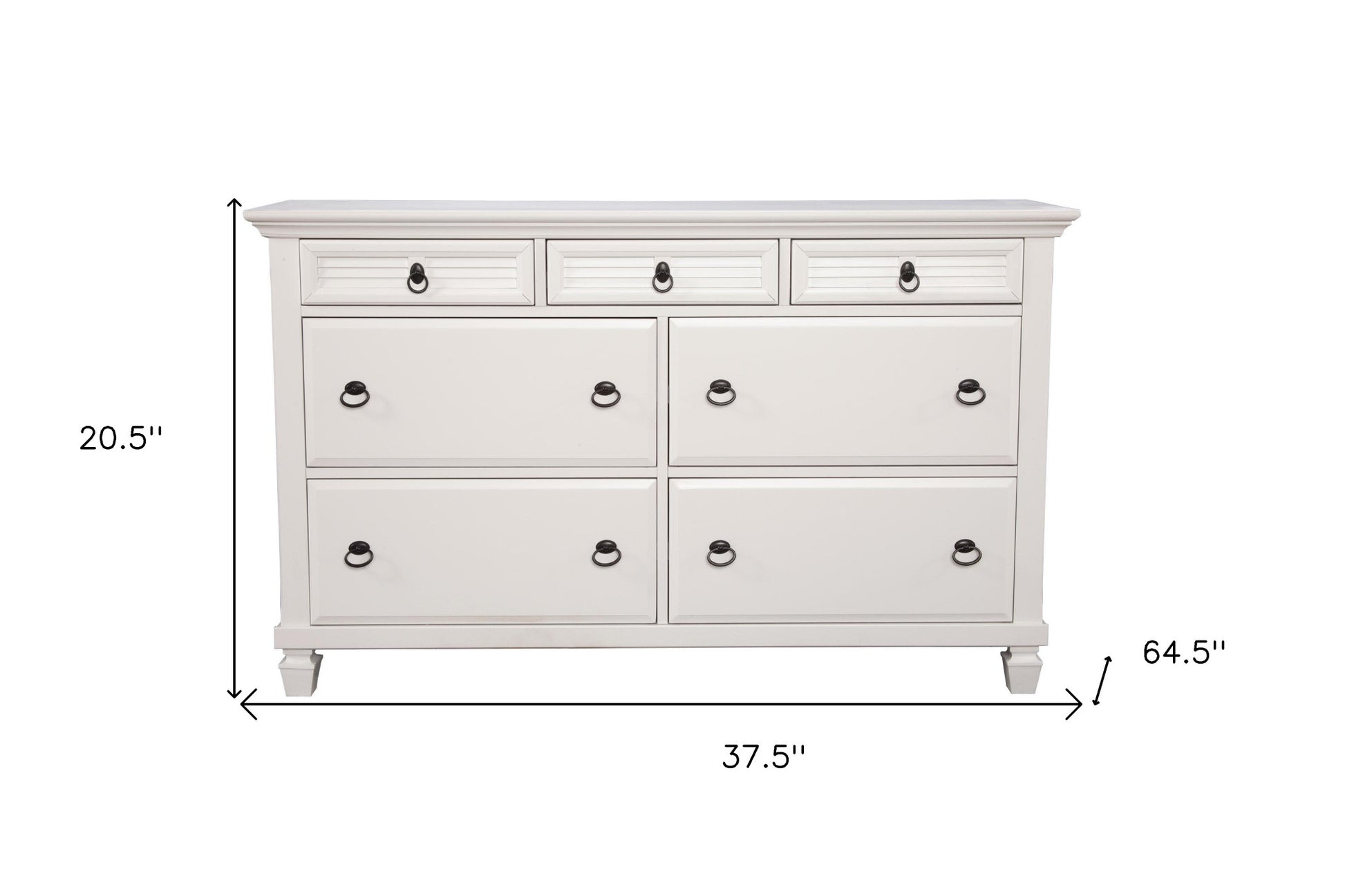 Enhance your room into a visually delightful and highly functional space with this 62" white solid wood seven drawer double dresser. This horizontal double dresser has column style drawers and a wide top surface area to help you with your daily dressing essentials. Loaded with capacity, this piece is equipped with seven easy open drawers for practical and good looking clothing storage. This dresser is built to last from high quality solid wood, The white coloration of this piece is neutral and will blend easily with most any decor. 38" H x 62" W x 18" D