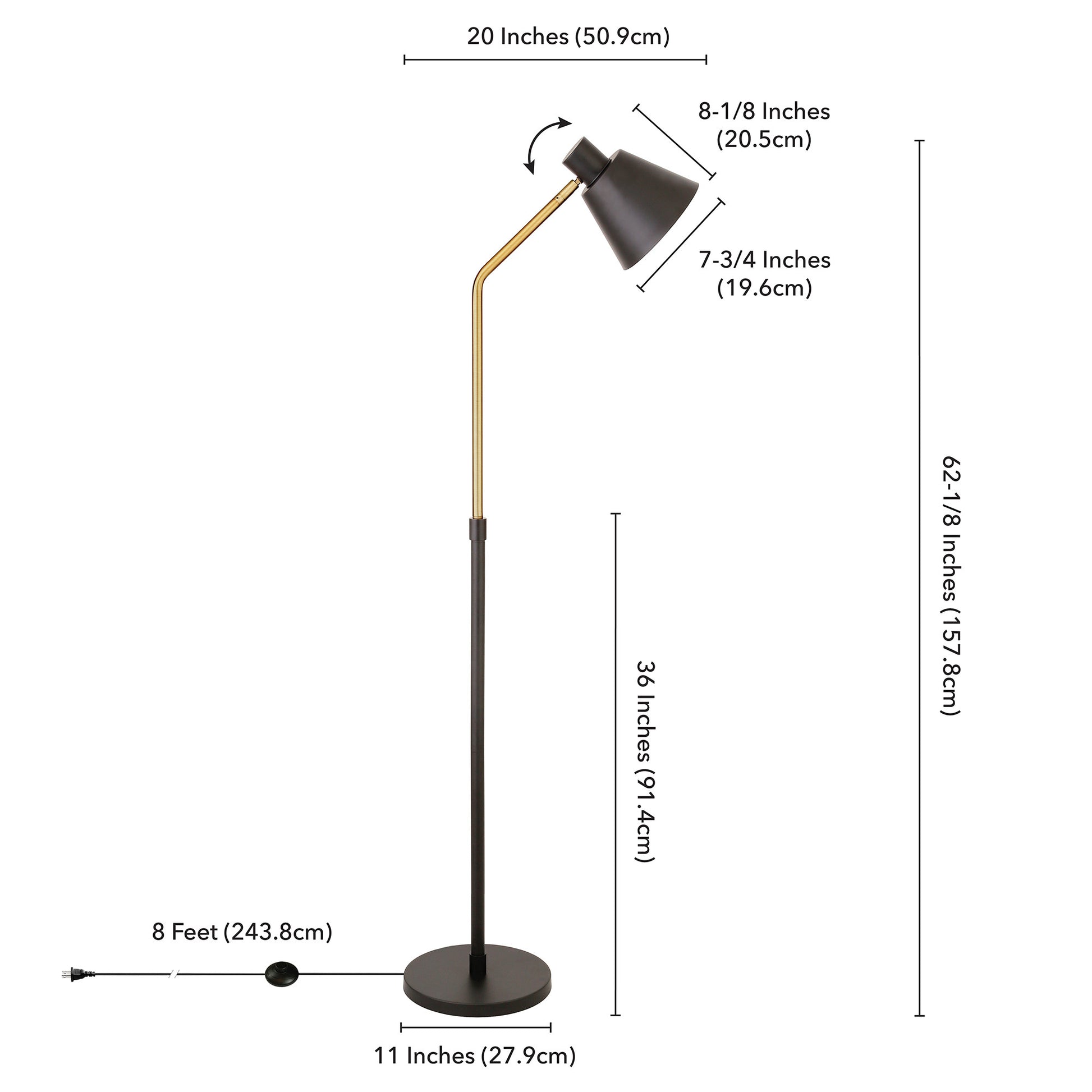Add a bright anchor to your room with this 63" black reading floor lamp with black cone shade. A gorgeous black metal base bring just the right amount of pizzazz to this fabulous lamp. This good looking lamp includes a metal cone shaped shade. Next to your desk or favorite chair this single base task/reading lamp is designed to make your work or activities easier with concentrated light in just the space you need it. Use this lamp anywhere and elevate the look of the whole space. It is perfect for virtually any decor. 63" H x 11" W x 11" D
