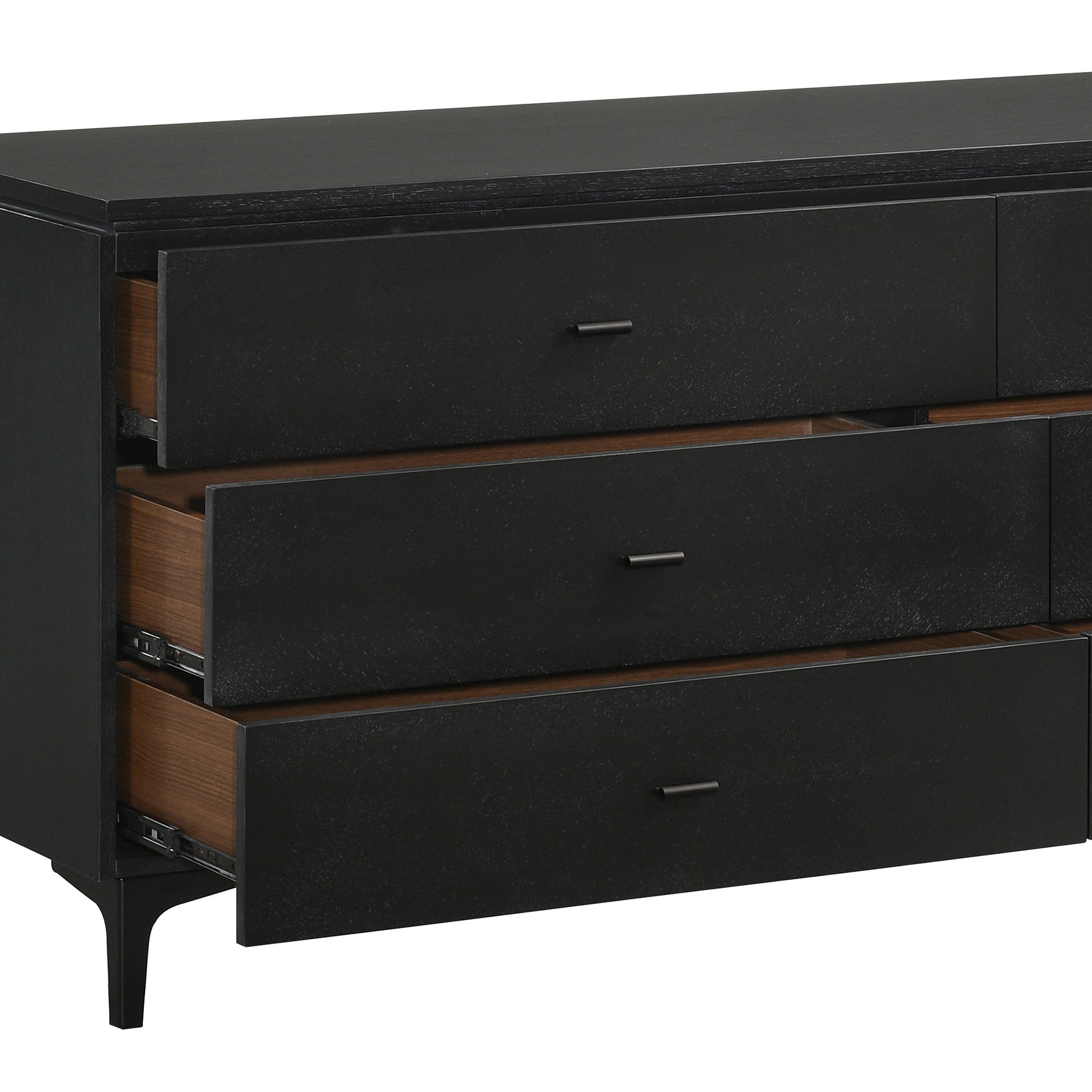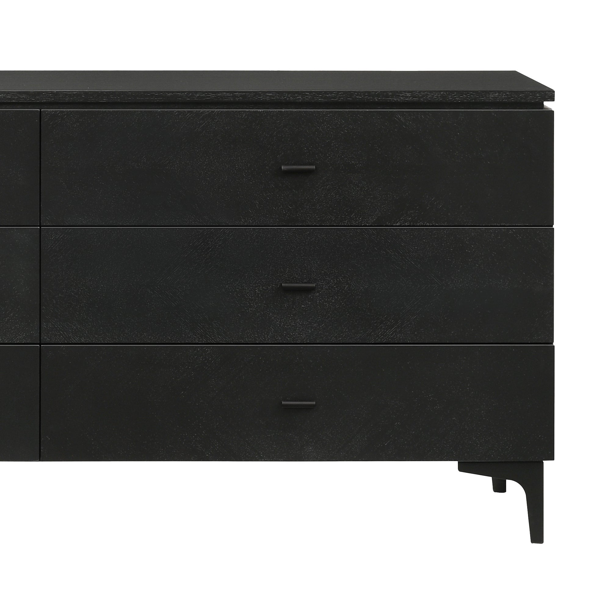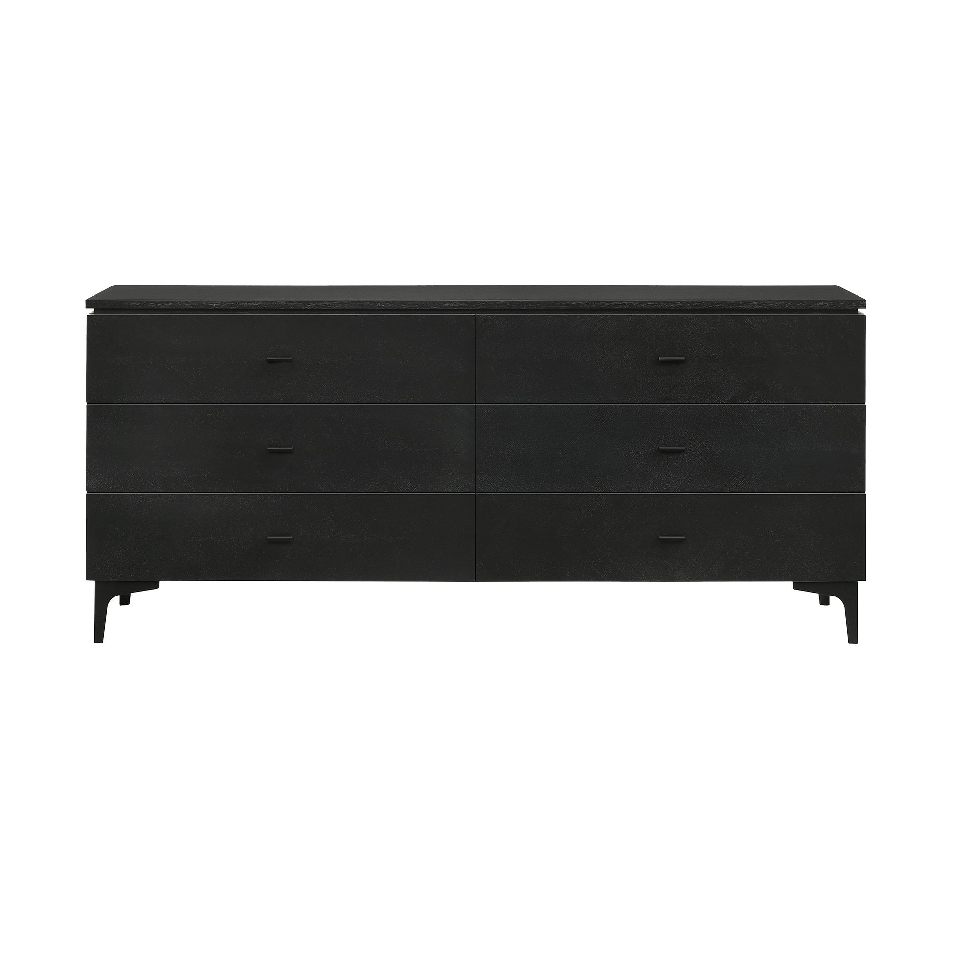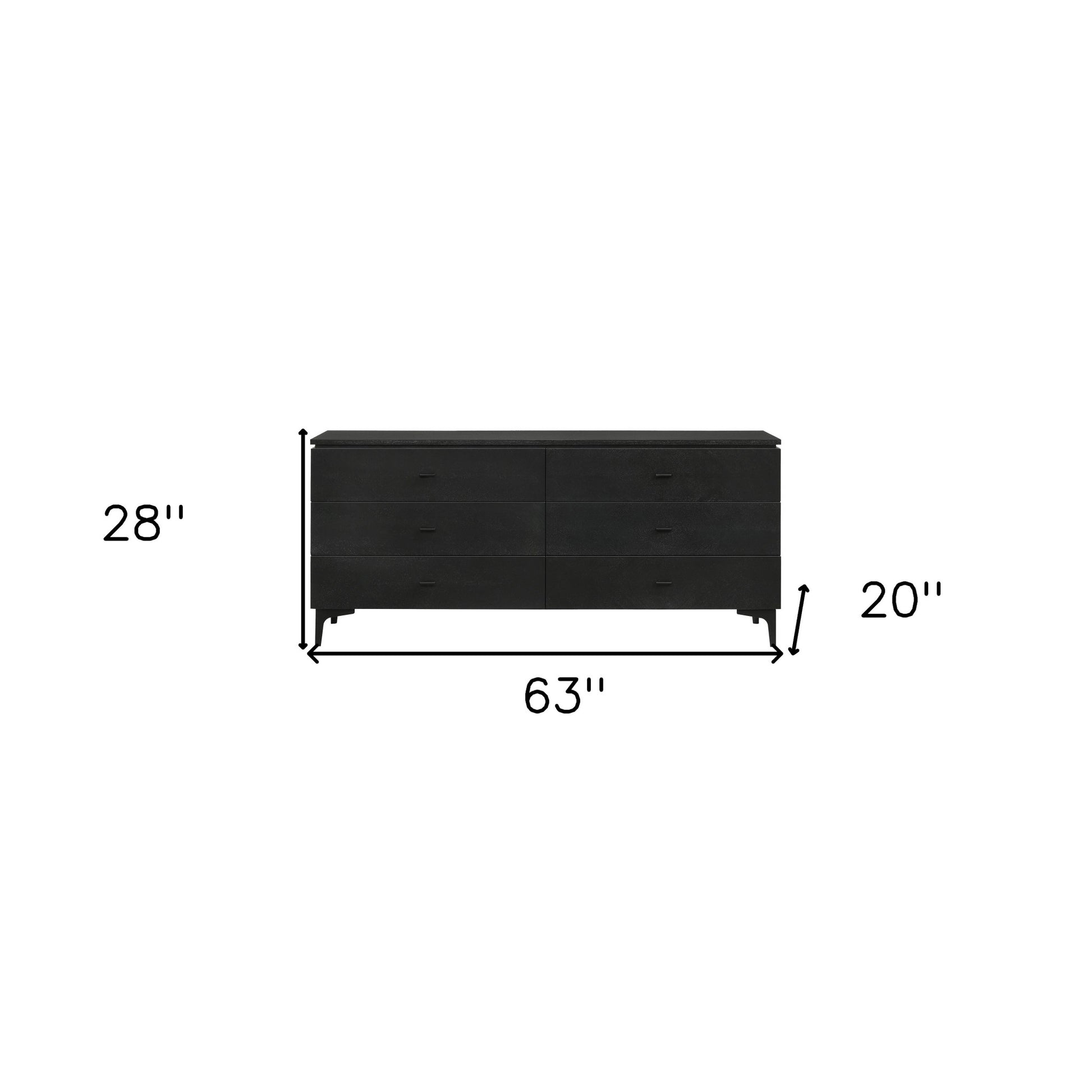 This 63-inch black six drawer double dresser is a practical and good looking accent for your bedroom storage and organizational needs. This horizontal double dresser has column style drawers and a wide top surface area to help you with your daily dressing essentials. Loaded with capacity, this piece is equipped with six easy open drawers for practical and good looking clothing storage. Its a high quality piece, made from high grade manufactured wood. The black coloration of this piece gives it an updated, and modern edge. 28-inch H x 63-inch W x 20-inch D