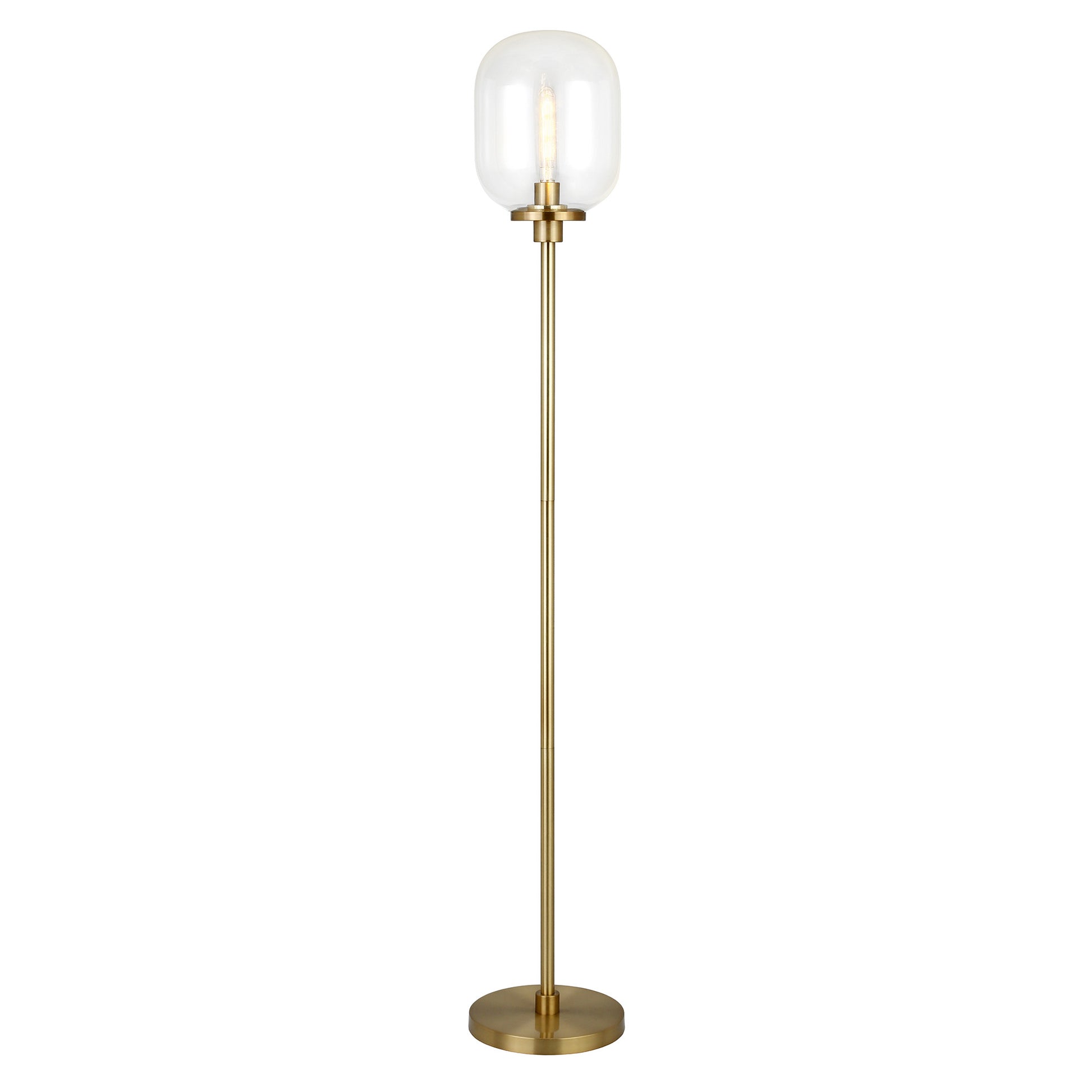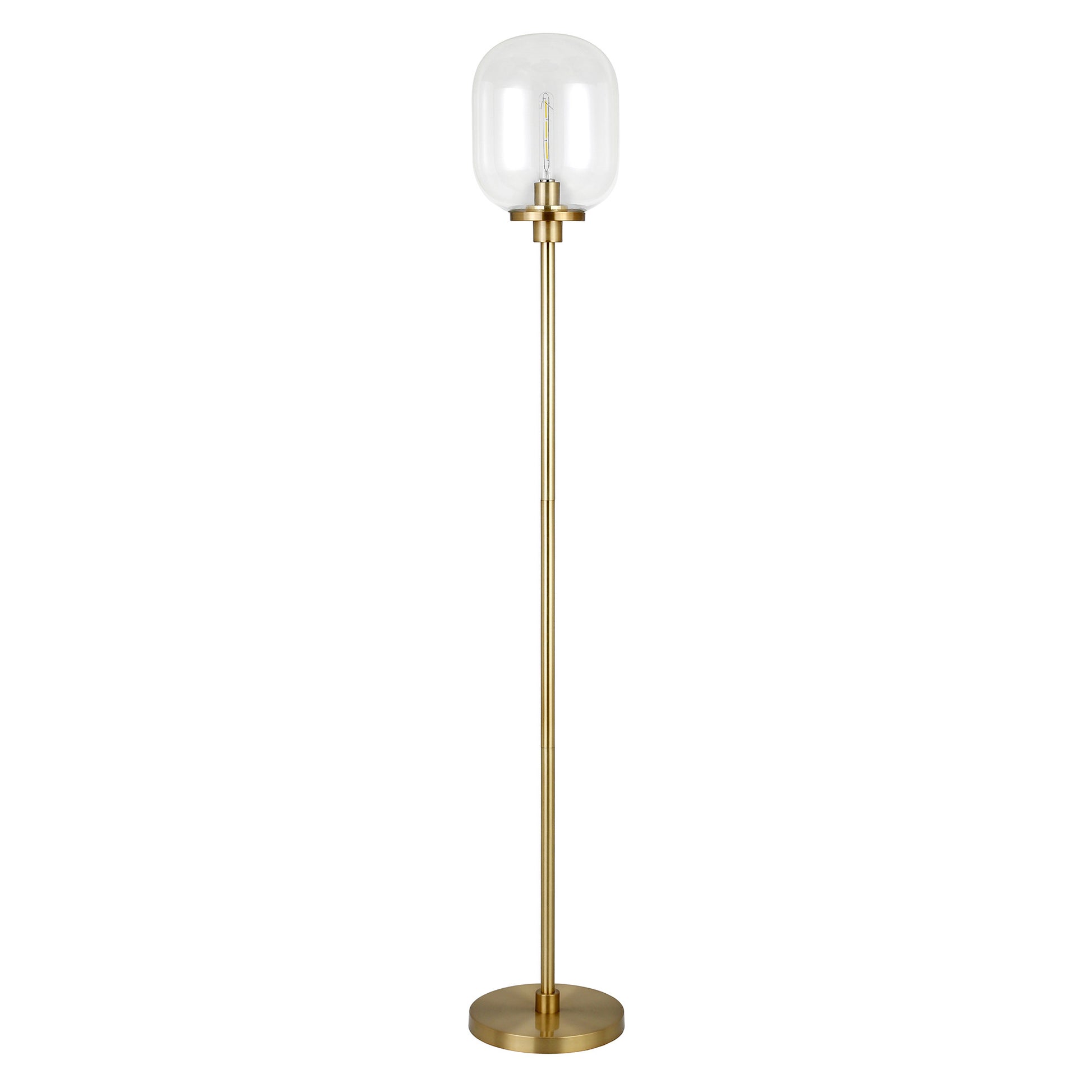 With this 69" brass novelty floor lamp with clear seeded glass globe shade you bring design along with some warm ambient lighting to your space. A gorgeous brass metal base bring just the right amount of pizzazz to this fabulous lamp. The brass base coloring infuses a warm and rich tone to your space. The lamp shade has a globe shape and is made from glass. Designed to be unique and visually pleasing while giving great light, this novelty lamp will bring some fun fashion and style to your space The light that this lamp throws is soft and warm to elevate the look of most any space in your home. The perfect lamp to create just the right natural and soothing light in your space. 69" H x 11" W x 11" D