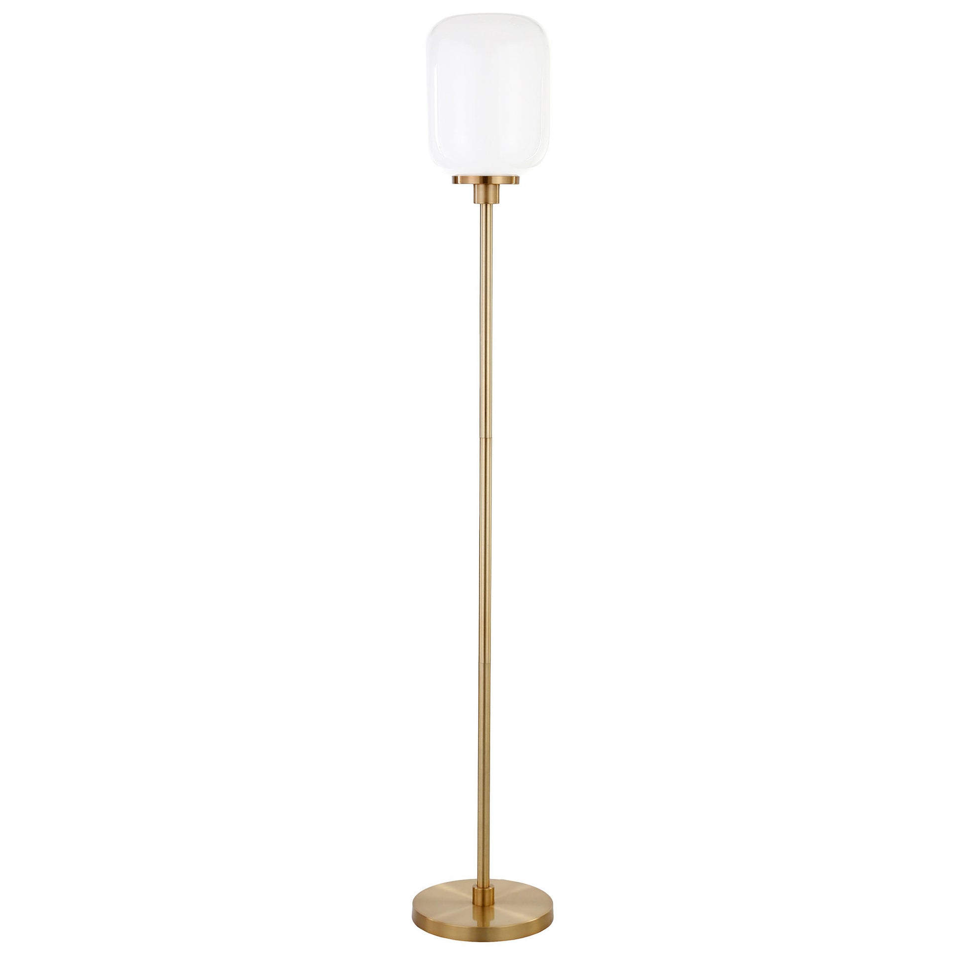 Truly a mix of design and functionality that doesn't compromise on style, this 69" brass novelty floor lamp with white frosted glass globe shade will be a great addition to your space. The lamp is made of sturdy metal and features a brass color. The brass base coloring infuses a warm and rich tone to your space. This good looking lamp includes a glass globe shaped shade. Designed to be unique and visually pleasing while giving great light, this novelty lamp will bring some fun fashion and style to your space High quality design makes this a great lamp for not only lighting, but accenting a room with style. It is perfect for virtually any decor. 69" H x 11" W x 11" D