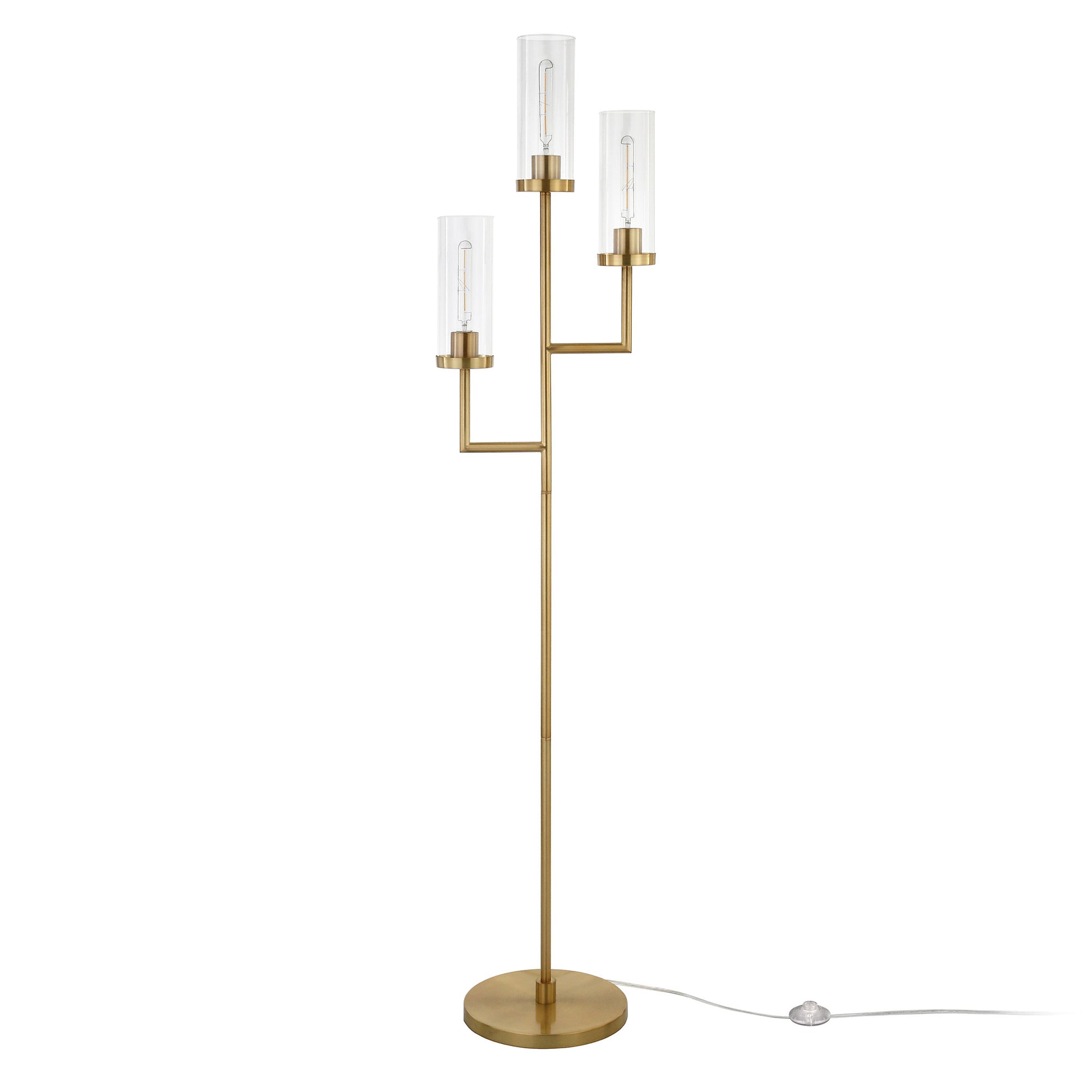 69" Brass Three Light Torchiere Floor Lamp With Clear Transparent Glass Drum Shade