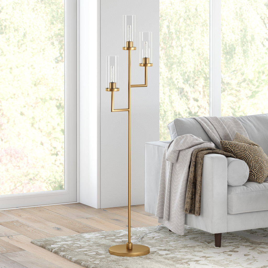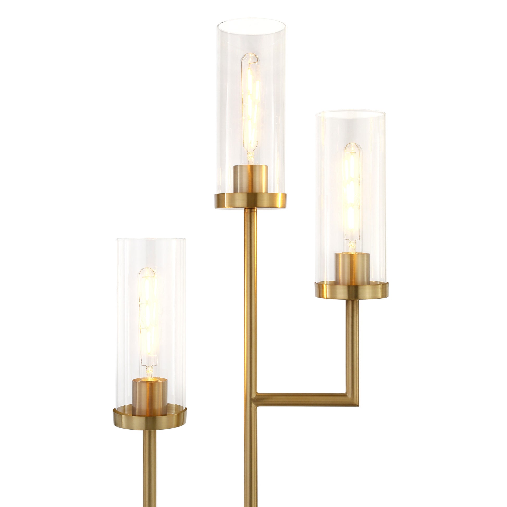 Add a bright anchor to your room with this 69-inch brass three light torchiere floor lamp with clear transparent glass drum shade. A gorgeous brass metal base bring just the right amount of pizzazz to this fabulous lamp. The brass base coloring infuses a warm and rich tone to your space. This good looking lamp includes a glass drum shaped shade. Add a soft warm glow to your space with this classic torchiere styled lamp. A straight pole extends upwards from a single base while the scooped shade shape refracts light upward and outward much like it's name sake,a torch. Use this lamp anywhere and elevate the look of the whole space. Bring some lite and good vibes into your space with this updated and stylishly designed lamp. 69-inch H x 15-inch W x 12-inch D