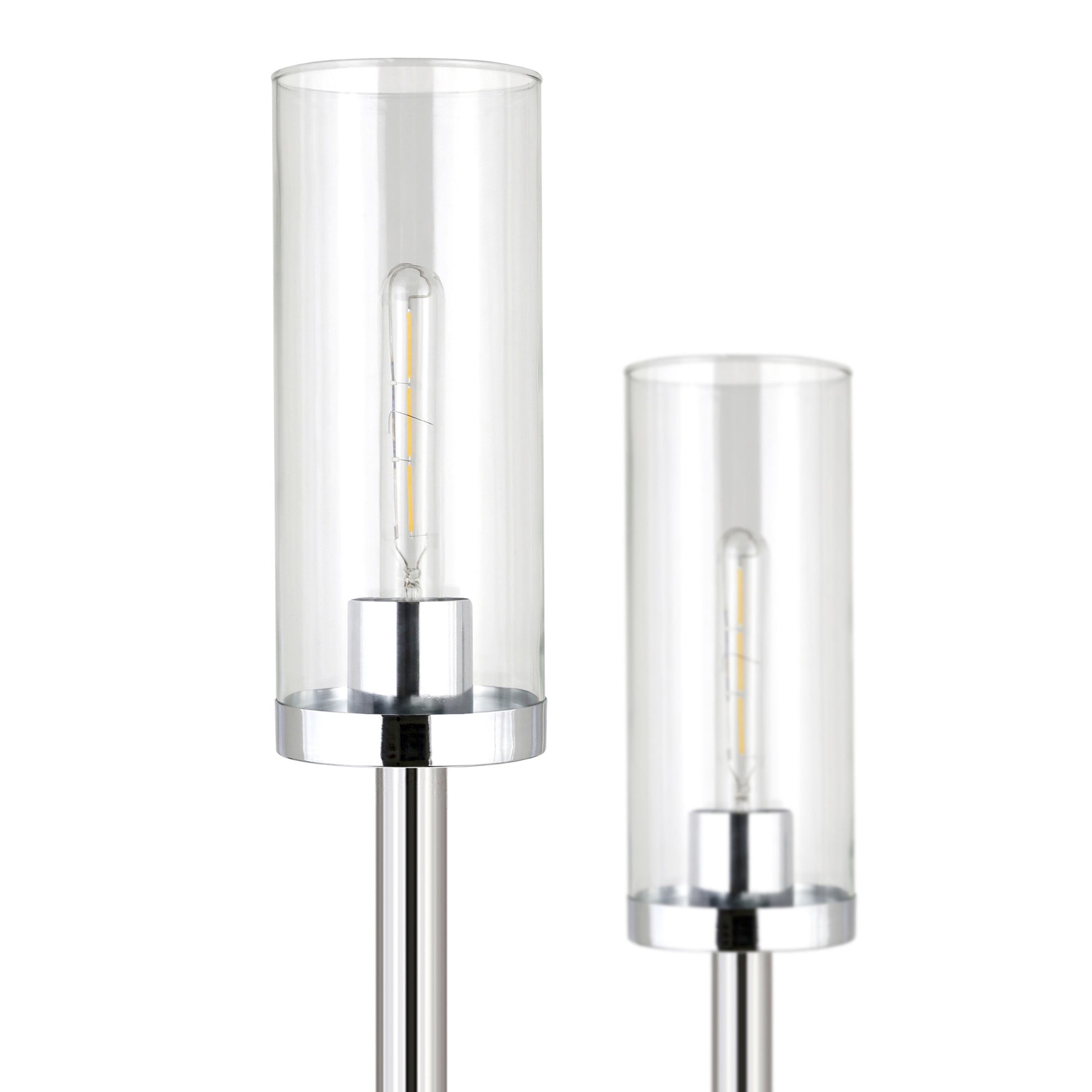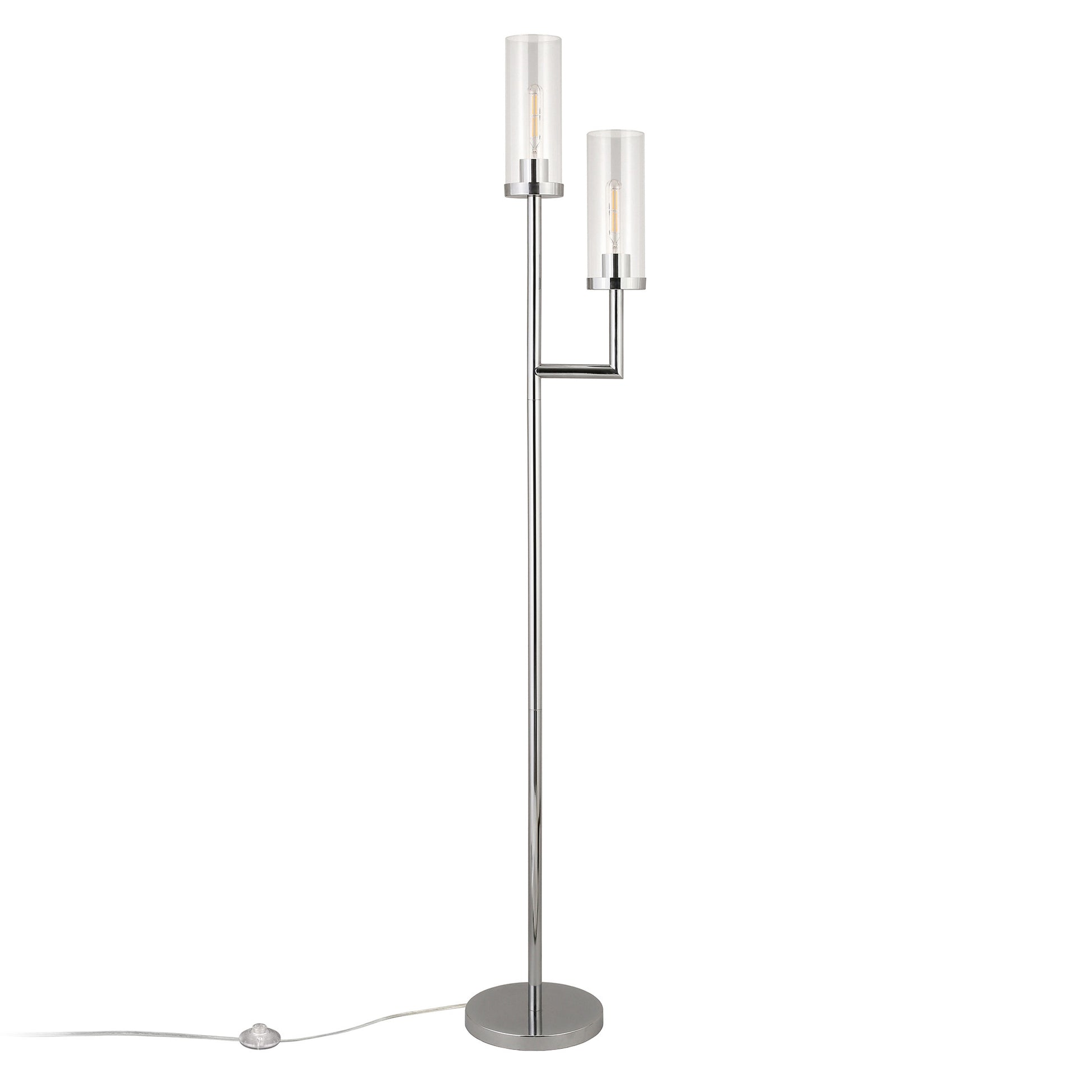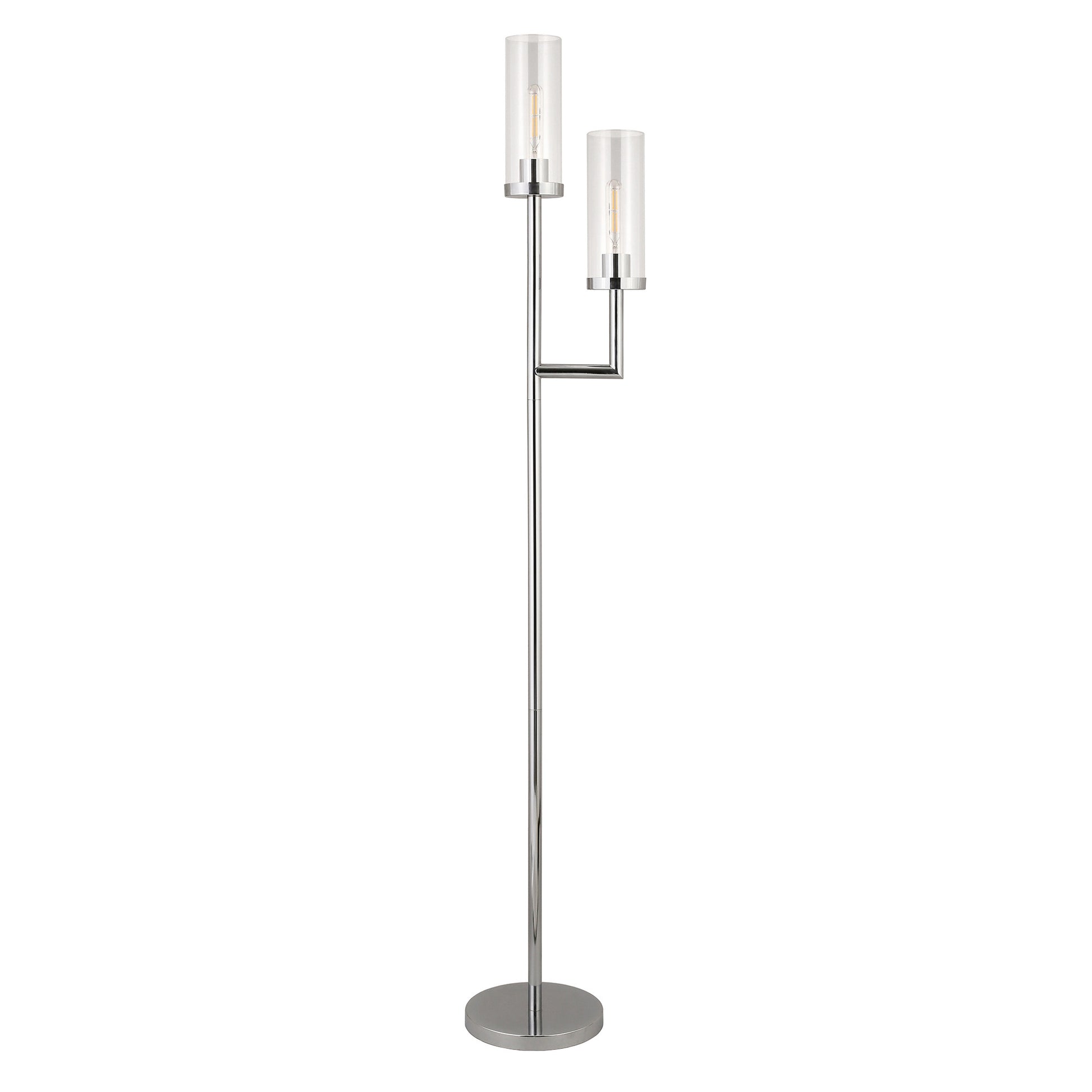 Add a bright anchor to your room with this 69-inch nickel two light torchiere floor lamp with clear transparent glass drum shade. The base of this lamp is made of nickel metal. The lamp light itself is covered by a glass, drum shaped shade, making this a classy piece that will complement most any interior. Add a soft warm glow to your space with this classic torchiere styled lamp. A straight pole extends upwards from a single base while the scooped shade shape refracts light upward and outward much like it's name sake,a torch. High quality design makes this a great lamp for not only lighting, but accenting a room with style. The perfect lamp to create just the right natural and soothing light in your space. 69-inch H x 11-inch W x 11-inch D