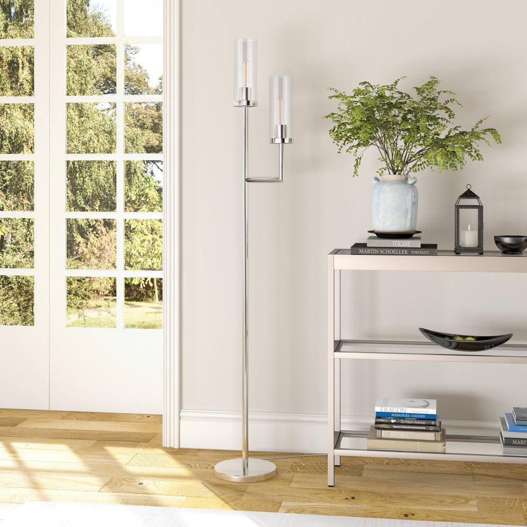 69" Nickel Two Light Torchiere Floor Lamp With Clear Transparent Glass Drum Shade