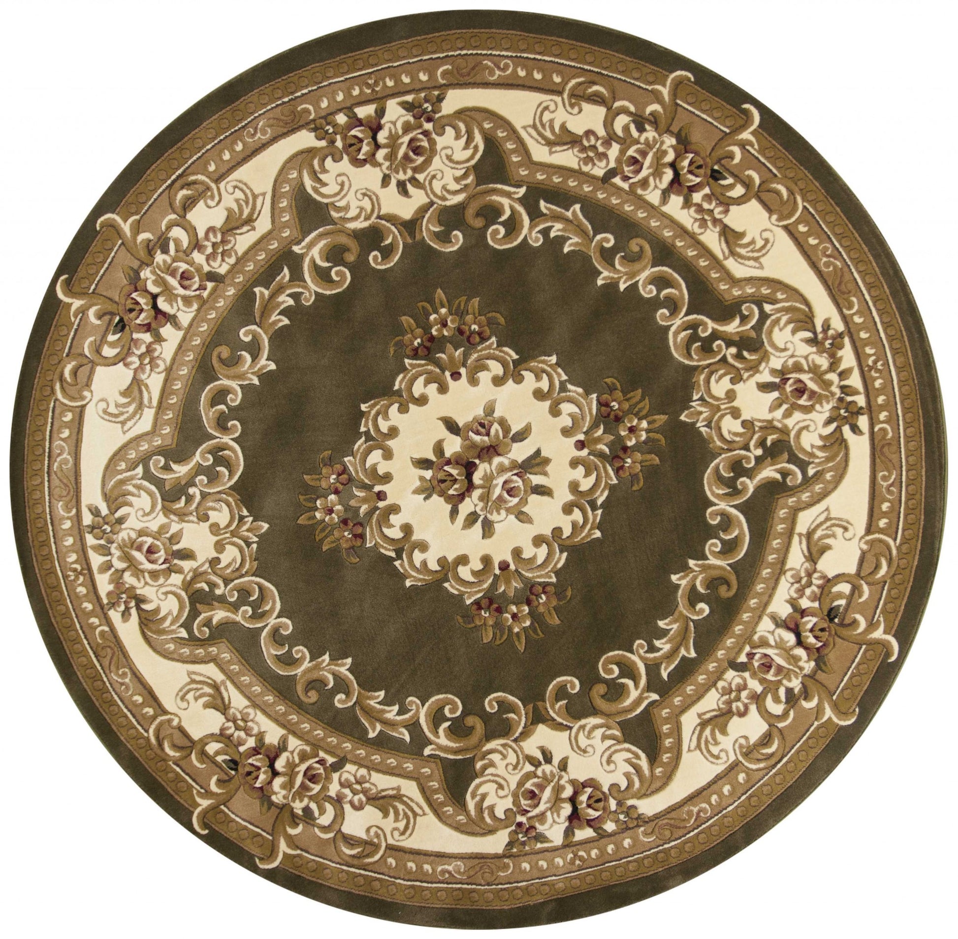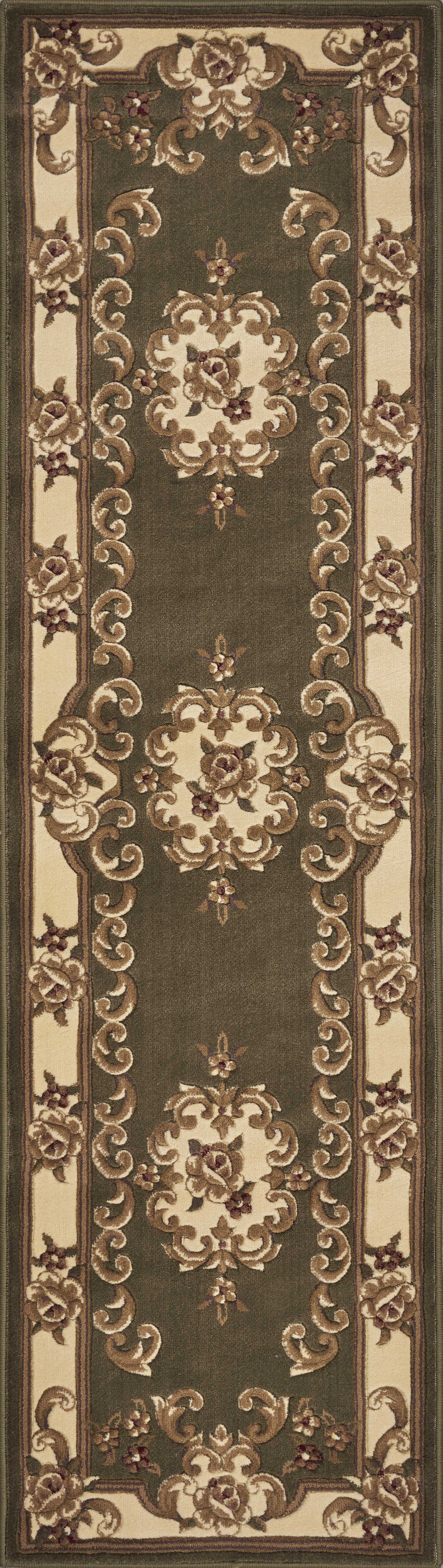 Adorn your home with this bewitching green/ivory aubusson rug, which will turn your floor into art. Its a beguiling piece, which will certainly spruce up the ambiance of your home and get rid of monotony. This rug is a hard wearing piece machine-woven in China of 100% heat-set polypropylene and hand-carved with specific attention to detail. Its beautiful blend of yesterday and today will give an appealing modern feel to the look and feel of your home. As for measurements, they are 1" for height, 63" for width, and 91" for depth. To care for it, vacuum it regularly and spot clean any stains. Its also recommended that you have it professionally cleaned occasionally. If you want a beautiful and useful rug that can fit in well with any interior, this is the one for you. Actual Dimensions: 5'3" x 7'7"