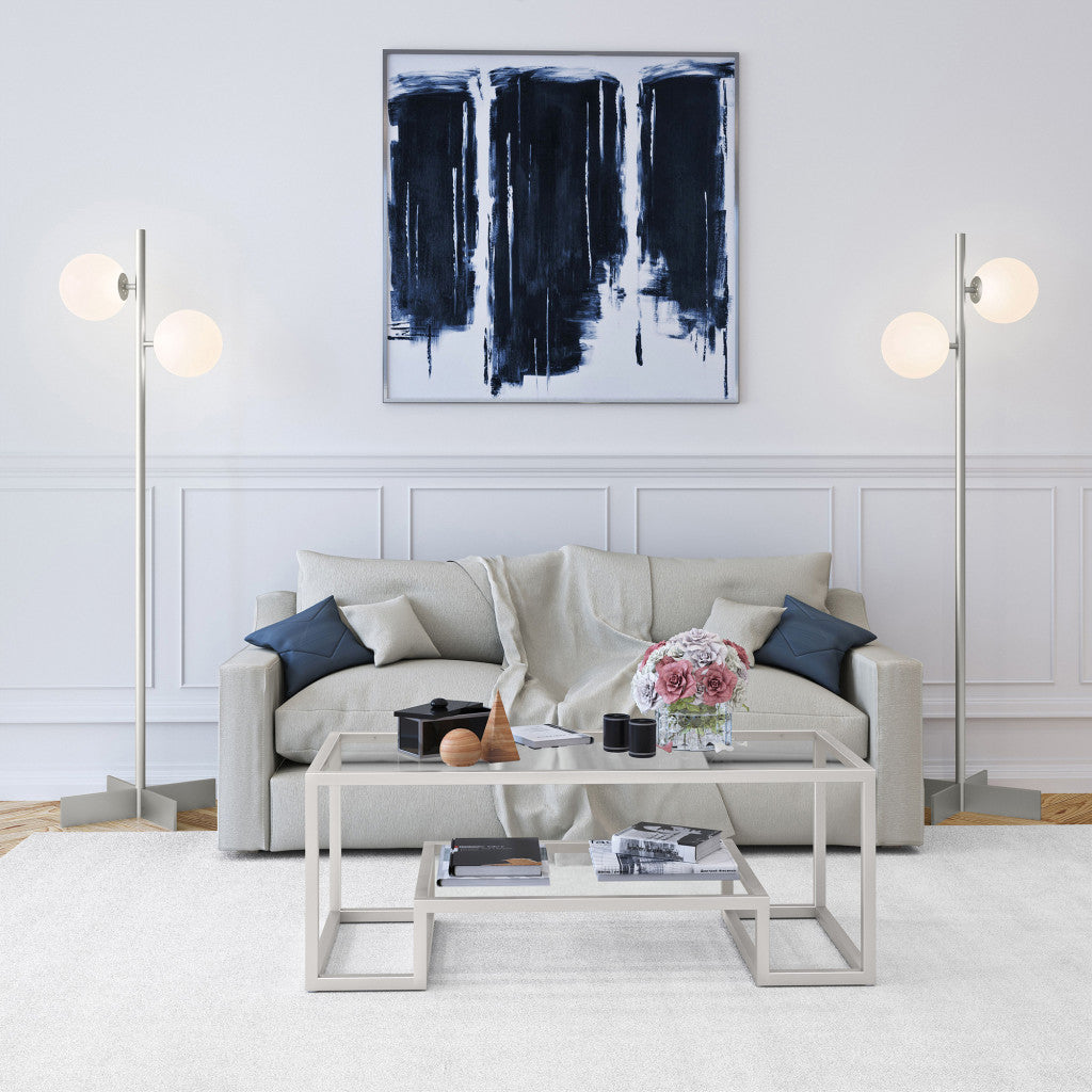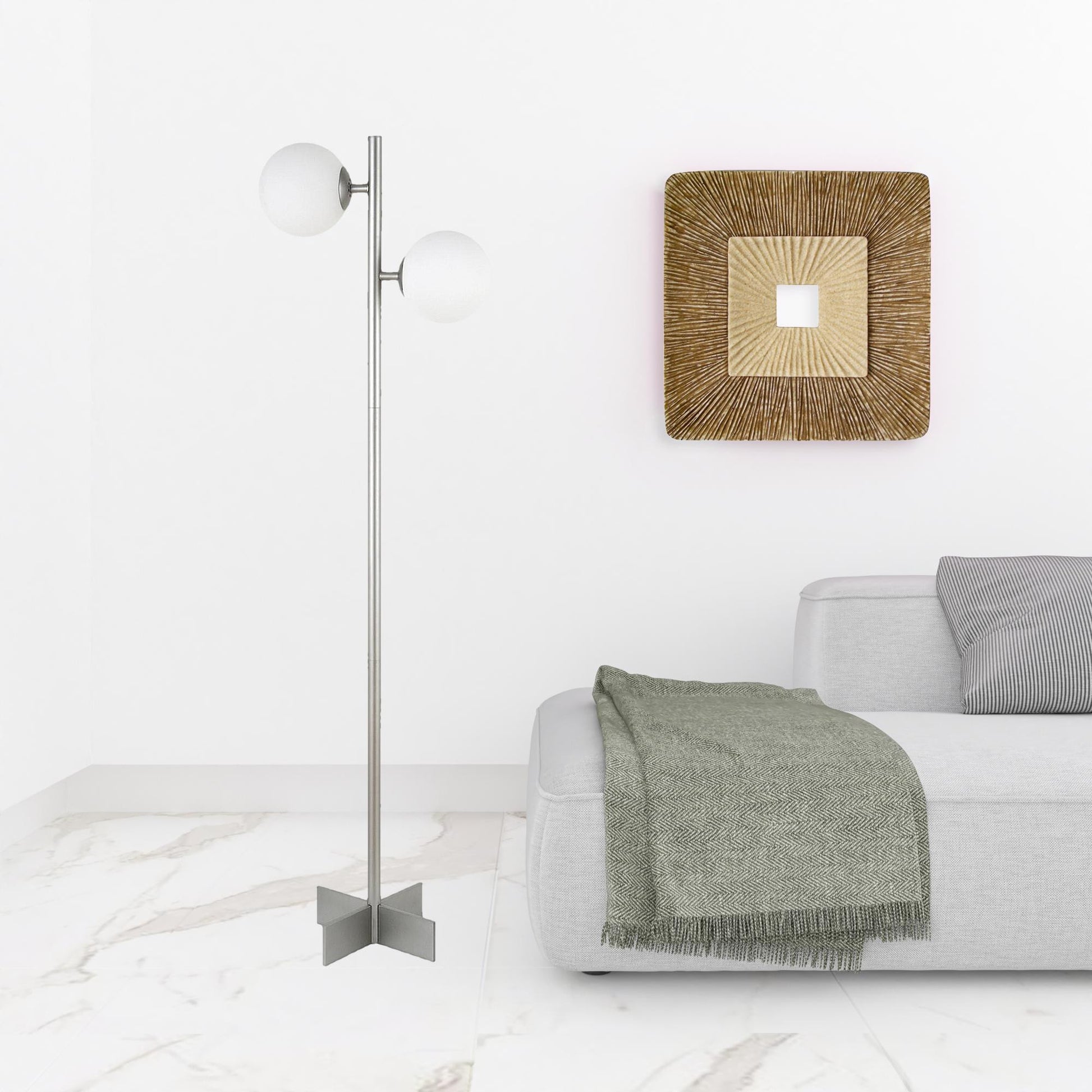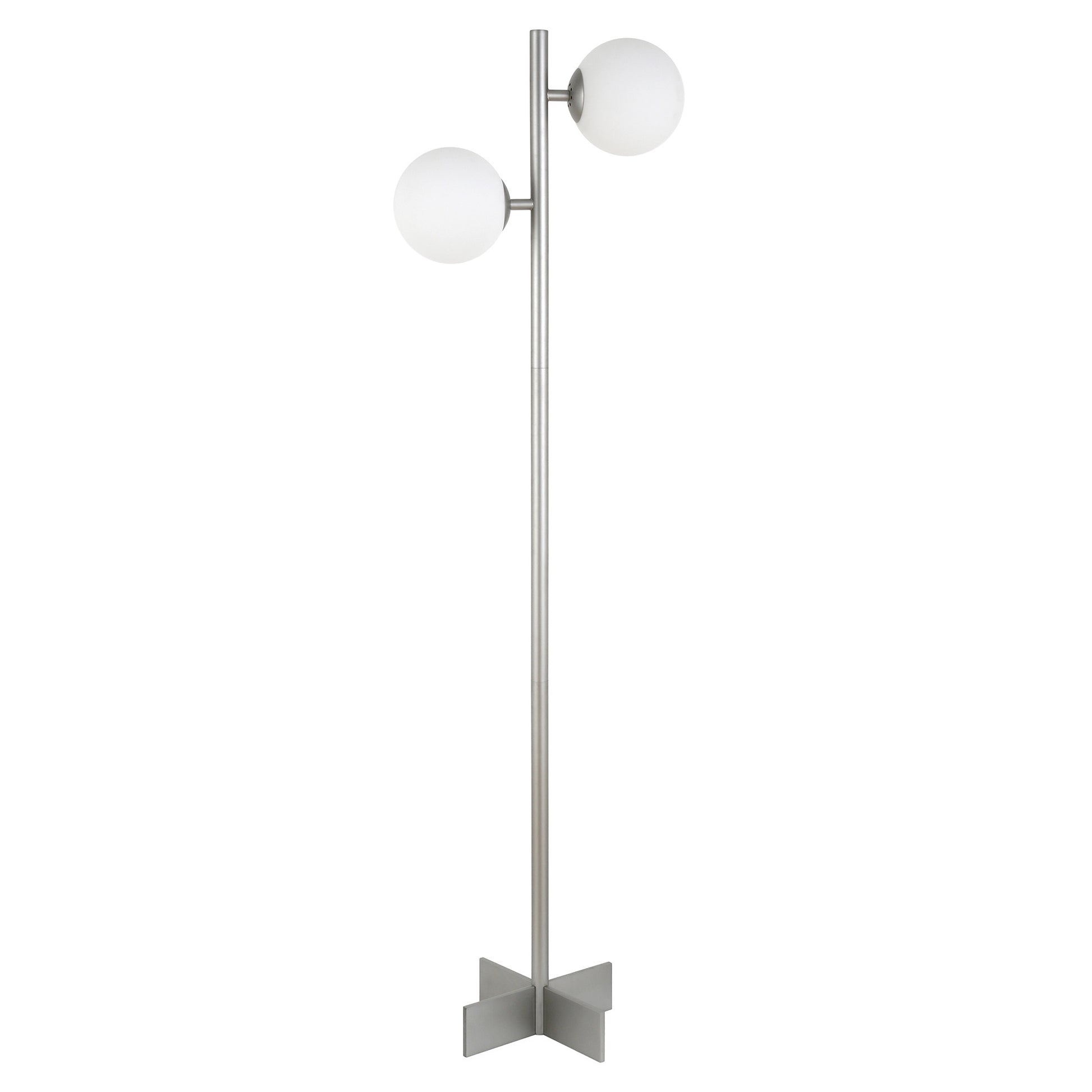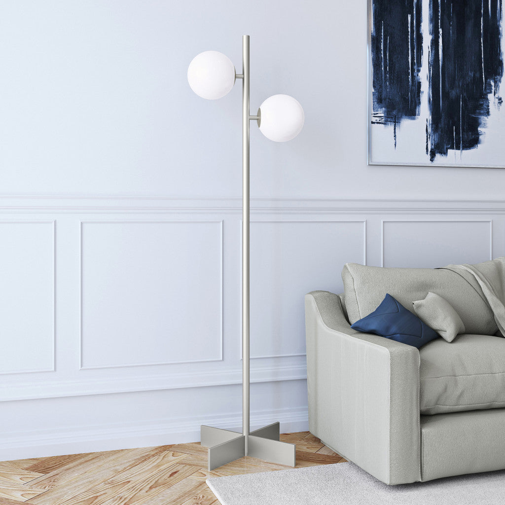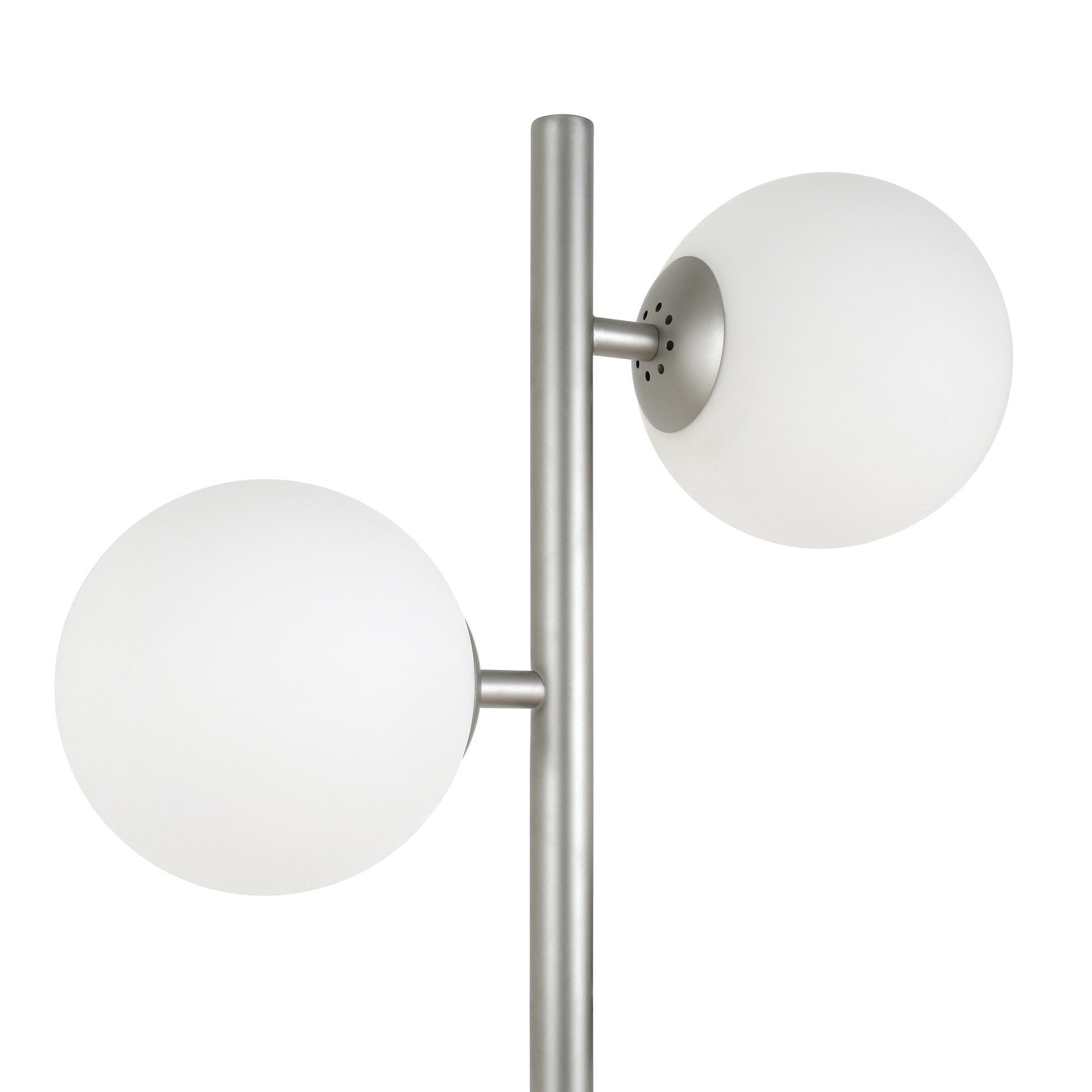 Truly a mix of design and functionality that doesn't compromise on style, this 70" nickel two light tree floor lamp with white frosted glass globe shade will be a great addition to your space. The lamp is made of sturdy metal and features a nickel color. The lamp light itself is covered by a glass, globe shaped shade, making this a classy piece that will complement most any interior. Creative and cool, this tree shaped lamp features a straight pole that branches out into multiple arms to maximize the light in your space. High quality design makes this a great lamp for not only lighting, but accenting a room with style. It is perfect for virtually any decor. 70" H x 14" W x 14" D
