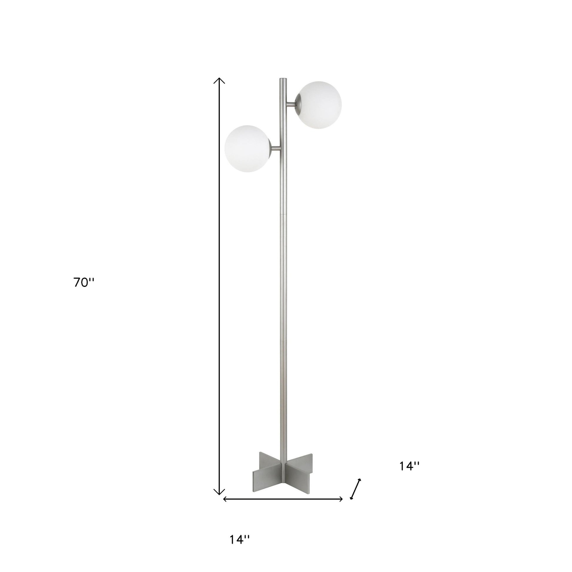 70" Nickel Two Light Tree Floor Lamp With White Frosted Glass Globe Shade