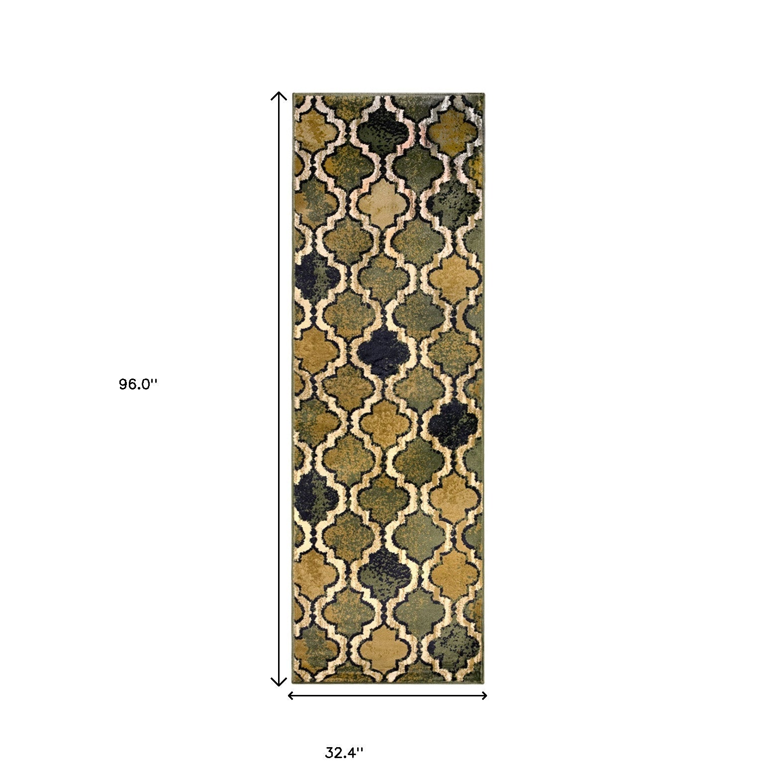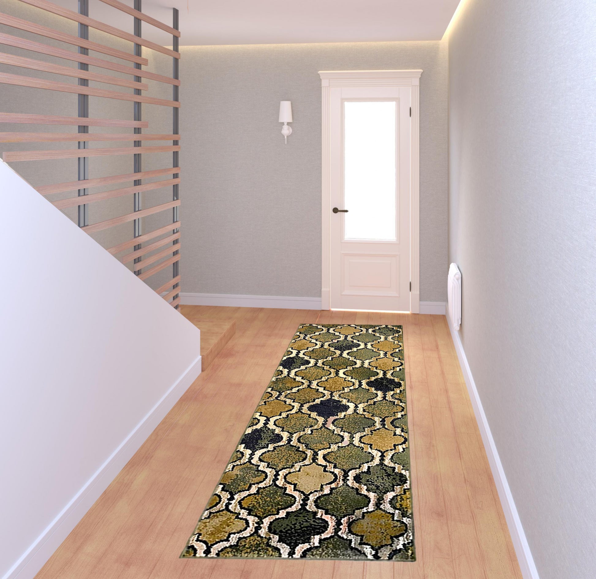 8' Green Quatrefoil Power Loom Distressed Stain Resistant Runner Rug