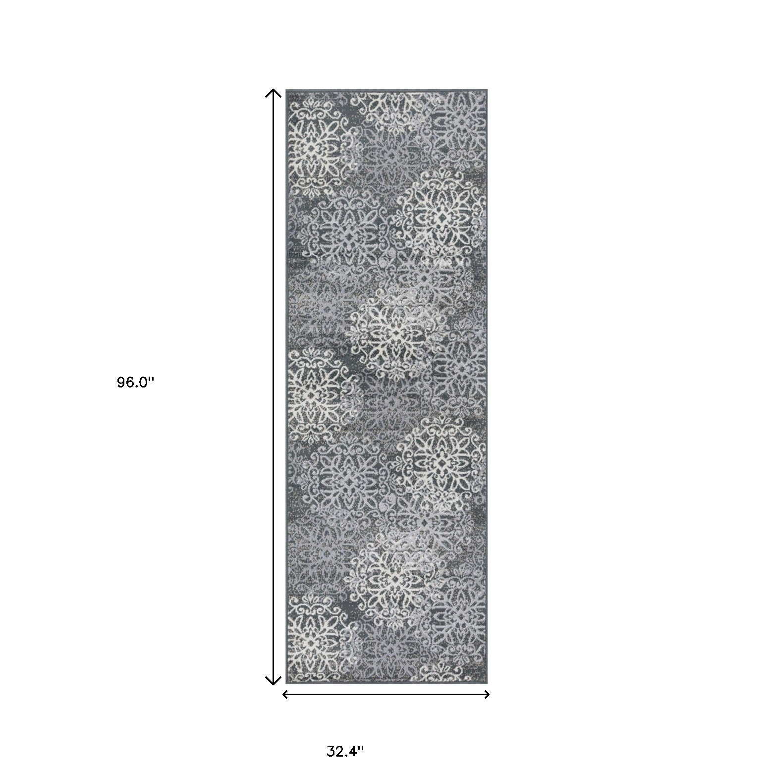 8' Slate And Gray Medallion Power Loom Stain Resistant Runner Rug