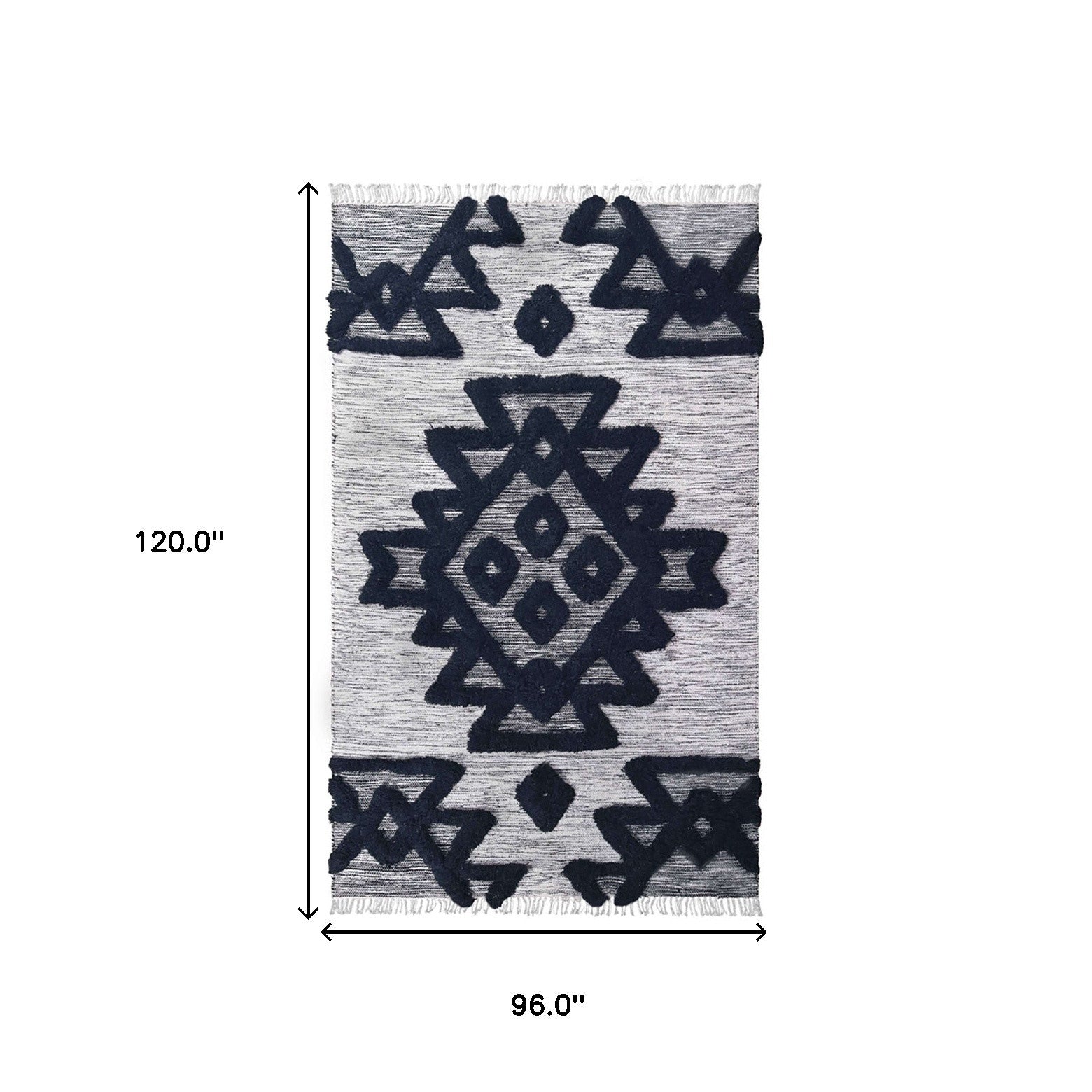 8' X 10' Black And Ivory Wool Geometric Power Loom Stain Resistant Area Rug With Fringe