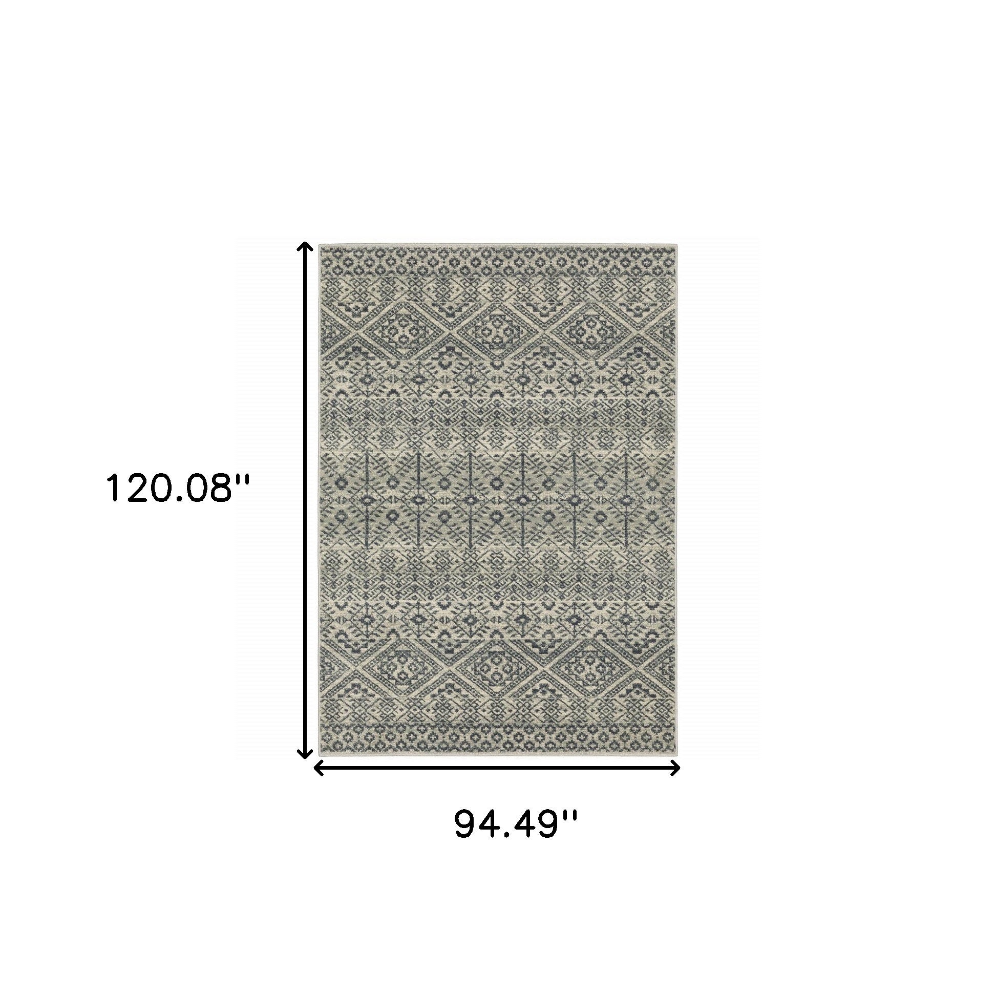 Set an inviting tone in your space with this 8' x 10' blue and beige geometric power loom stain resistant area rug. This rectangle shaped rug features a geometric design in blue and beige to give it visual interest. A classic shape marries with good looking design for your space Ideal for spaces with kids and pets, this rug is stain resistant to help repel stains and spilled liquids. Area Rugs help to give warmth and sense of home to your space. 0.39" H x 94.49" W x 120.08" D